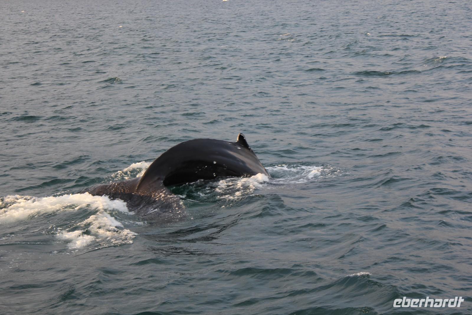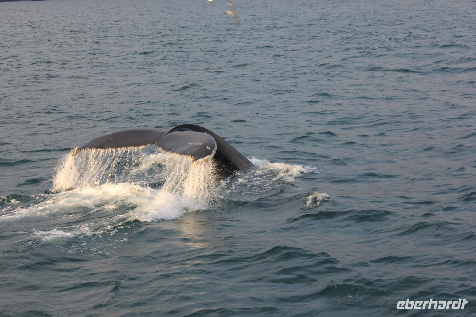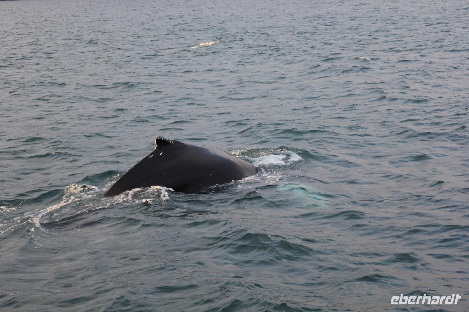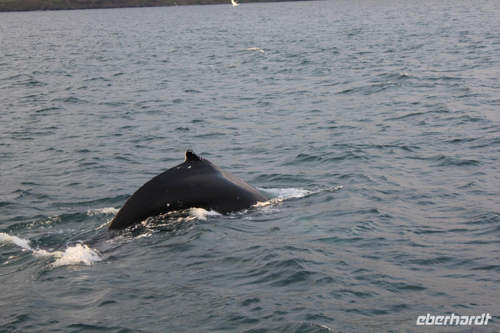 Das Buffet ist reichhaltig und köstlich. Es gibt verschiedenen Fisch, Salate, Lamm, Gemüse und Reis sowie ein reichhaltiges Dessertangebot. Einige von uns genießen anschließend einen Spaziergang durch den wunderbaren Botanischen Garten neben dem Hotel. Andere nutzen nach dem Abendessen die Gelegenheit an einer - aufgrund der Nachfrage - spontan organisierten Walbeobachtungstour in Dalvík teilzunehmen. Wir werden mit 2 Kleinbussen abgeholt und in den 35 Minuten entfernt gelegenen Fischerort gebracht. Dort steigen wir auf ein Boot um und es dauert nicht lange bis wir die wundervollen Tiere sehen und diese uns mit ihren „Kunststücken“ und „Flossentänzen“ erfreuen. Wir wärmen uns mit heißem Kakao und Keksen, genießen die wundervolle Landschaft vom Boot aus und lassen die gewonnenen Eindrücke während der Rückfahrt zum Hotel auf uns wirken bevor wir glücklich und zufrieden ins Bett fallen.