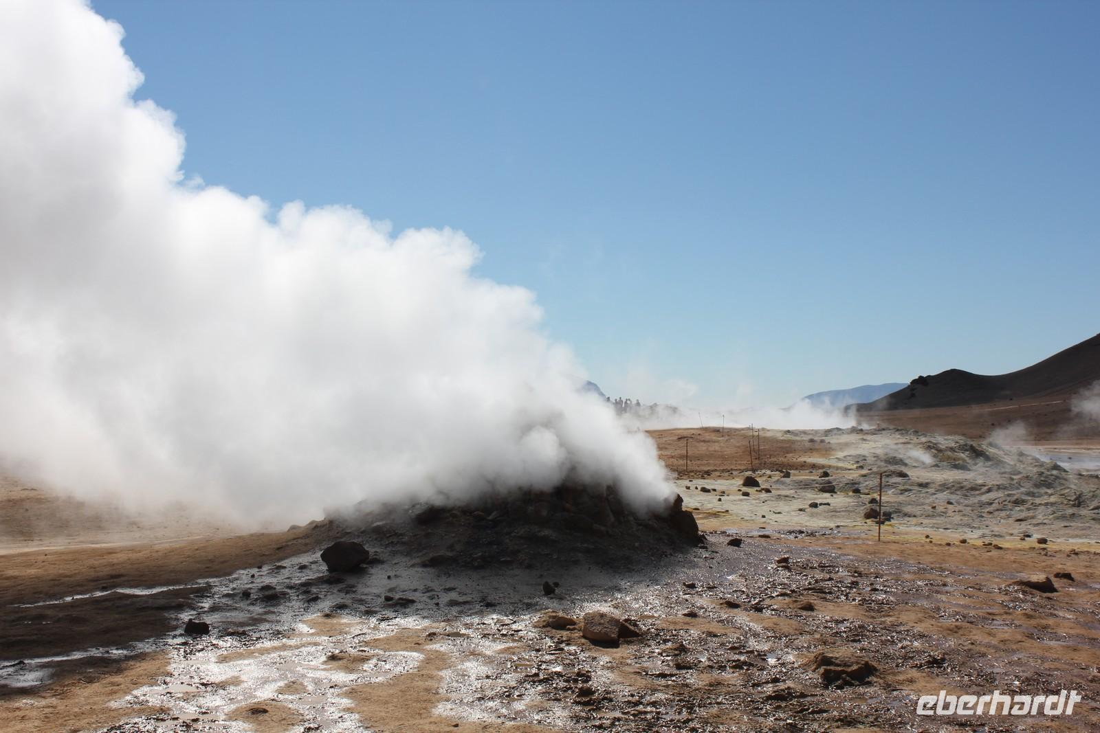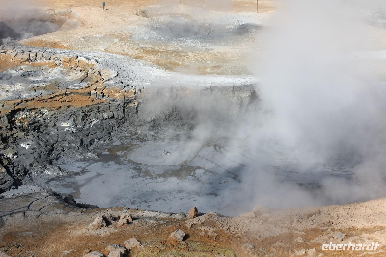 Weiter geht unsere Fahrt zum Námafjall, einen aktiven Vulkan, umgangssprachlich auch als „Hexenküche“ oder „Teufelsküche“ bekannt. Der Begriff „Schwefelküche“ passt auch ganz gut denn wir sind von dem Geruch von Schwefel umgeben, der mit dem Dampf durch das Aufsteigen von schwefelwasserstoffhaltigen Gasen kommt. Der Námafjall liegt in einem Hochtemperaturgebiet mit Dampf- und Schlammquellen. Wir erfahren, dass bei 100 Meter Tiefe die Temperatur über 200 Grad Celcius beträgt. Aus den heißen Quellen entstehen erhebliche Schwefelablagerungen. In früheren Jahrhunderten wurden in Island umfangreiche Schwefelminen zur Herstellung von Schießpulver ausgebeutet.