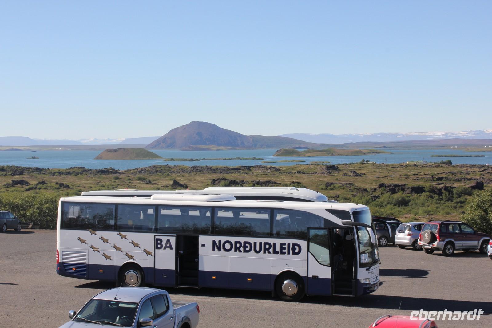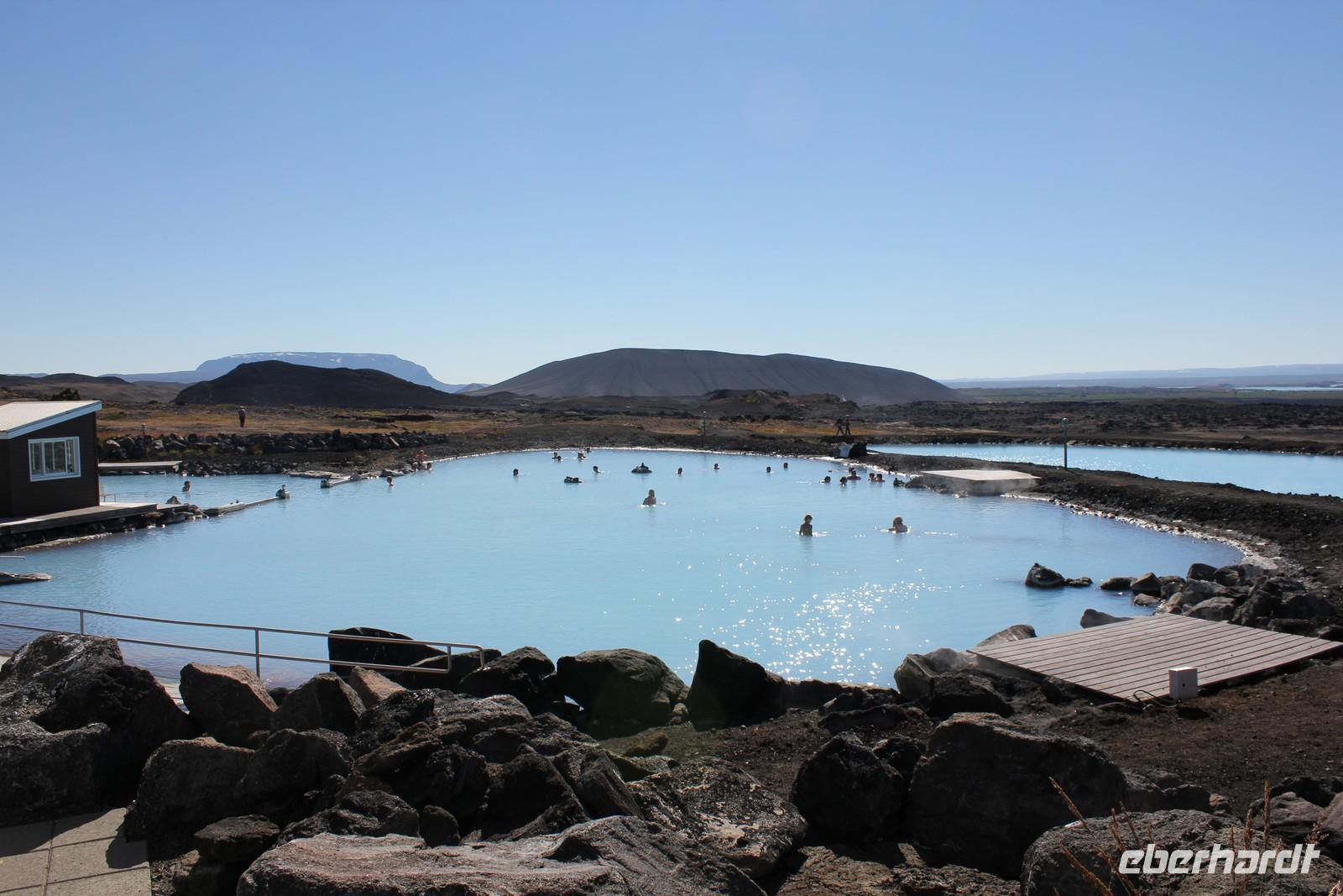 Als nächstes halten wir an einem Aussichtspunkt mit Blick auf den 2500 Jahre alten, berühmten Ringkrater, welcher in jedem Buch für Geologie abgebildet ist, bevor wir die Möglichkeit nutzen, ein ausgiebiges Bad in den heißen Quellen von Jarðböðin zu nehmen.