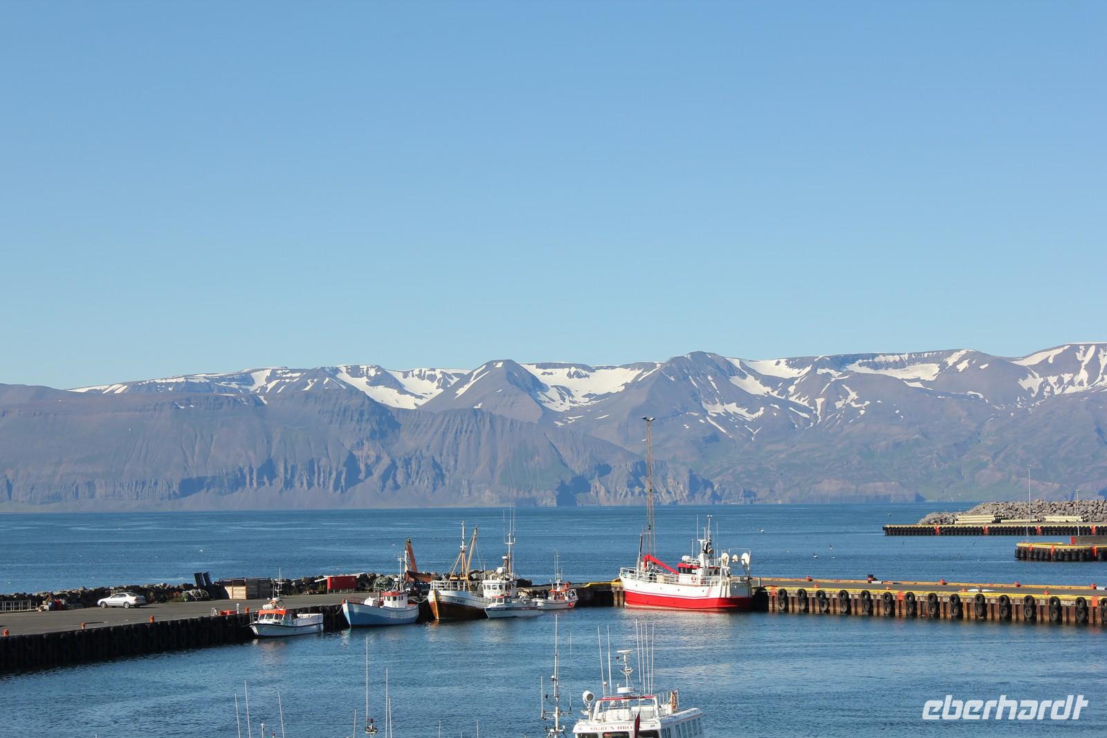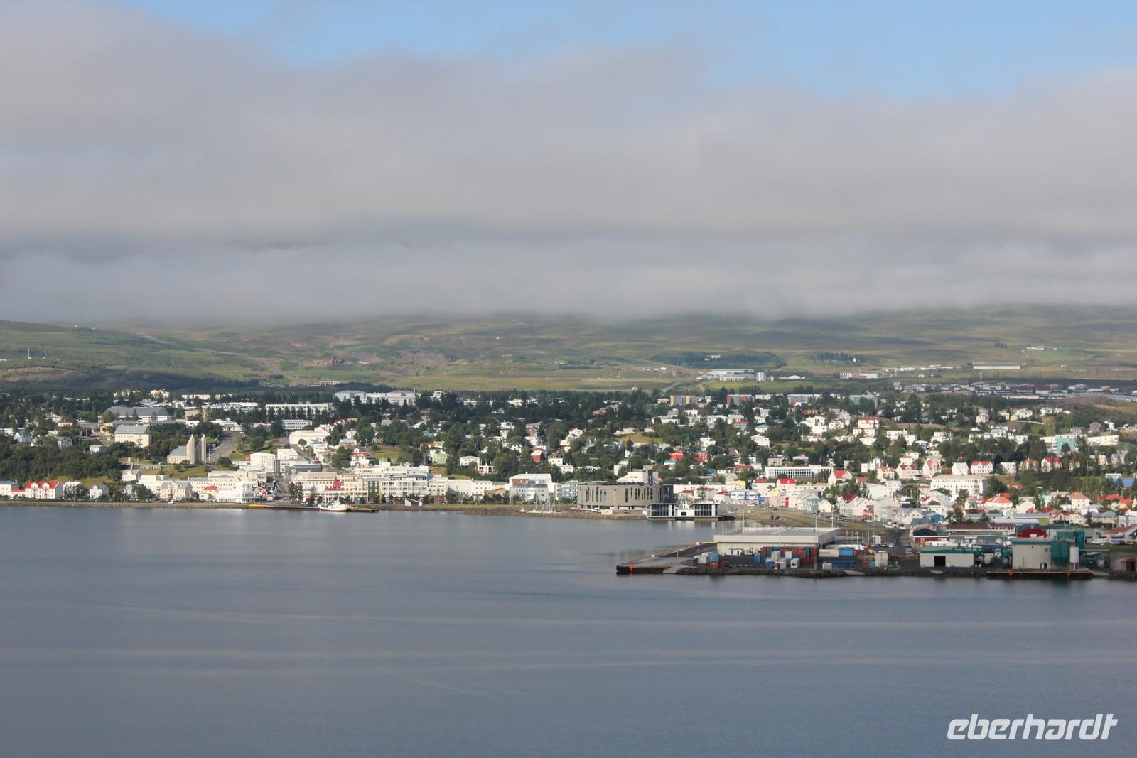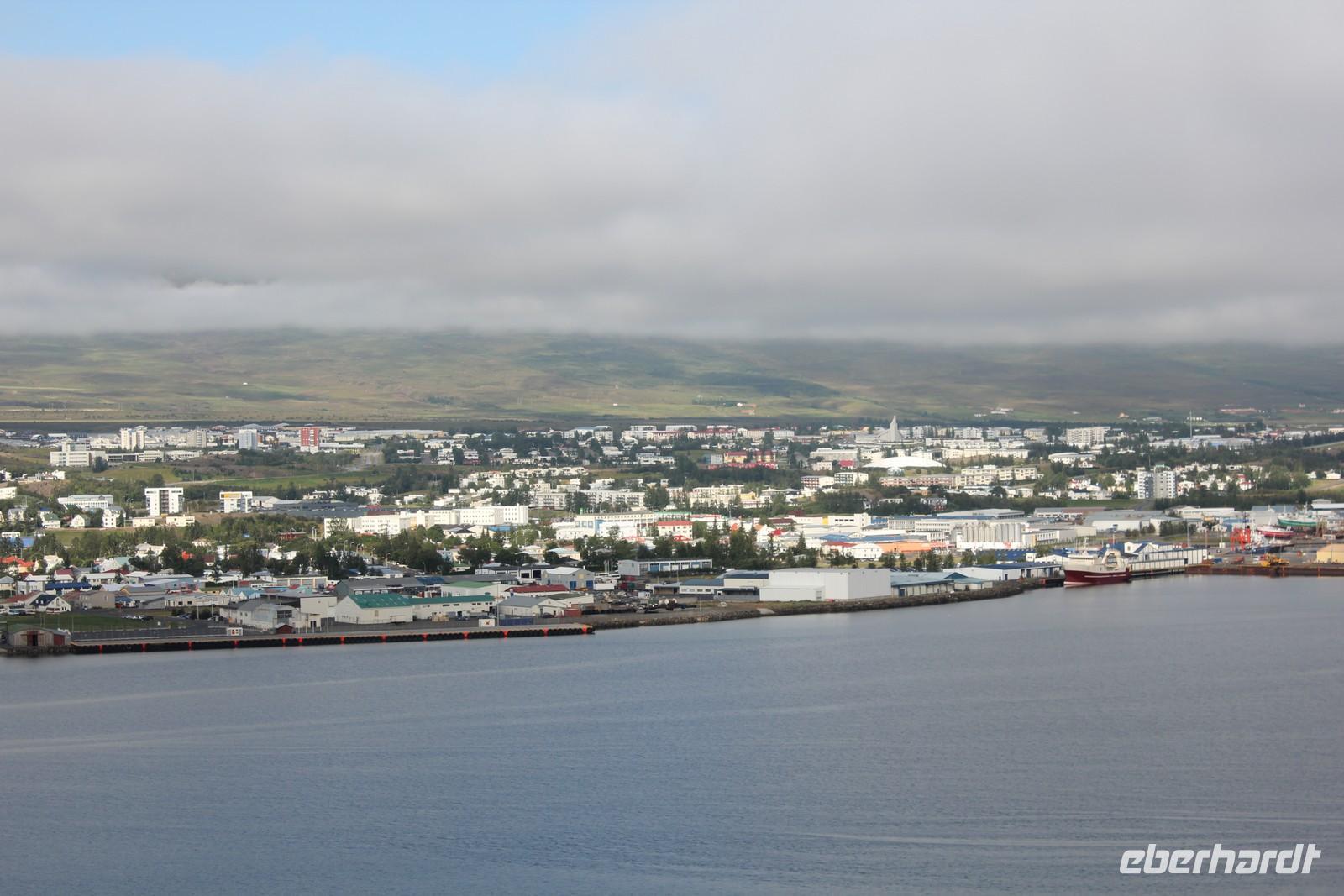 Wir machen Halt auf einer Erhebung mit Blick auf Akureyri, fahren anschließend weiter in das malerische Fischerdörfchen Húsavík und nutzen die Zeit für einen kleinen Bummel.