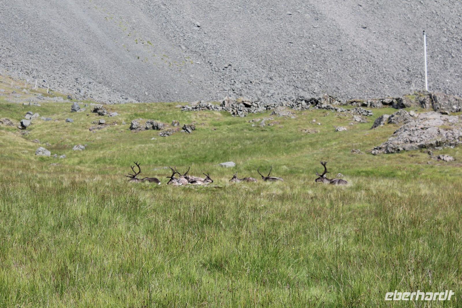 Anschließend unternehmen wir entlang des Schwanenfjords eine kleine Wanderung und bestaunen die zahlreichen Schwäne. Nicht viel später wartet ein weiteres Highlight ganz unverhofft auf uns - wir entdecken Elche. Und das in Island! Wir können es kaum glauben. Leider scheinen auch die Elche gerade Mittagspause zu haben, denn sie tun uns nicht den Gefallen, sich in voller Pracht zu zeigen und so begnügen wir uns mit der „liegenden Version“ - auch diese ergibt wunderbare Fotos.