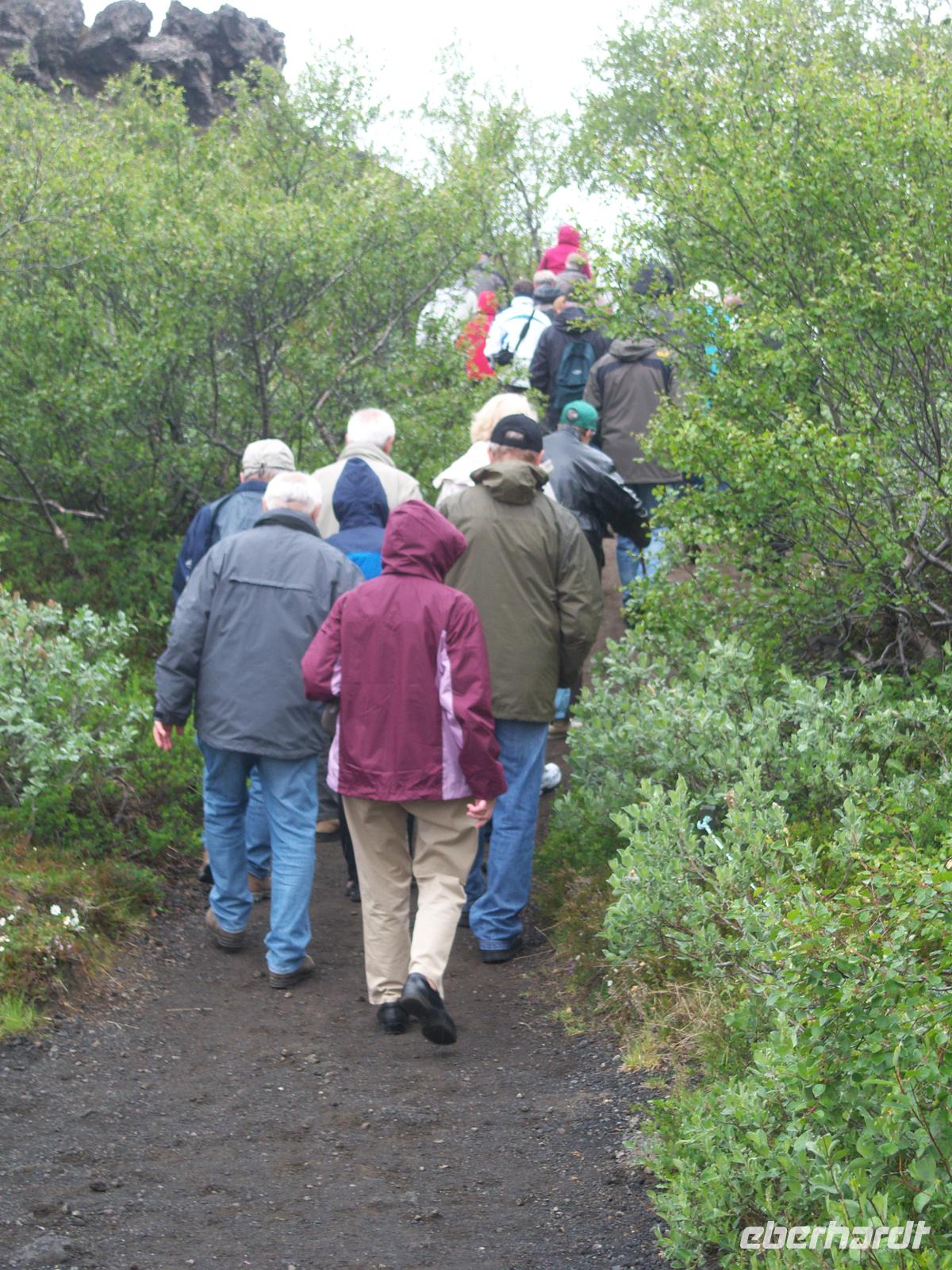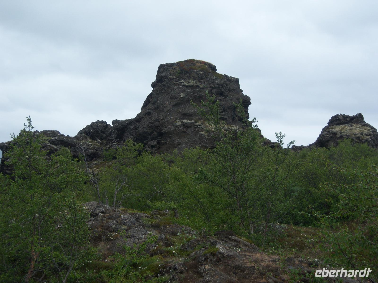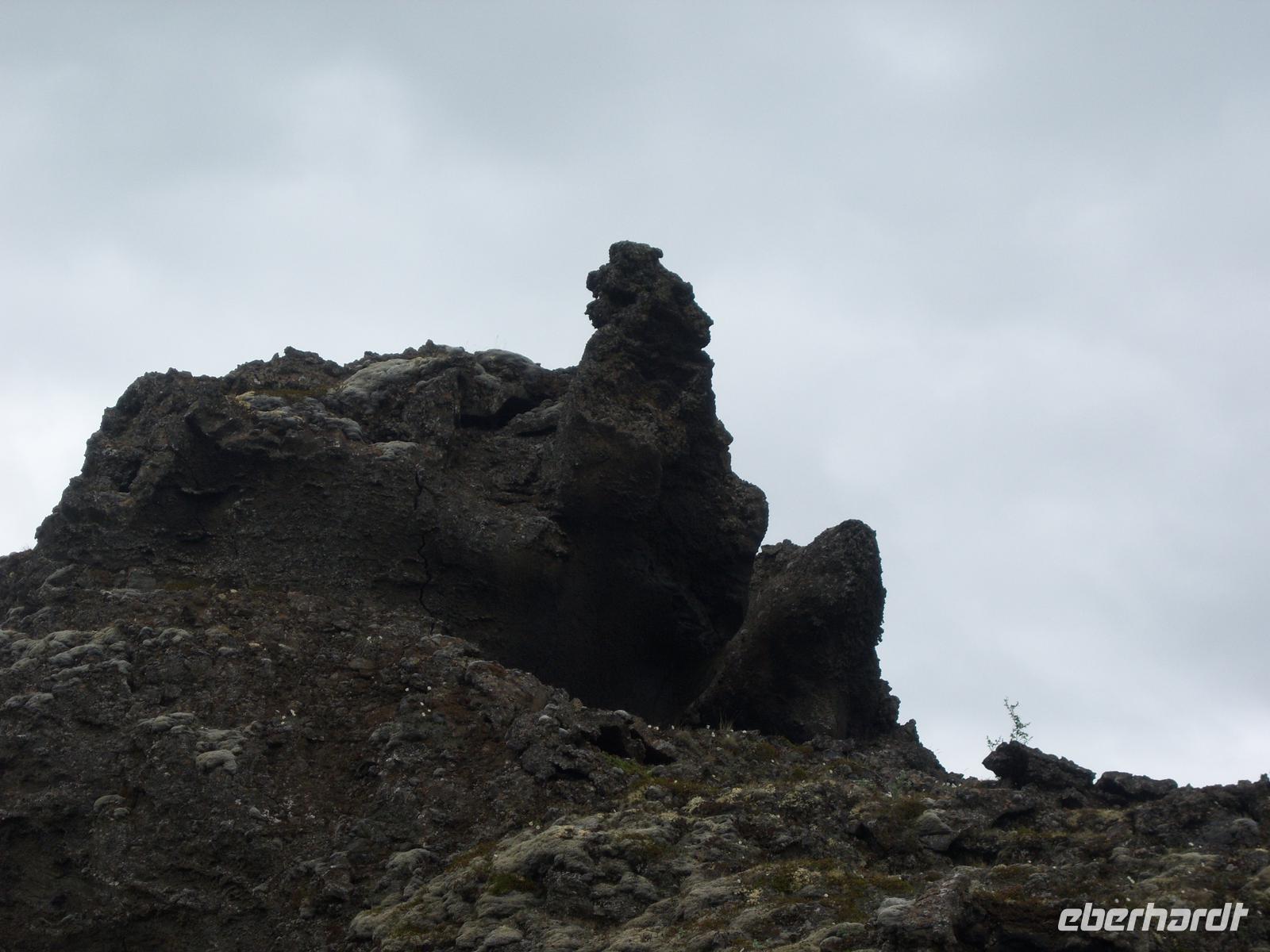 Wir fuhren weiter zu den "dunklen Burgen" in das Lavalabyrinth Dimmuborgir. Nur rund einen Quadratkilometer ist dieses Areal groß und doch voll von den bizarresten Lavaformationen. Wir sahen Türme, Brücken Höhlen und Überhänge. Viele erinnern an versteinerte Trolle. Gemeinsam malten wir uns aus, was die riesigen Felsen darstellen könnten und ließen unserer Fantasie freien Lauf.