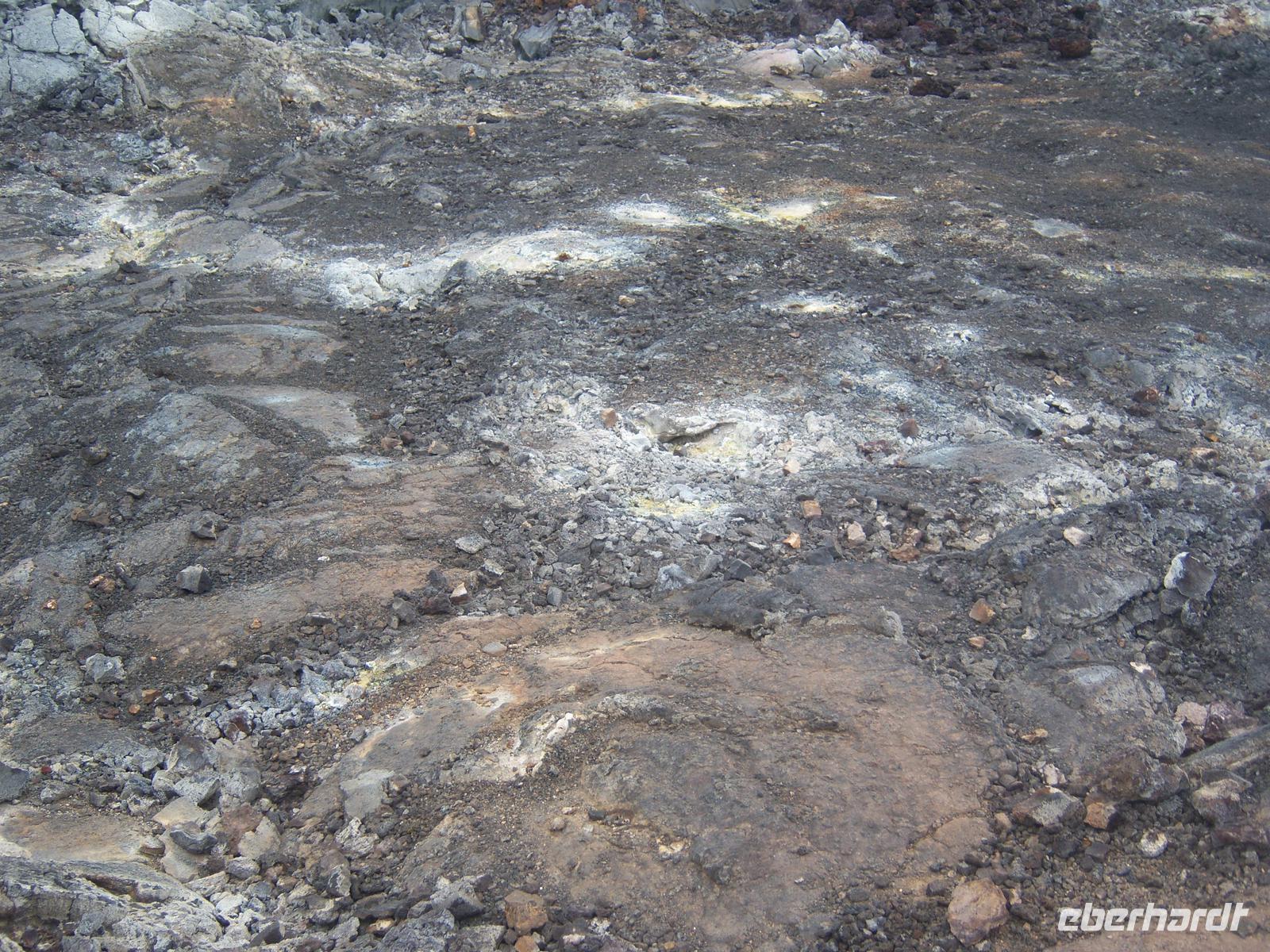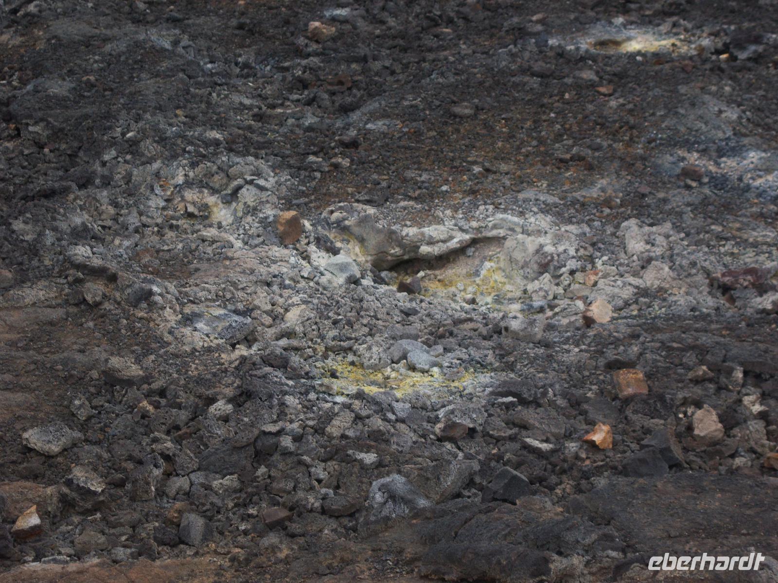 Unser Tag sollte dann mit einem ganz besonderen Erlebnis enden. Nach der Bildung des Vitikraters öffnete sich die westlich gelegene Leirhnjúkurspalte und beförderte riesige Magmamengen. Vom Parkplatz aus wanderten wir rund eine Stunde über das düster - dampfende Lavafeld bis ganz nach oben zum aktiven Vulkankrater. Eine einzigartige Kulisse baute sich vor unseren Augen auf!