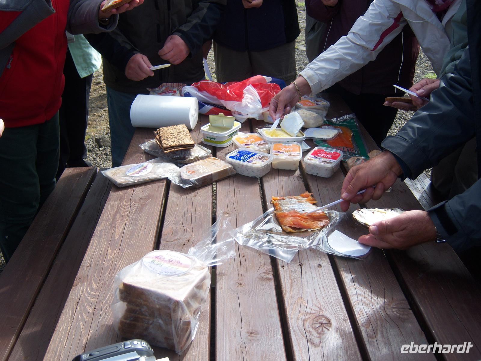 In einem Supermarkt in der Nähe kauften Rósa und ich heimlich ein paar Spezialitäten zum Probieren für unsere Gäste ein. Aber ich glaube, einige hatten unser Spiel schnell durchschaut. An einem Aussichtspunkt mit einer grandiosen Aussicht auf die bizarre Landschaft mit ihren schroffen Bergen verspeisten wir die leckere Kost. Es gab isländisches Brot, Lachssalat und viele andere Leckereien. Die Auflockerung nach der langen Busfahrt war bei allen deutlich zu spüren.