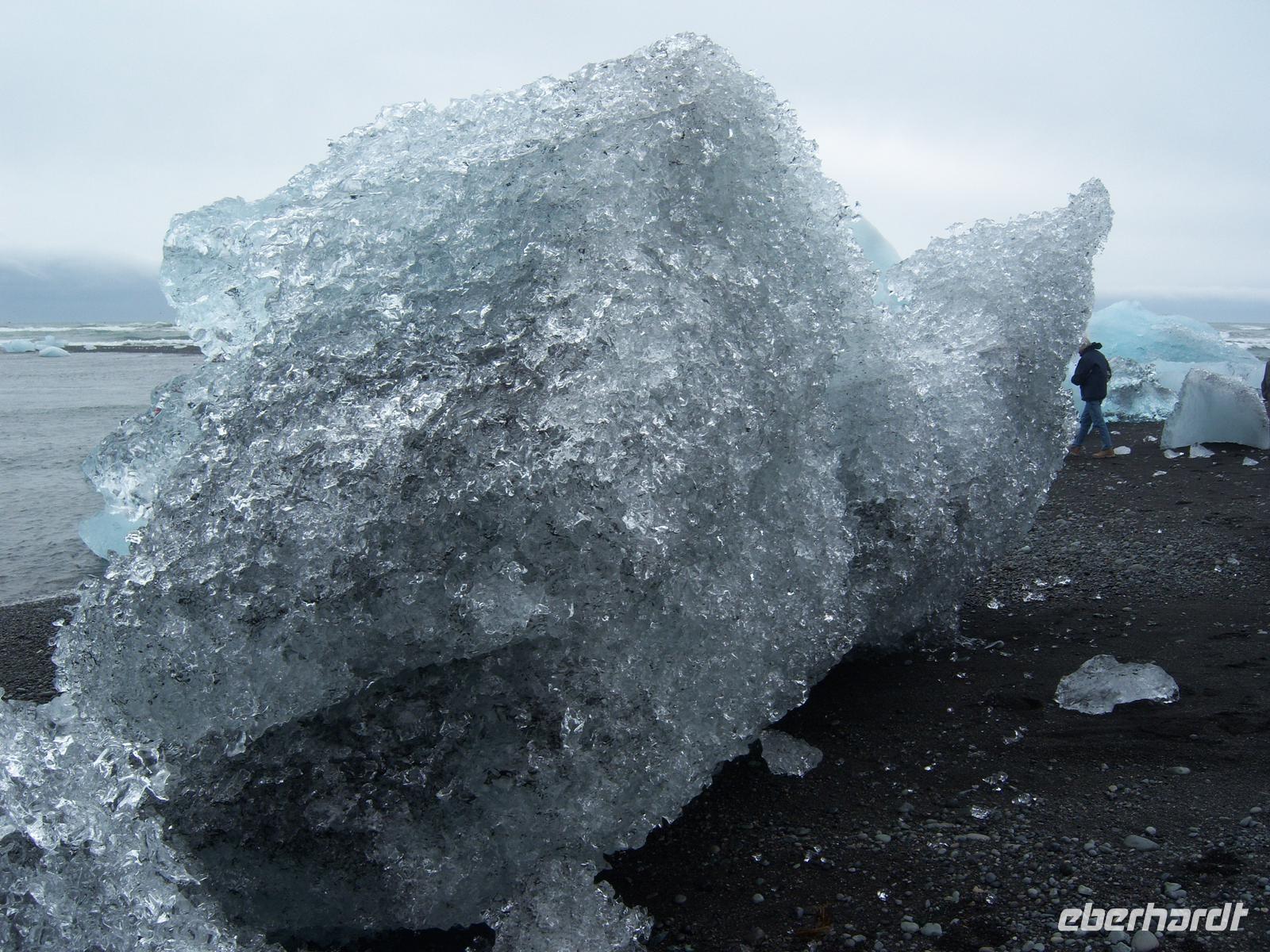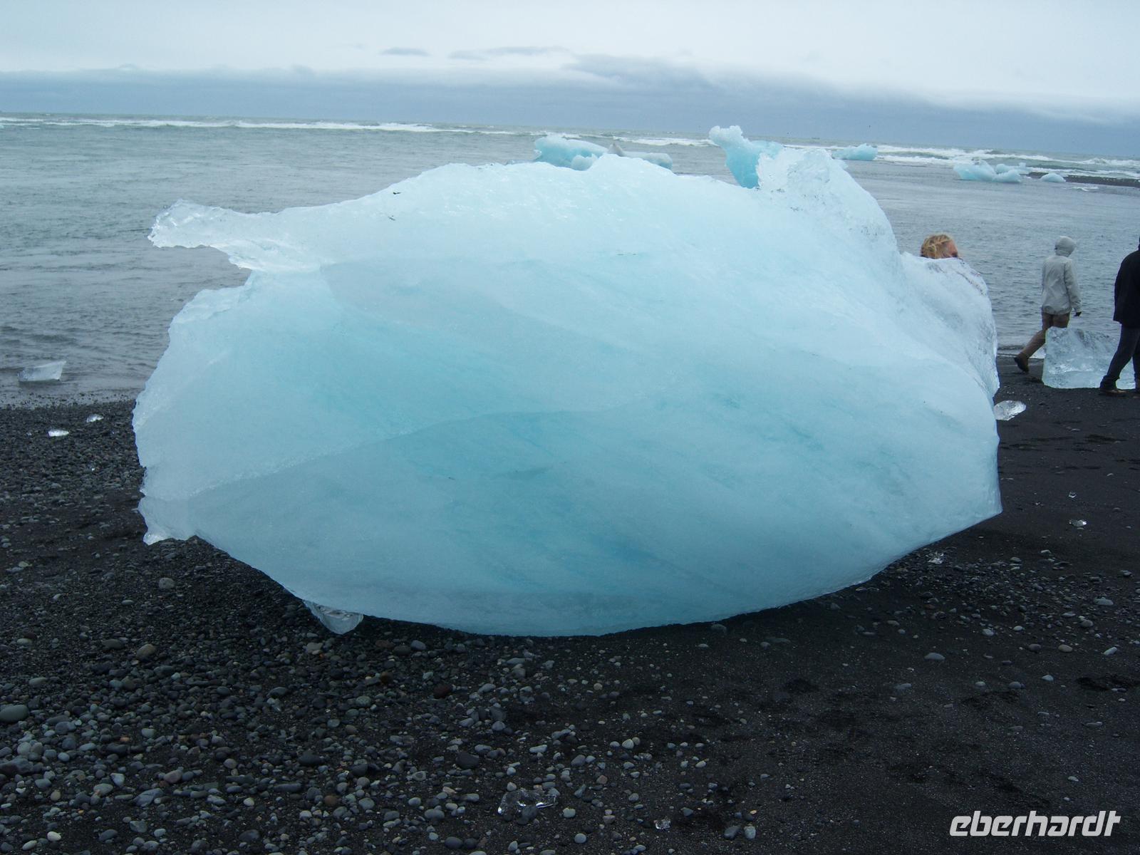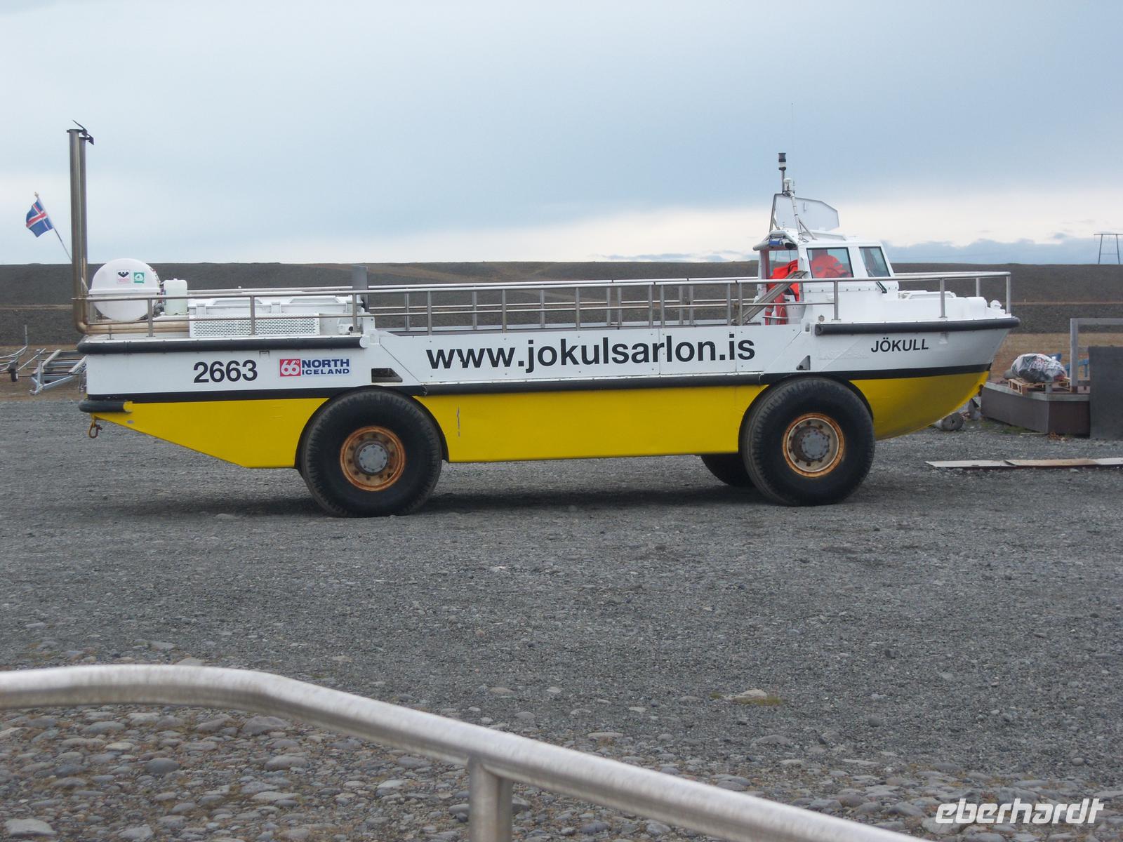 Die zahlreichen Ausläufer des Vatnajökull begleiteten uns noch ein Stück bis wir die faszinierende Gletscherlagune erreichten. Schon von Weitem staunten wir über die mächtigen Eisberge, die sich vom Gletscher getrennt haben. Kurze Zeit später war es dann endlich soweit : Wir bestiegen unser Amphibienfahrzeug und wurden ausgerüstet mit Schwimmwesten. Während unserer Fahrt erfuhren wir nicht nur viel Wissenswertes über die Lagune sondern hatten auch die Möglichkeit echtes Gletschereis anzufassen und zu probieren! Am Ende unserer Fahrt hielten wir noch etwas ganz Besonderes für unsere Eberhardt - Reisegäste bereit! Wir probierten alle den isländischen "Brennevín", den "Schwarzen Tod" unter den Schnäpsen. Natürlich durfte das Gletschereis der Lagune sowie ein frischer Orangensaft und Trockenfisch zum Probieren nicht fehlen!