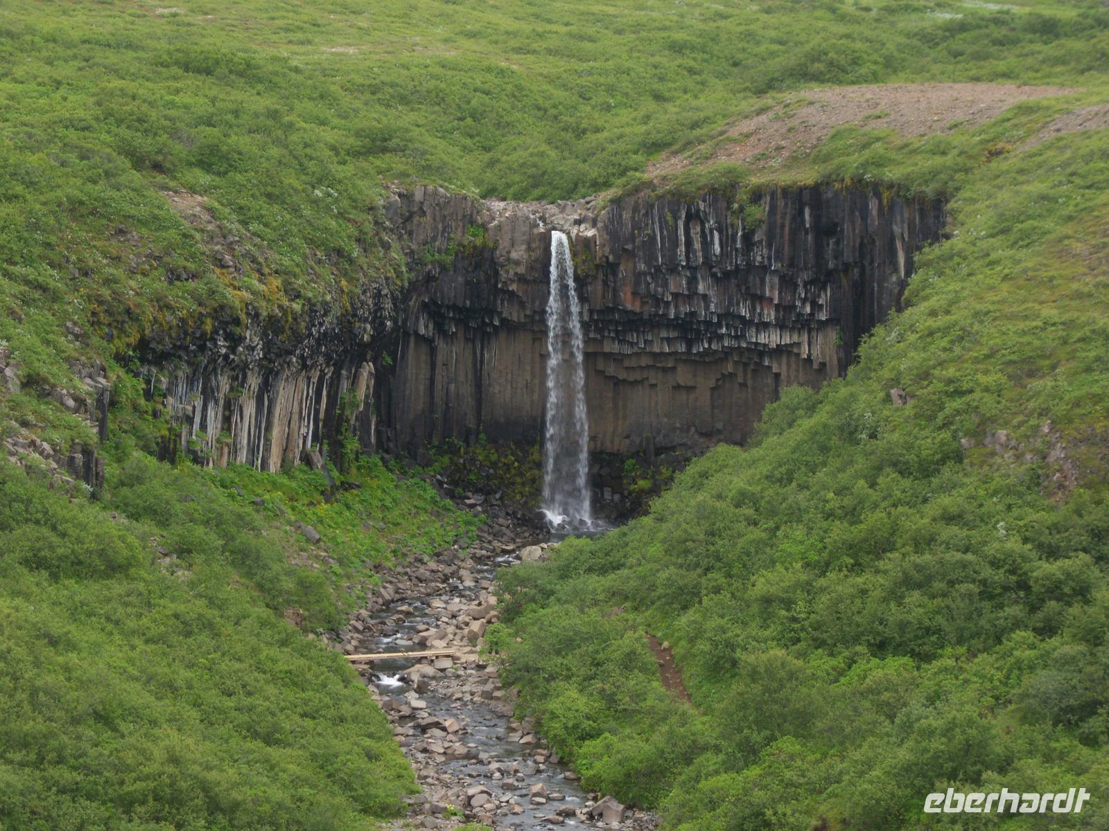 Vom Zeltplatz aus wanderten wir zunächst aufwärts durch ein idyllisches Moorbirkenwäldchen. Kurze Zeit später, nach etwa 45 Minuten Fußmarsch erreichten wir den Wasserfall Svartifoss, dessen Wasser über schwarze Basaltsäulen, die an Orgelpfeiffen erinnern, gut 10 Meter in die Tiefe stürzt. Oben angekommen schlugen wir wieder denselben Weg zurück ein. Kontrastreich ging unsere Reise weiter durch die Sand - und Lavawüste, vorbei an Kirjubaejarklaustur bis nach Vík zu unserem Hotel "Edda". Nach einem schmackhaften Abendessen zeigte uns Rósa noch einen Film über die Vulkanausbrüche auf den Westmänner Inseln und dem Vatnajökull 1996.