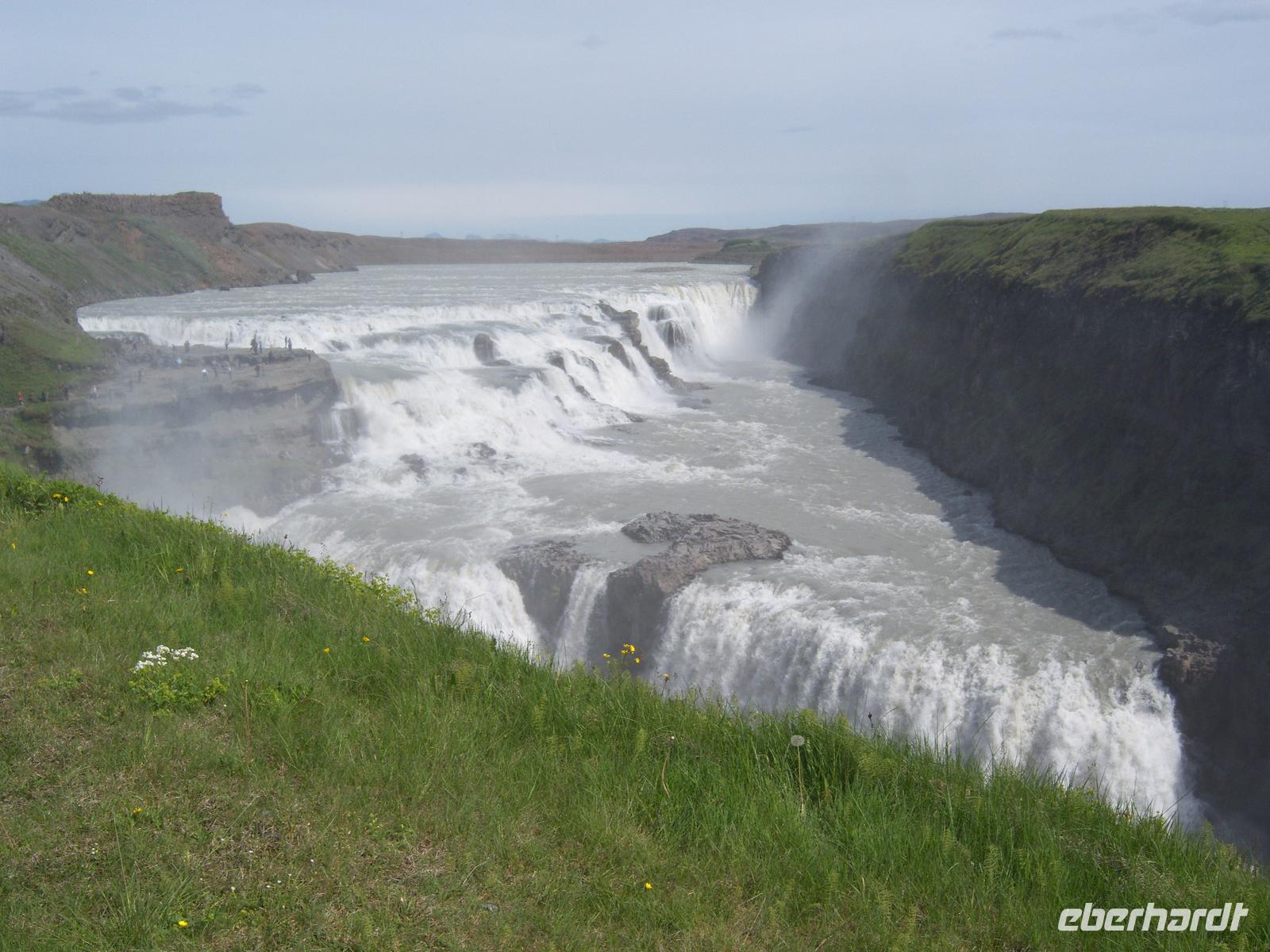 Nach einer Legende nach, soll hinter dem Wasserfall eine Schatztruhe mit Gold vergraben sein. Leider haben wir sie nicht gefunden :-). Wir fuhren weiter auf dem "Goldenen Kreis" zum Gullfoss - der "Goldene Wasserfall". Über zwei gegeneinander versetzte Fallstufen stürzen die Wassermassen in die bis zu 70 Meter tiefe Klamm Gullfosssgljúfur.