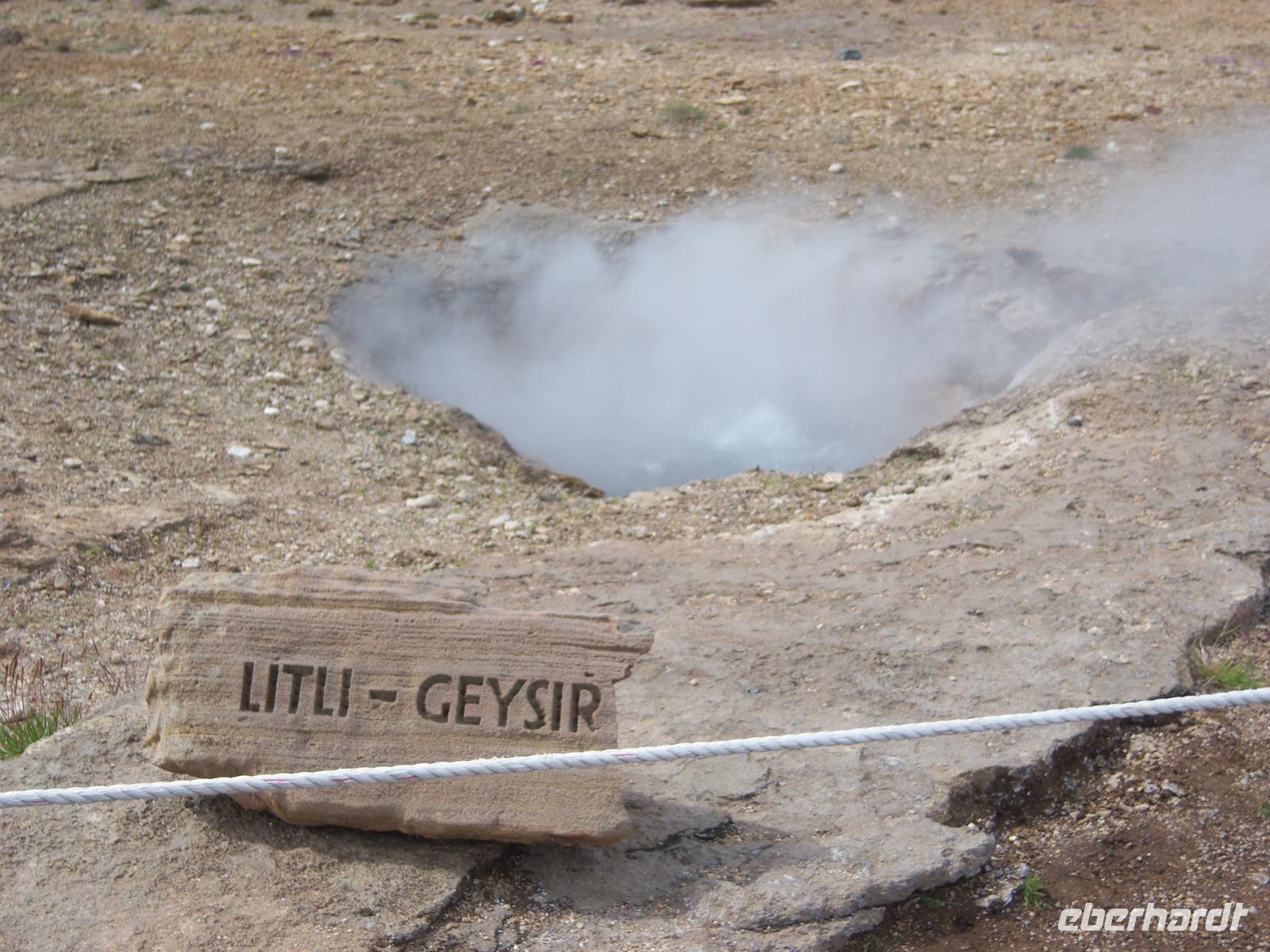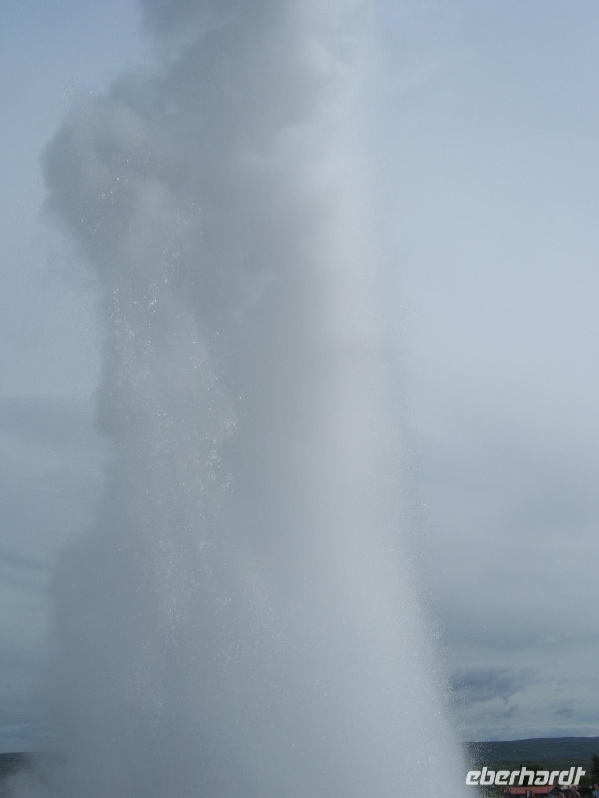 Nach einer ausgiebigen Mittagspause erblickten wir schon von Weitem Islands bekanntestes Geothermalgebiet, meist nur mit dem Namen seiner bekanntesten Quelle benannt, Geysir. Erruht zwar, aber sein kleiner Bruder Strokkur schießt aller fünf Minuten eine bis zu dreißig Meter hohe Fontäne mit gewaltiger Kraft in den Himmel. Faszinierden an den Eruptionen des Strokkur ist die Wasserglocke, mit der jeder Ausbruch beginnt und aus der heraus der Strahl aus Wasser und Dampf in den Himmel schießt.