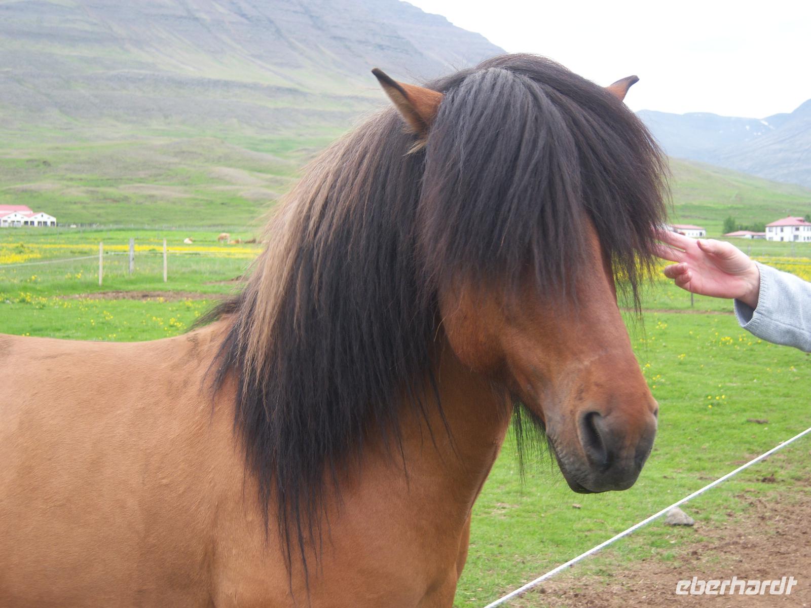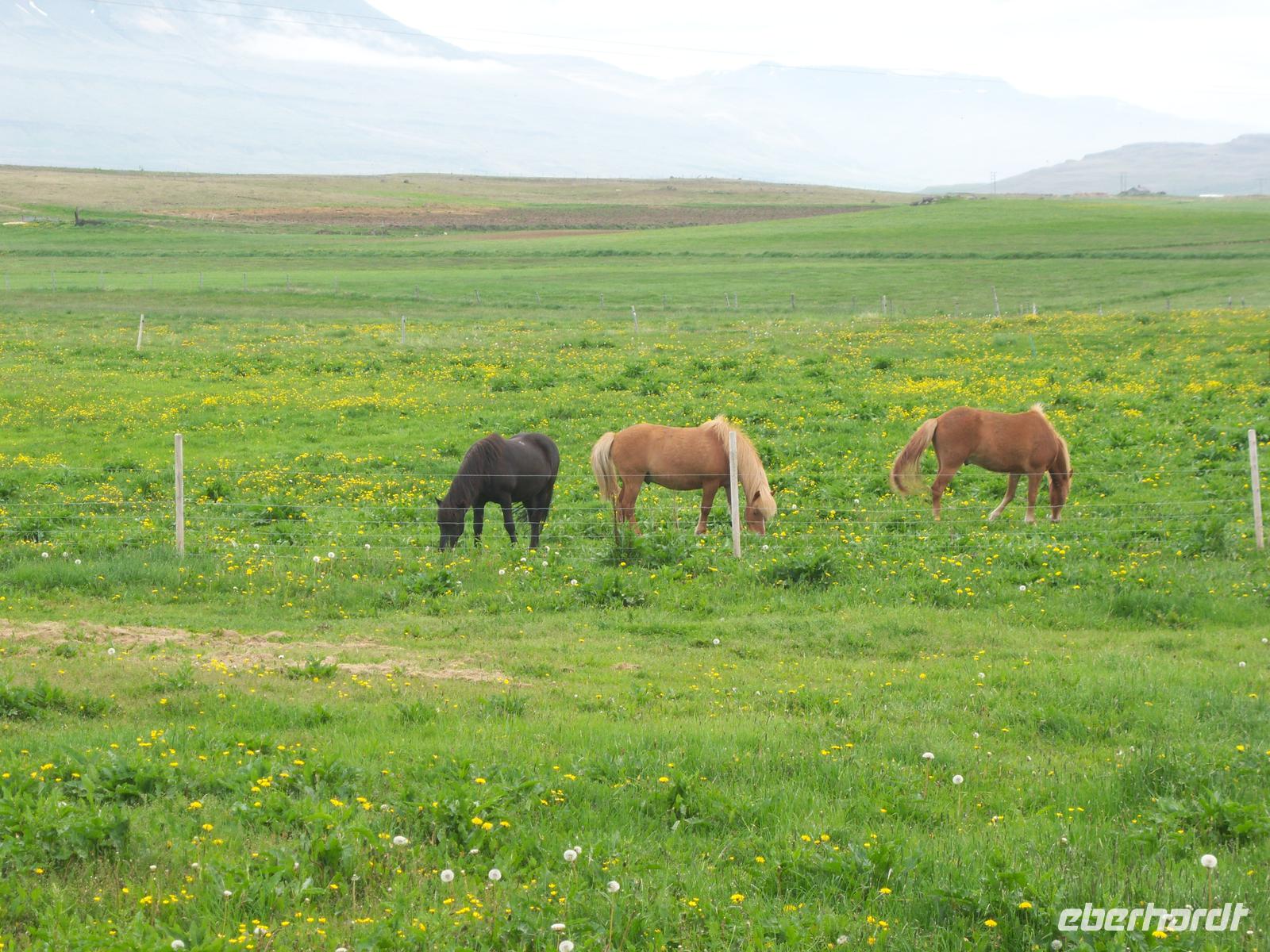 Noch etwas müde aber mit großer Vorfreude auf das, was kommen mag stärkten wir uns bei einem ausgiebigen Frühstück für den ereignisreichen Tag. Schnell stellten wir fest, dass isländisches Brot und einheimischer Joghurt, der sogenannte "Skyr" einfach wunderbar köstlich sind. Mit unseren sieben Sachen machten wir uns auf zu unserem ersten Stopp in Borganes. Durch den Walfjord - Tunnel gelangen wir in das kleine Städtchen, in dem alle Straßen nach Helden der Egillssaga benannt sind. Hier erledigen wir alle notwendigen Dinge, die Reisende so benötigen um zu überleben :-) : Geldtausch, Versorgung mit genügend Getränken und kleinen Naschereien , Toilettenpause. Mit tausenden von isländischen Kronen im Gepäck führt uns unsere Reise weiter über die Hochebene Holtavörduheidi weiter in den Norden und bringt uns in die bekanntesten Pferdezuchtgebiete Islands.