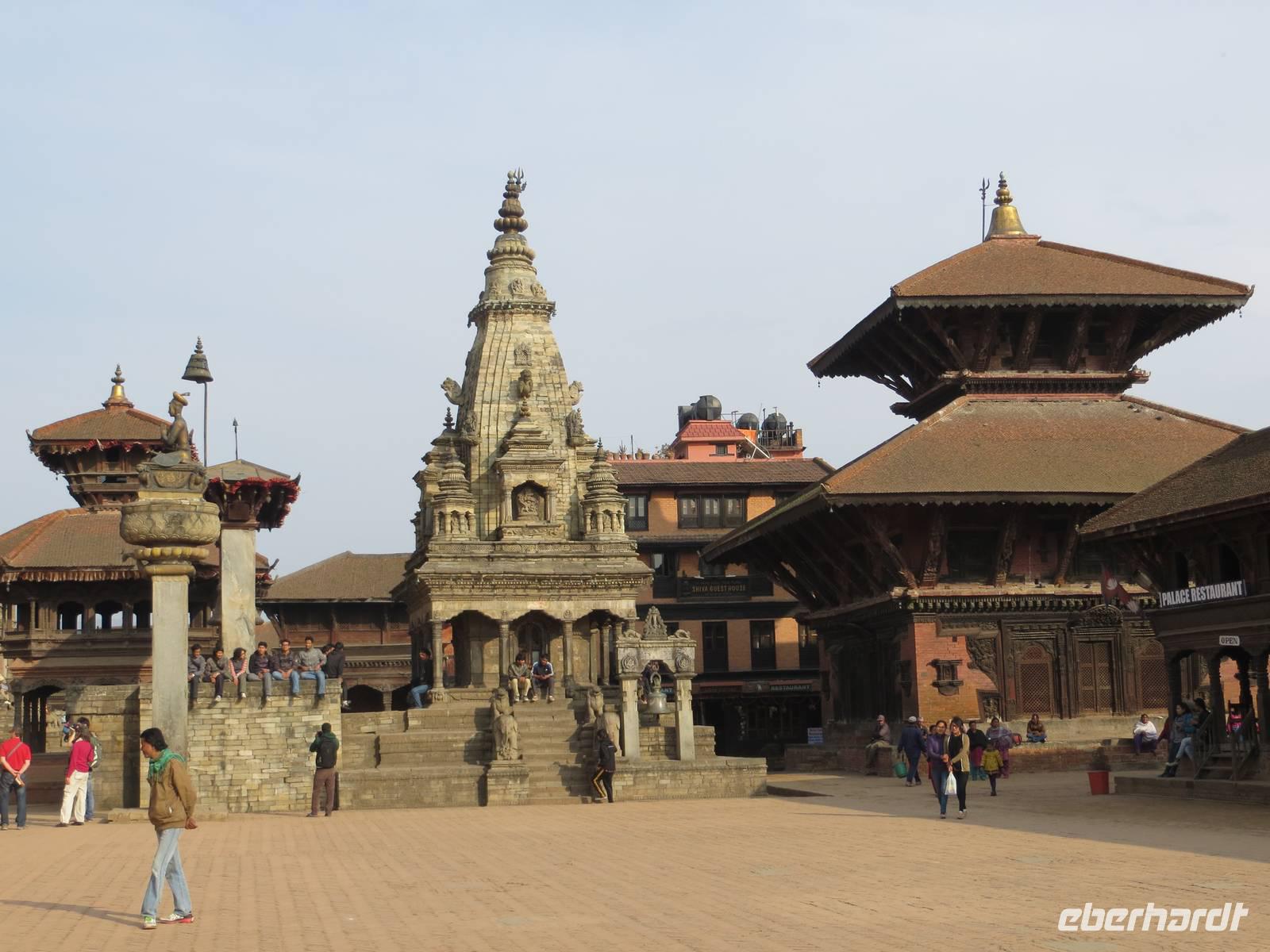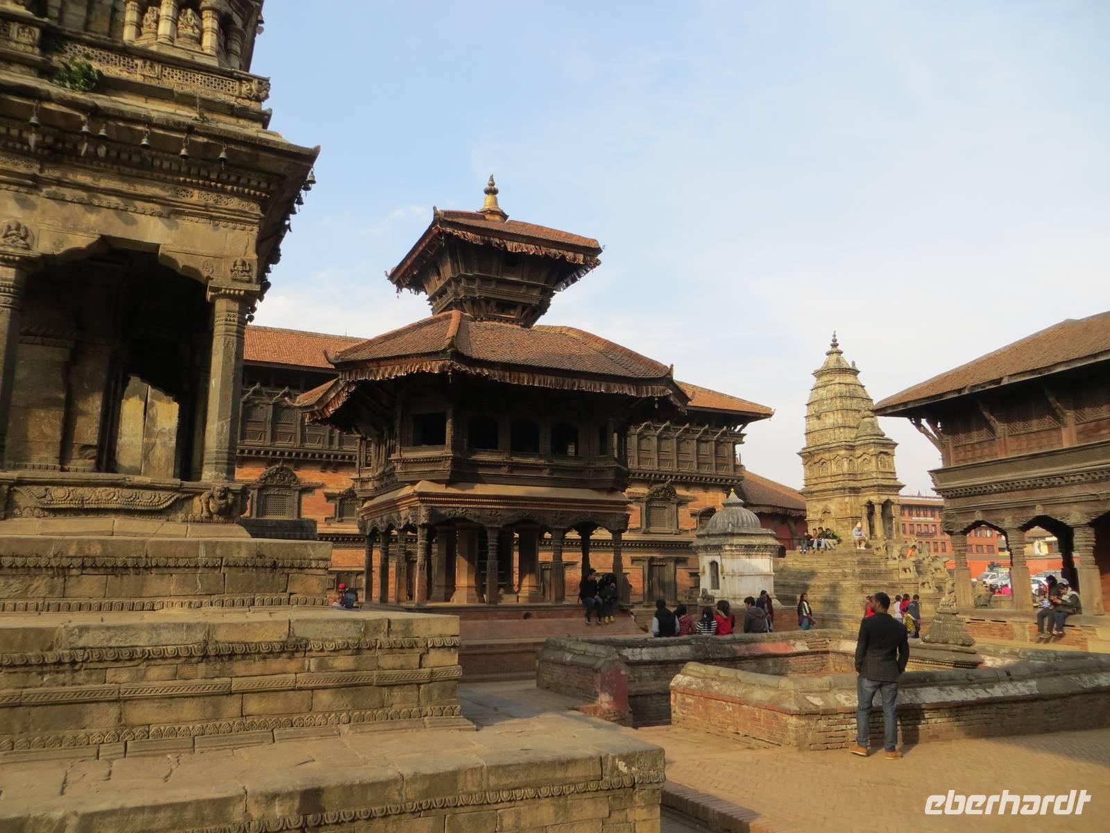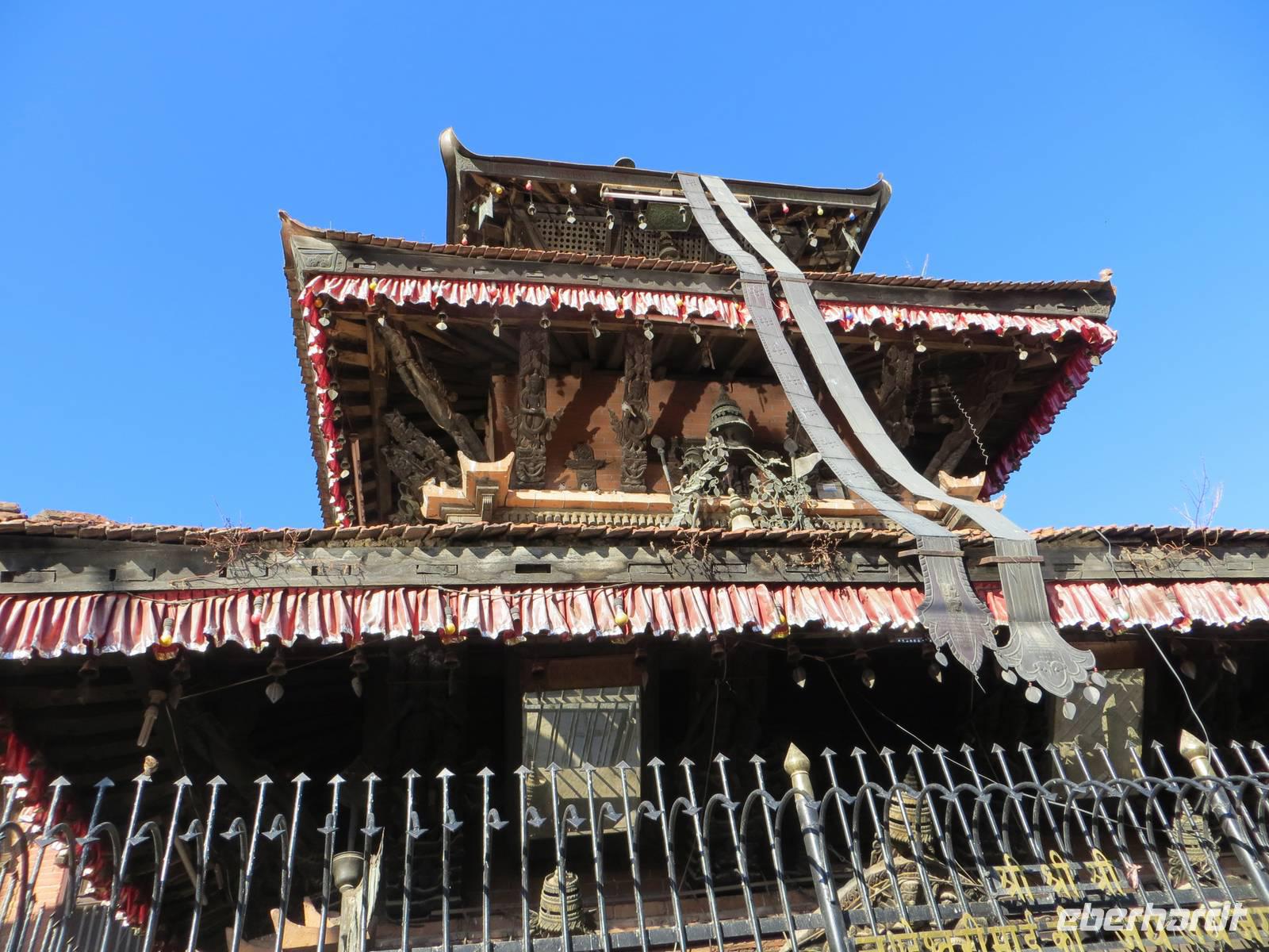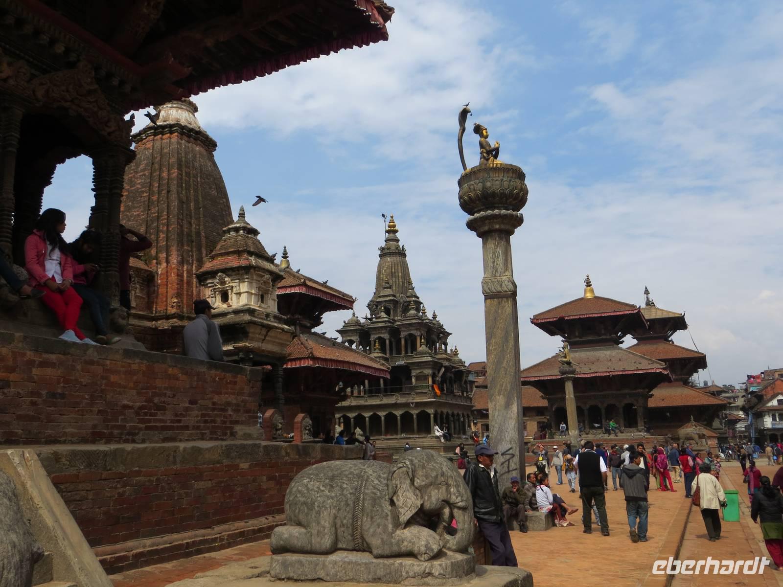 Auch die zweite Flugchance versank im Nebel. So bummelten wir vier Stunden durch Patan, einst auch Königsstadt; heute Distrikt Lalitpur. Der Kwa Bahal, der Goldene Tempel, fand zunächst unsere Aufmerksamkeit, bevor es zum Kumbleshava Tempel, einer der seltenen fünfstöckigen Pagoden in Nepal, ging. Am Sonntag waren viele Gläubige hier; das Rot der Sharis der Frauen belebte unsere Fotografien. Von hier war es nur noch ein kurzer Weg bis zum Durbar Square, dem Platz mit Tempeln und Pagoden vor dem Königspalast. Letzte große Chance in Patan zum Kauf von Kashmir-Pullovern, Pashmina-Schals, Gewürzen und Klangschalen. Am Nachmittag war dann wohl bei den meisten die Kraft raus und zugleich alle Wünsche erfüllt und das Programm vollständig abgelaufen und abgefahren.