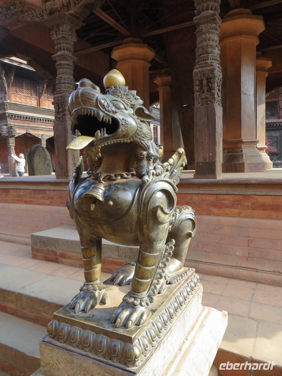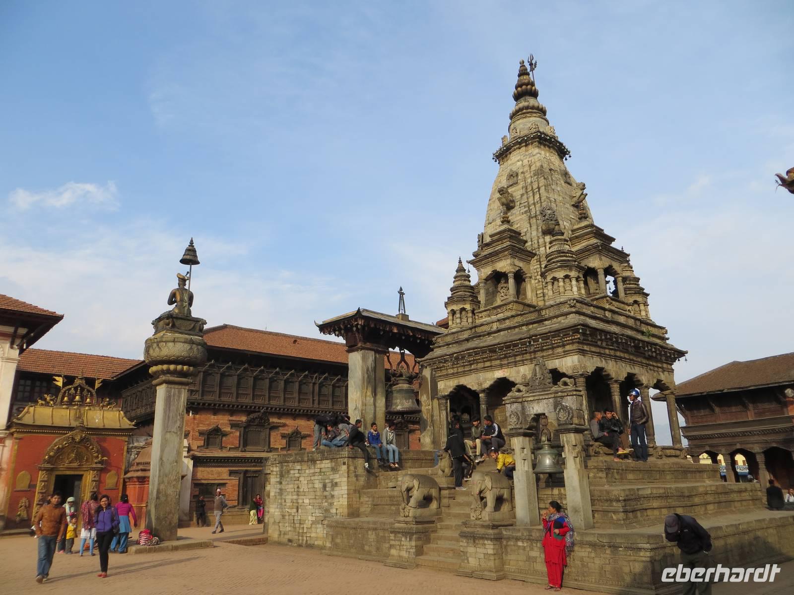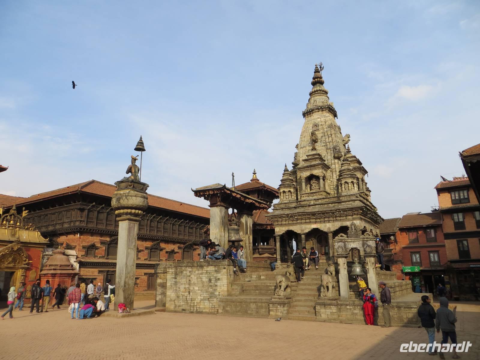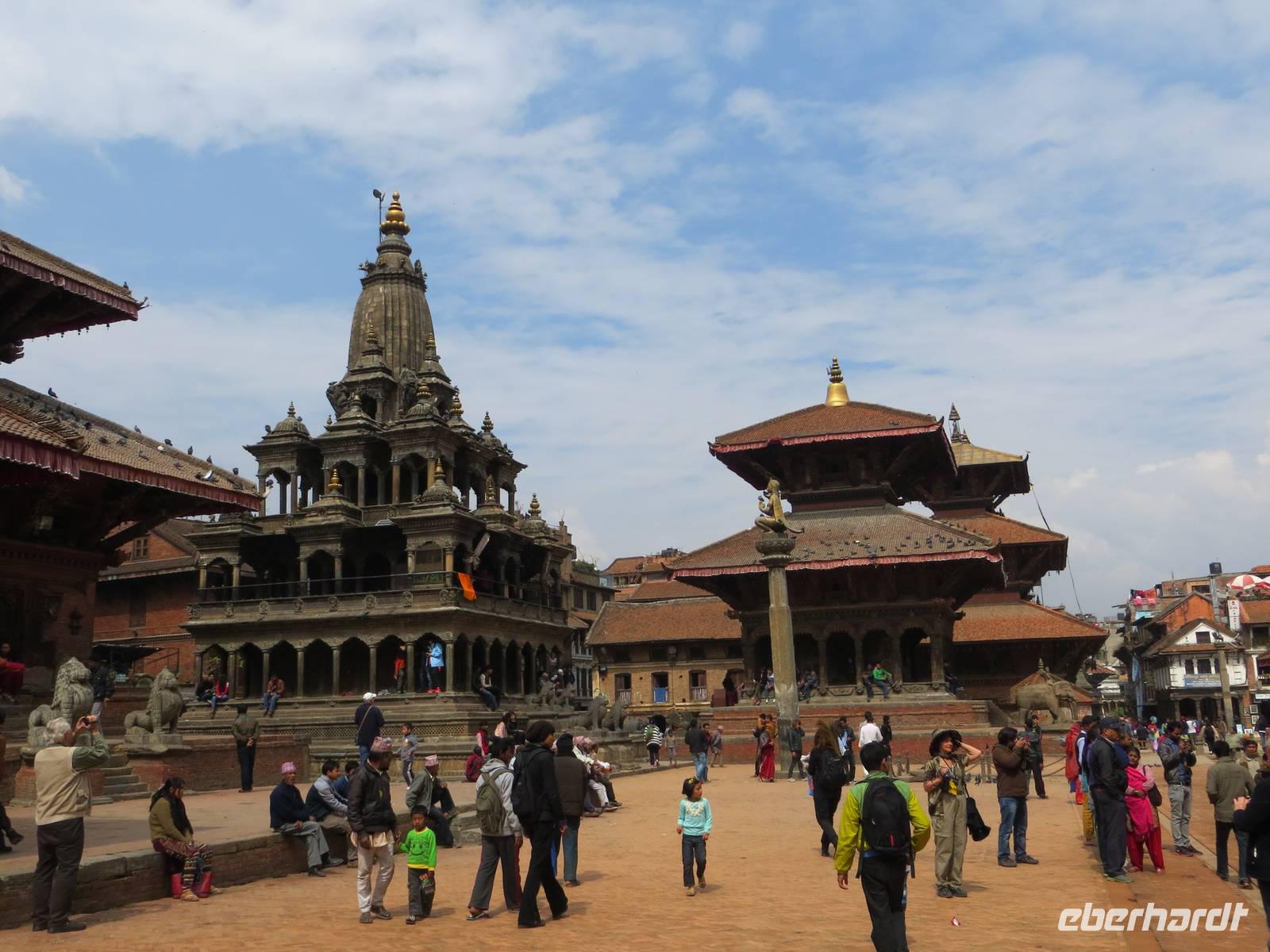 Auch die zweite Flugchance versank im Nebel. So bummelten wir vier Stunden durch Patan, einst auch Königsstadt; heute Distrikt Lalitpur. Der Kwa Bahal, der Goldene Tempel, fand zunächst unsere Aufmerksamkeit, bevor es zum Kumbleshava Tempel, einer der seltenen fünfstöckigen Pagoden in Nepal, ging. Am Sonntag waren viele Gläubige hier; das Rot der Sharis der Frauen belebte unsere Fotografien. Von hier war es nur noch ein kurzer Weg bis zum Durbar Square, dem Platz mit Tempeln und Pagoden vor dem Königspalast. Letzte große Chance in Patan zum Kauf von Kashmir-Pullovern, Pashmina-Schals, Gewürzen und Klangschalen. Am Nachmittag war dann wohl bei den meisten die Kraft raus und zugleich alle Wünsche erfüllt und das Programm vollständig abgelaufen und abgefahren.