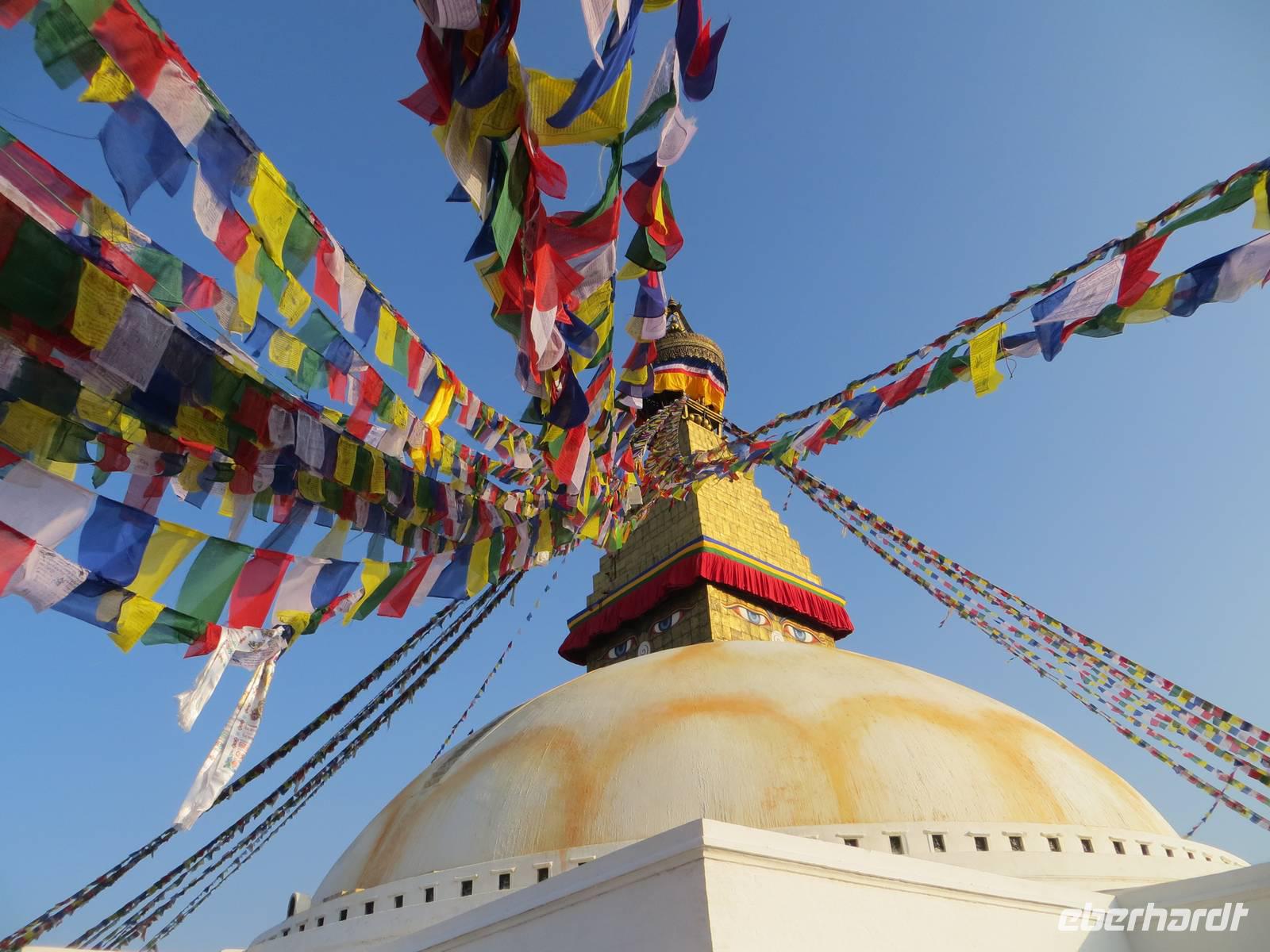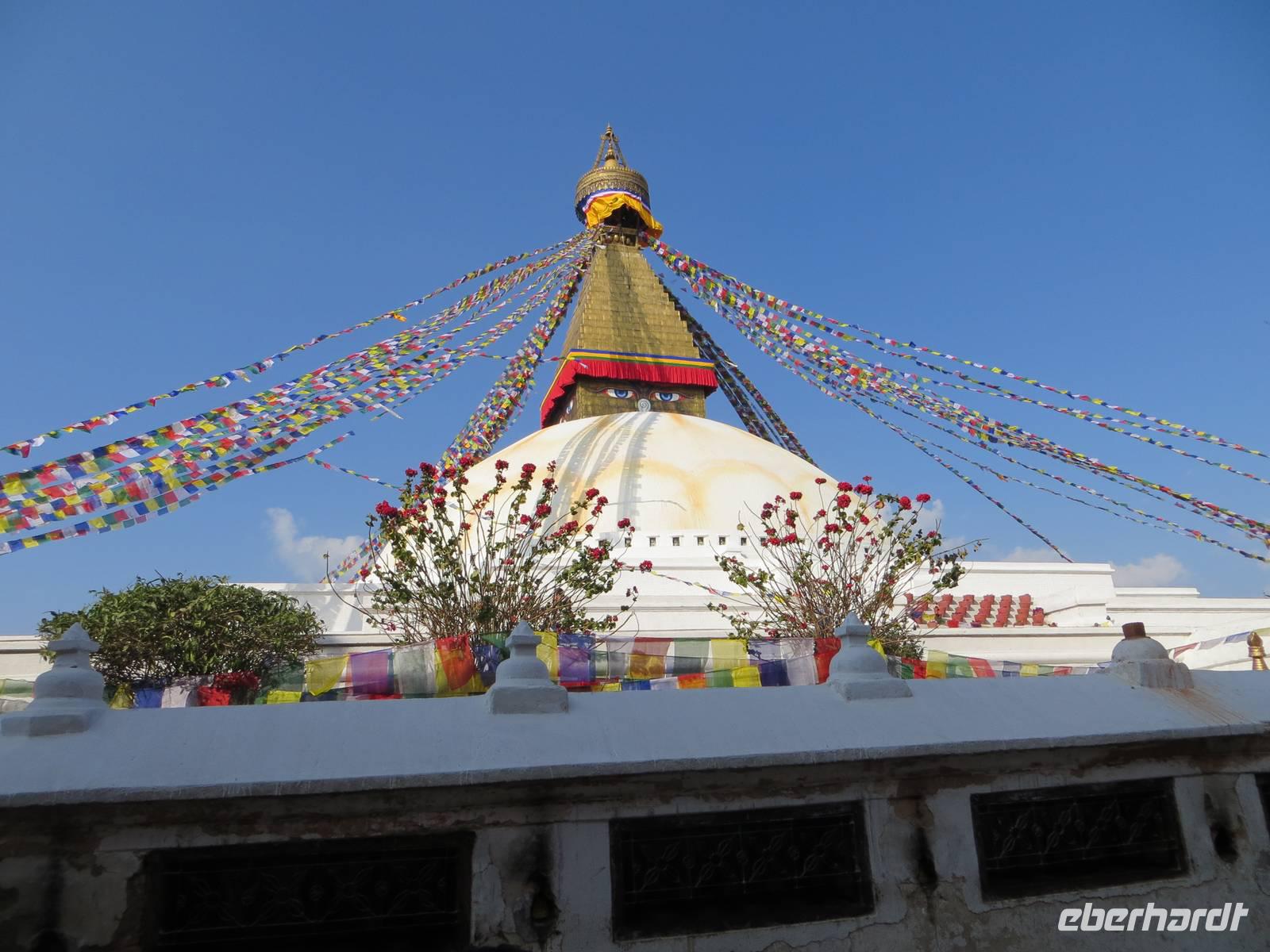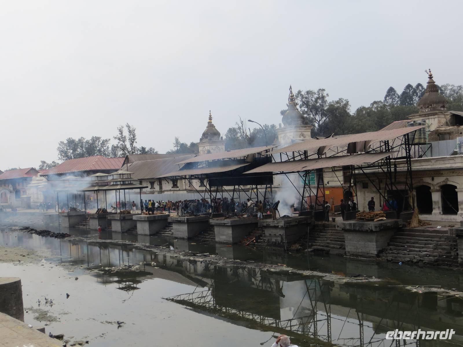 Der früh geplante Rückflug ließ auf sich warten, weil wohl schlechtes Wetter sei. Ob dies im Kathmandutal war oder über Bhutan blieb nicht ganz eindeutig. Um zehn Uhr stiegen wir dann steil auf, um die Bergkette hinter der Landebahn zu überqueren; raus aus dem Tal und eine enge Schleife gezogen, ging es über Sikkim Richtung Nepal. Die Wolkendecke war hoch, so dass nicht viel Berge des Himalaya zu sehen waren, obwohl alle Gäste rechtsseitige Fensterplätze hatten. Die Einreise in Kathmandu ging recht schnell vonstatten und K.C. erwartete uns mit neuem Bus. Sofort ging es nach Pashupatinath, dem nahe des Flughafens liegenden Heiligtum der Hindus. Am Vortag hatten sich hier aus Anlass eines bedeutenden Hindufestes eine Million Menschen versammelt. Auch an unserem Besuchstag waren unzählige Sadhus hier, um zu meditieren oder auch für einige Rupies sich vor den Kameras der Touristen zu positionieren. Beindruckender waren die Verbrennungszeremonien vor dem heiligen Tempel am Fluss Bagmati. Ein „Hospital" dient ausschließlich der palliativen Phase, um unmittelbar nach dem Sterben im Bagmati gewaschen zu werden. Auch die Entnahme der Augenretina Verstorbener geschieht unmittelbar am Fluss durch herbeigerufene Augenärzte: Organspende.