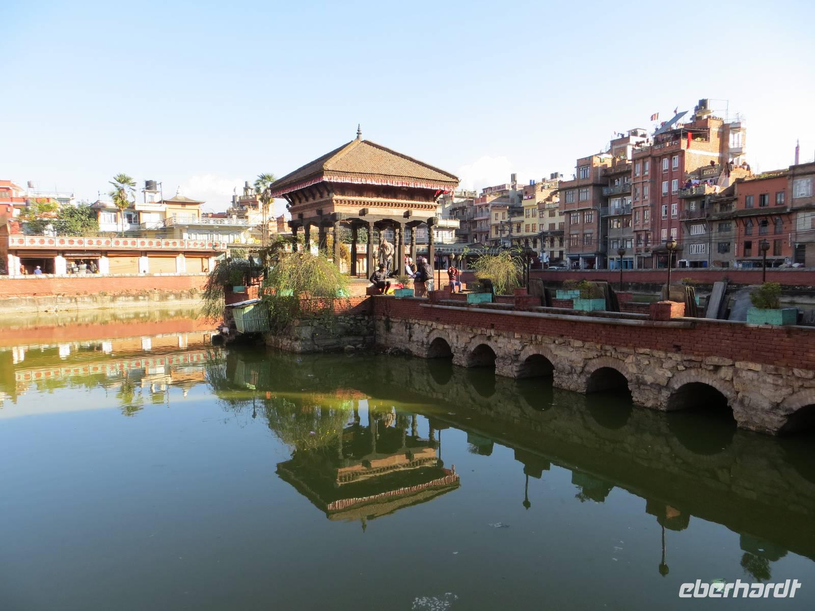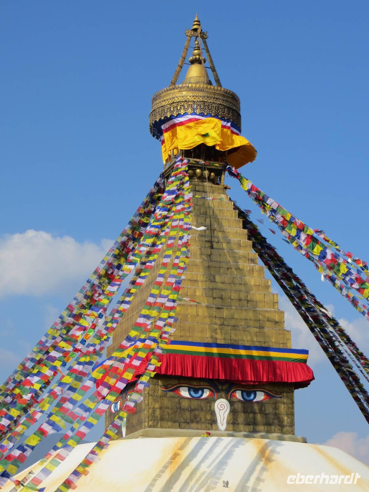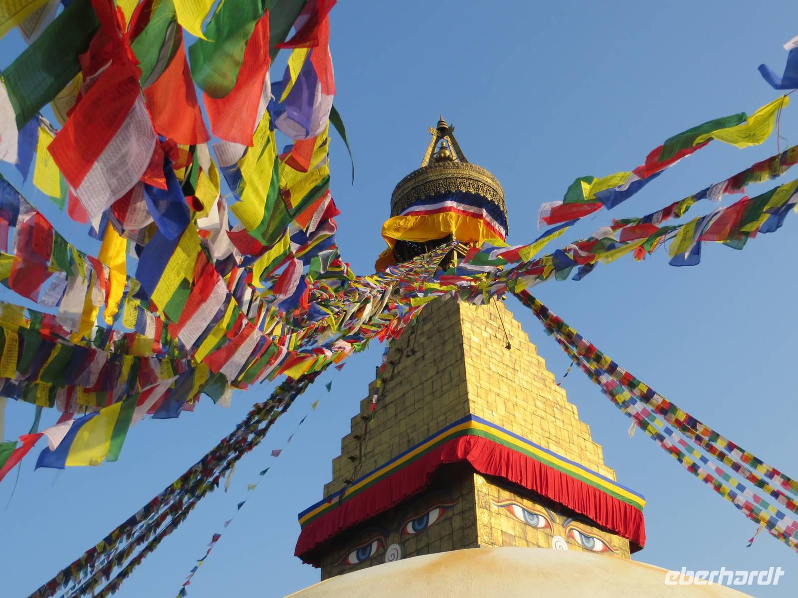 Der früh geplante Rückflug ließ auf sich warten, weil wohl schlechtes Wetter sei. Ob dies im Kathmandutal war oder über Bhutan blieb nicht ganz eindeutig. Um zehn Uhr stiegen wir dann steil auf, um die Bergkette hinter der Landebahn zu überqueren; raus aus dem Tal und eine enge Schleife gezogen, ging es über Sikkim Richtung Nepal. Die Wolkendecke war hoch, so dass nicht viel Berge des Himalaya zu sehen waren, obwohl alle Gäste rechtsseitige Fensterplätze hatten. Die Einreise in Kathmandu ging recht schnell vonstatten und K.C. erwartete uns mit neuem Bus. Sofort ging es nach Pashupatinath, dem nahe des Flughafens liegenden Heiligtum der Hindus. Am Vortag hatten sich hier aus Anlass eines bedeutenden Hindufestes eine Million Menschen versammelt. Auch an unserem Besuchstag waren unzählige Sadhus hier, um zu meditieren oder auch für einige Rupies sich vor den Kameras der Touristen zu positionieren. Beindruckender waren die Verbrennungszeremonien vor dem heiligen Tempel am Fluss Bagmati. Ein „Hospital" dient ausschließlich der palliativen Phase, um unmittelbar nach dem Sterben im Bagmati gewaschen zu werden. Auch die Entnahme der Augenretina Verstorbener geschieht unmittelbar am Fluss durch herbeigerufene Augenärzte: Organspende.