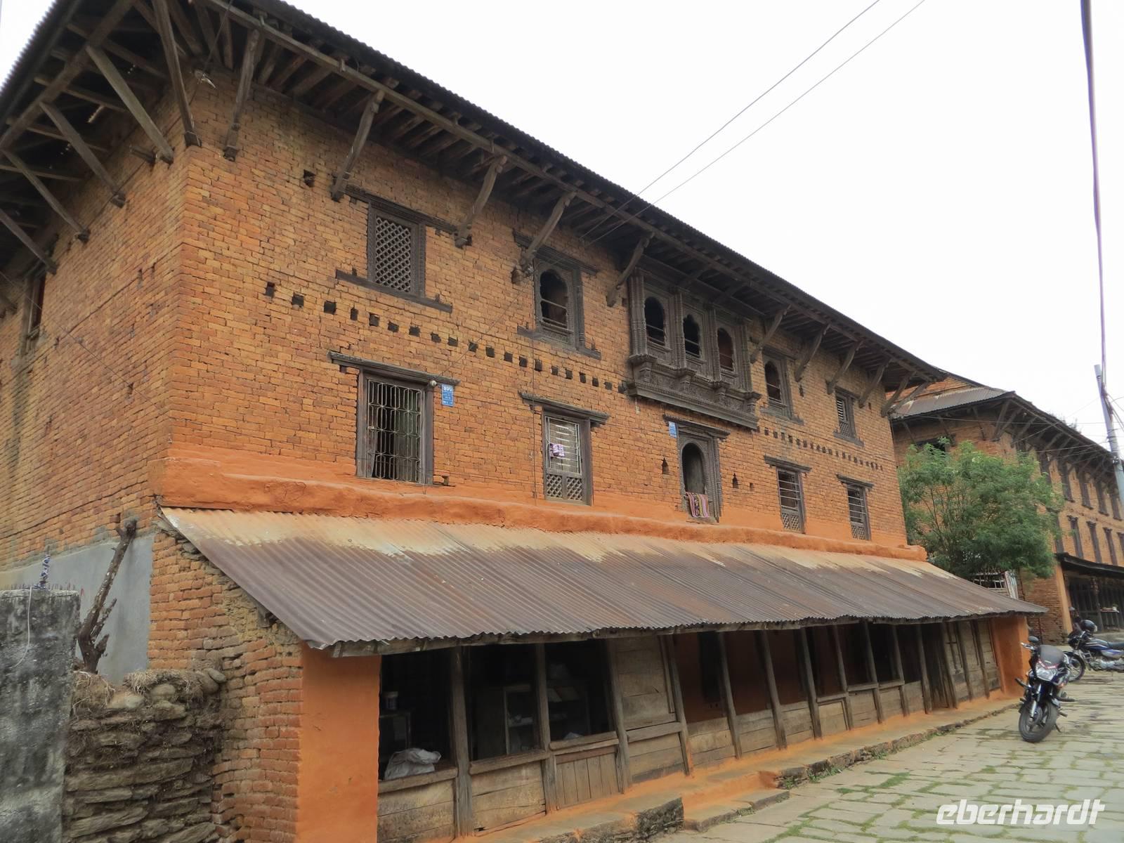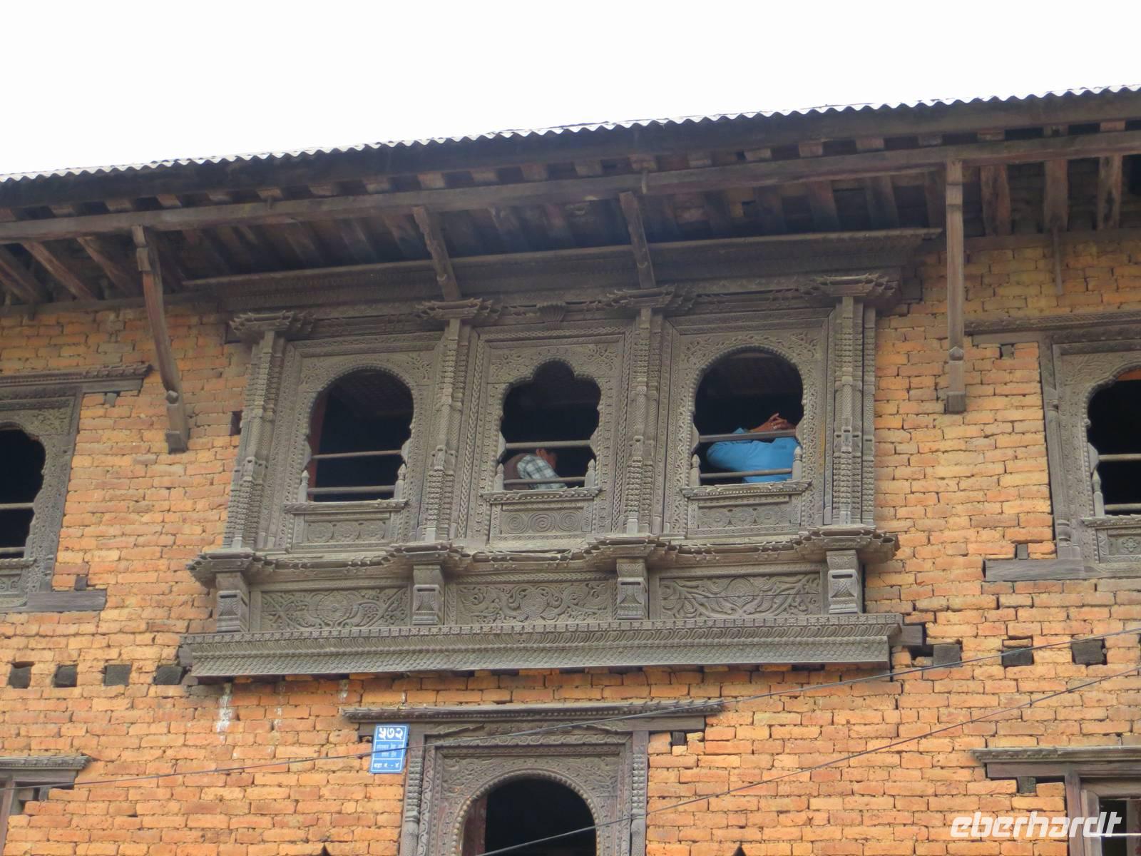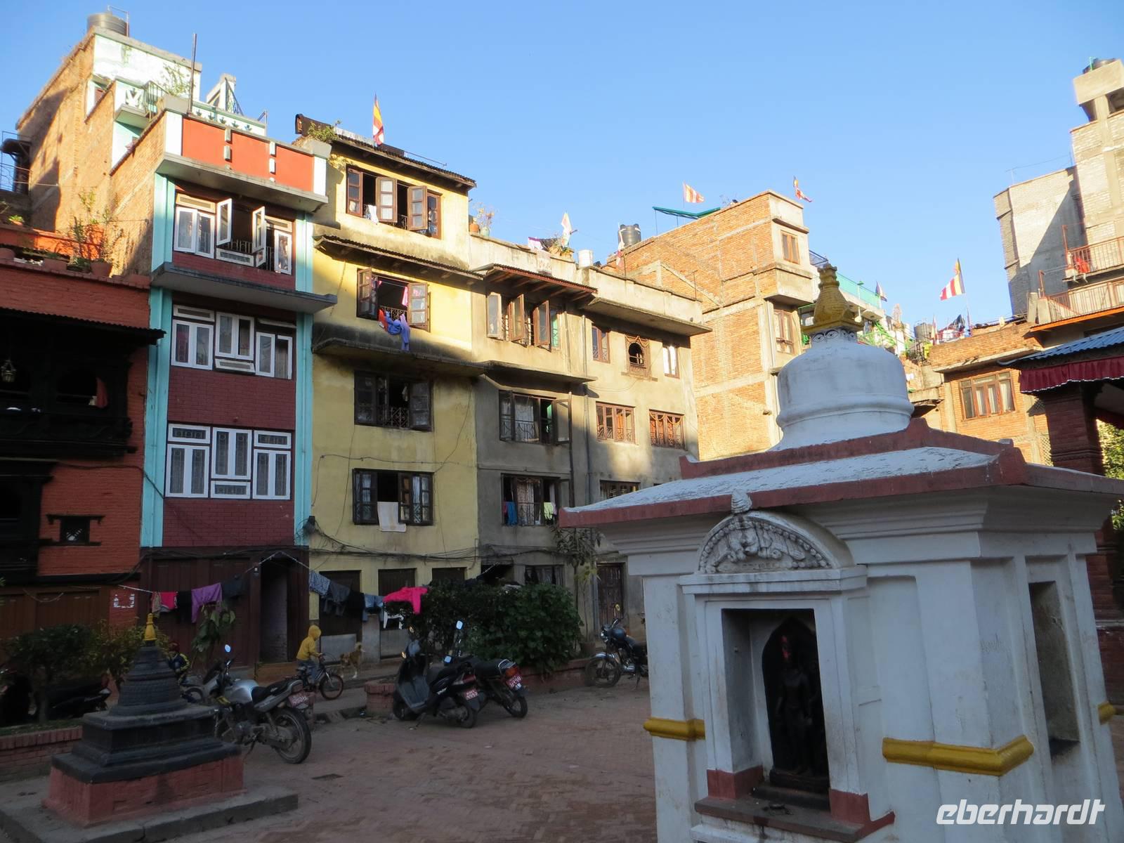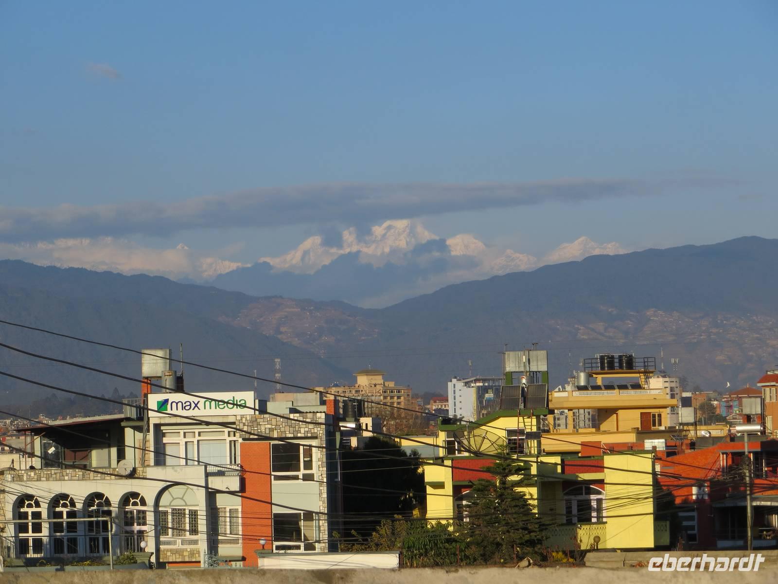 Die Mehrzahl der Gäste entschied sich dann gegen das langwierige Frischmachen, sondern für ein erstes Kennenlernen Nepals. Da wir in der alten Königsstadt Patan ohnehin noch auf große Besichtigungstour gehen werden, entschieden wir uns für einen kleinen Bummel auch jenseits der Touristenwege: Lalitpur (wie Patan auch heißt) also ganz authentisch. Etwas schlammige Straßen, wirre Baustellen, Müll, verwurstelte Elektroleitungen an den Masten; dazwischen aber immer wieder Tempel, geschnitzte Fenster an den Häusern, Stupas und Chörten, kleinste Geschäfte und Handwerksbetriebe und viel Trubel. Besonders eindrucksvoll der Innenhof eines tibetischen Wohn- und Handelshauses. Zum Abschluss noch ein Blick hinüber zu den schneebedeckten Gipfeln des Himalaya; dann war die Kraft heraus und die Müdigkeit wurde größer und größer. Zum Tagesabschluss noch ein feines Buffet im Hotel. Endlich Gute Nacht wieder im weißen Bett.