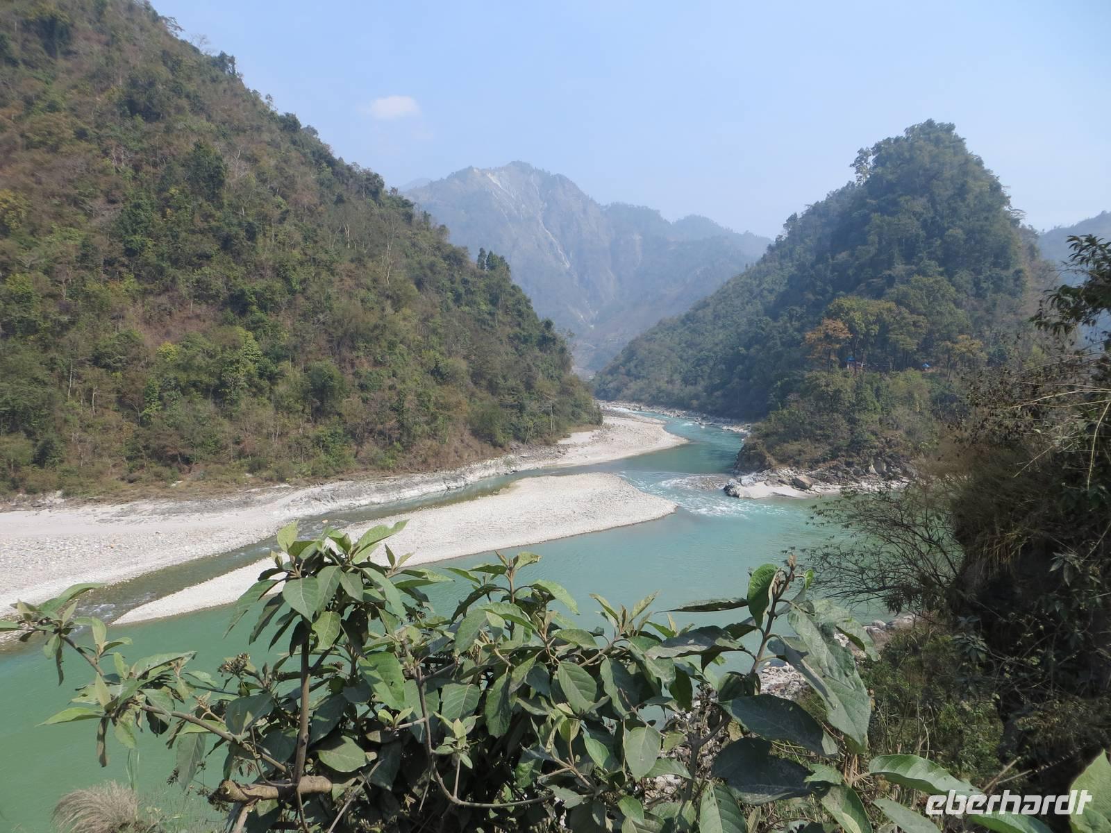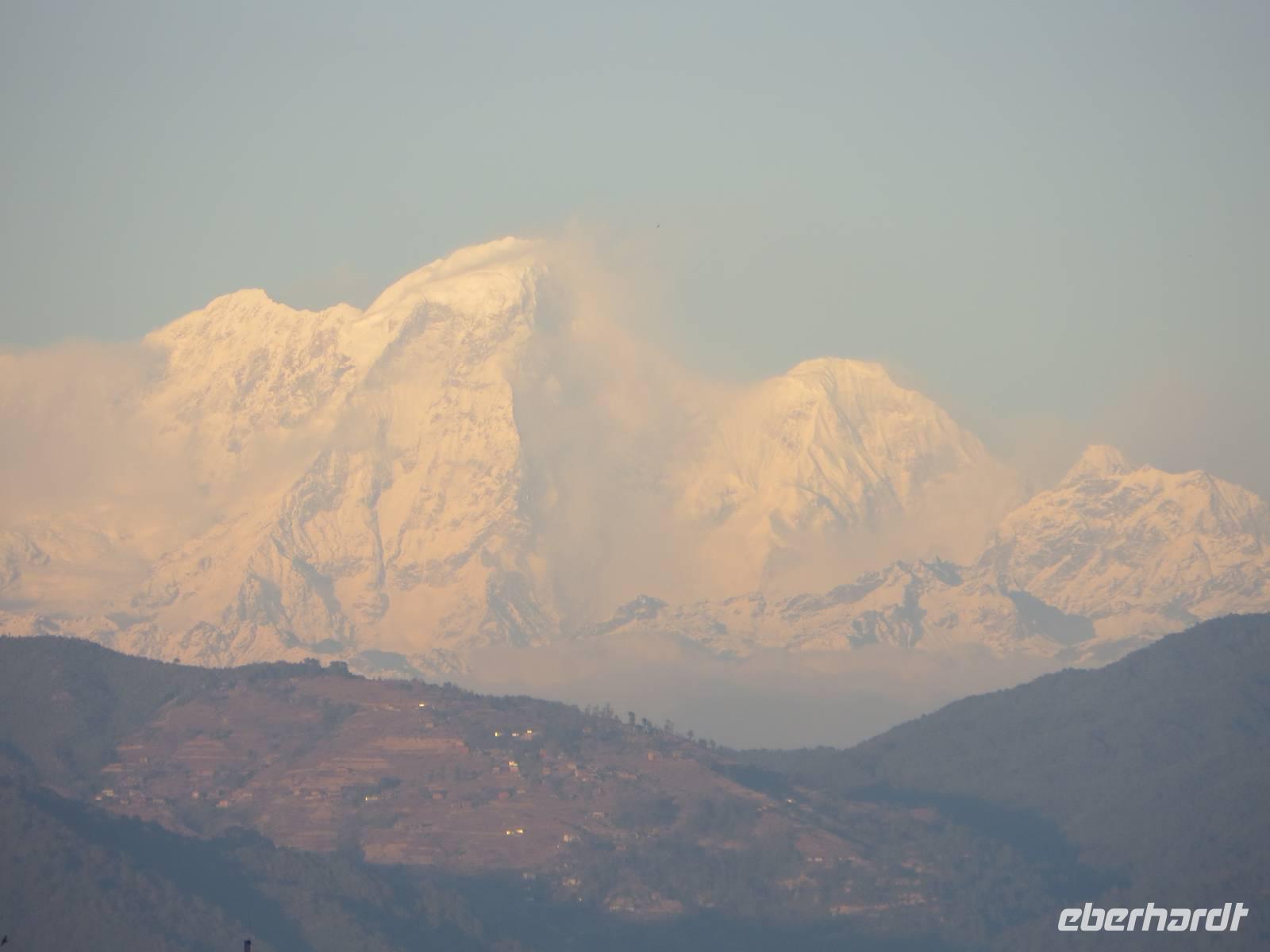 Bereits 8 Uhr ging es mit einem modernen Bus durch Kathmandu Richtung Westen. Noch lag Dunst über dem Tal, bald sahen wir aber nicht nur die terassierten Felder neben der Nationalstraße nach Indien, sondern auch im Norden die Gipfel von Langtang, Ganesh, Manaslu und Annapurna. Besonders der achthöchste Berg der Erde, der Manaslu, reckte mit Schönheit seine Spitze in den Himmel. Leider ist kaum ein Kurvenbogen der Straße zum Fotostopp geeignet.