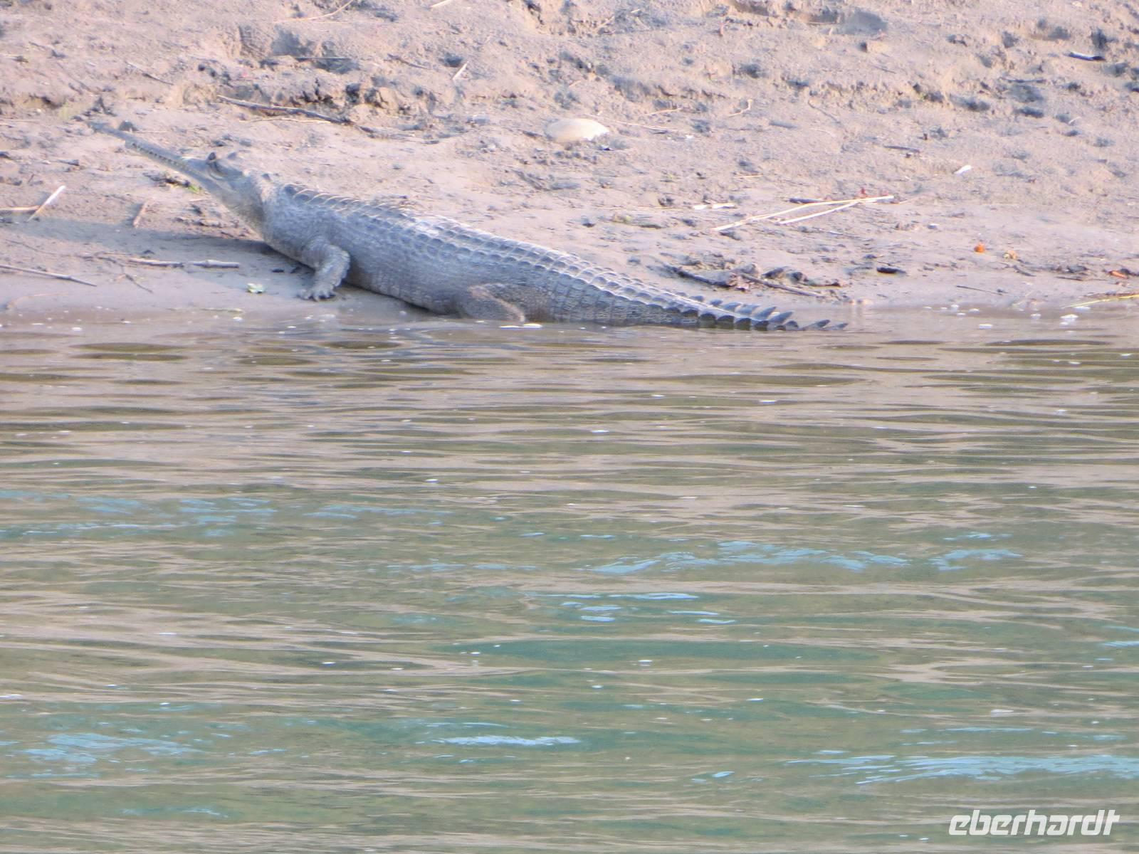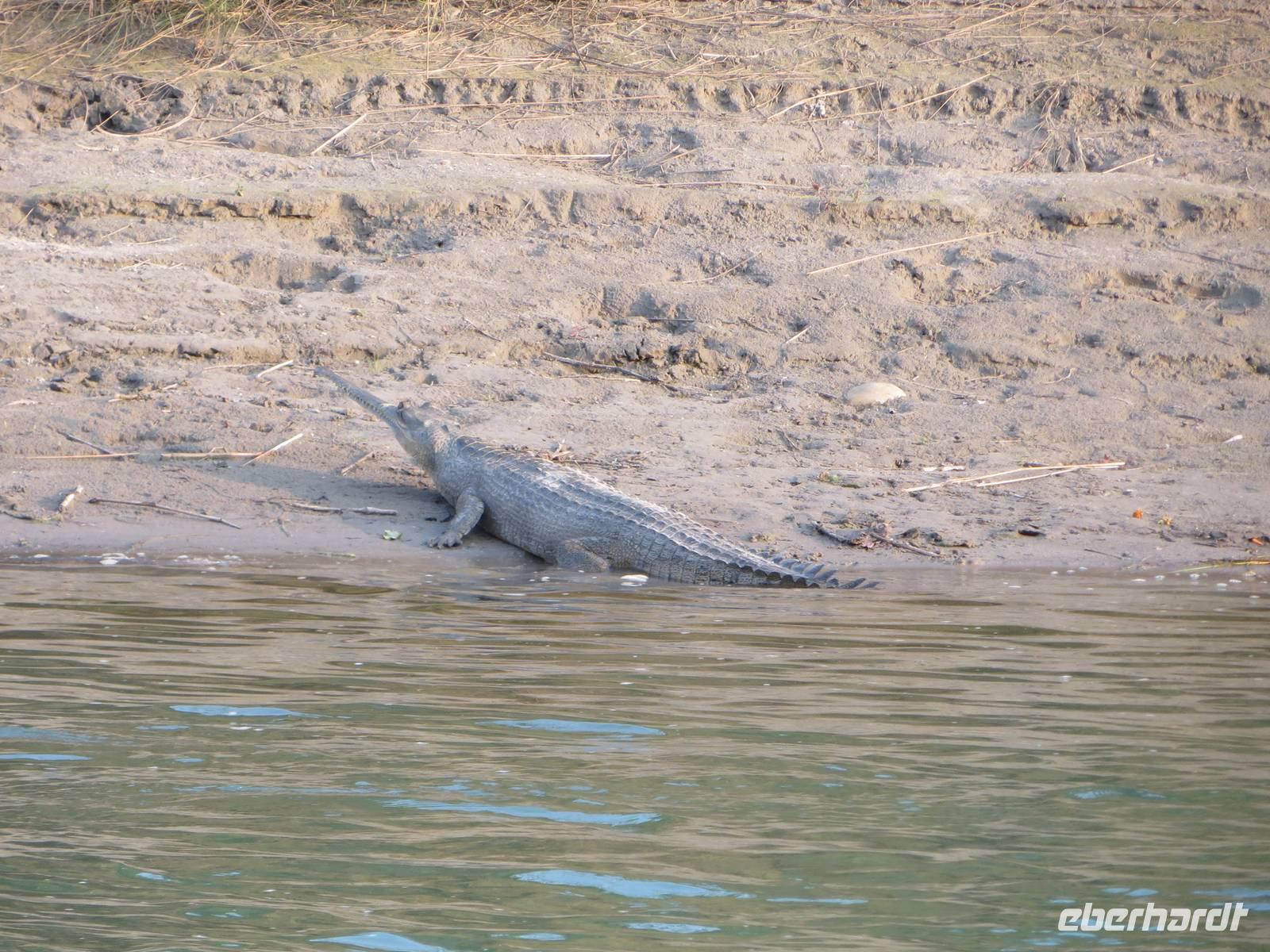 Am Nachmittag - nun auch wieder im Reiseleiteroriginaltext - stand dann eine Jeepsafari und eine Bootsfahrt im Programm. Zwei Nashörner, einige Rhesusaffen hoch oben im Baum ließen sich auch durch die knatternden, stinkenden Landrover nicht vertreiben. Selbst das Explodieren der Batterie des einen Autos erschreckte mehr uns als die Tiger im Dickicht. Dann eine Bootsfahrt auf dem Kali Kandaki, der aber hier nach dem Zusammenfluss mit dem Trisuli schon Narayani heißen müsste. Gleich wie, es war ein durchaus respektabler Fluss, an dessen Strand wir einige Krokodile sahen.