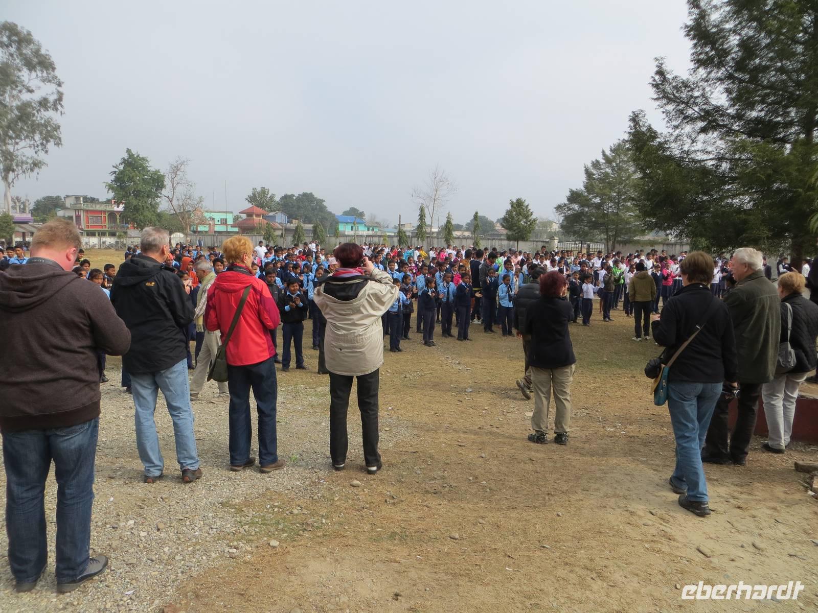 Bevor wir den Chitwan - Nationalpark verließen, war eine Dorfbesichtigung angesagt. Besichtigten wir die Dörfer und Ihre Einwohner oder wurden wir besichtigt, als wir auf drei Ochsenkarren verteilt durch die Dörfer gezogen wurden??? Sicher war es für die Einwohner ebenso interessant wie für uns, als Sie die „Langnasen" auf dem Ochsenkarren sahen und diese Menschen aus dem reichen Europa ihre Kühe, Häuser, Pflanzen, besonders aber die Menschen fotografierten. Immer wieder Kinderlächeln und Winken. Das bewog uns, später an einer Schule Stopp zu machen. Fast Tausend Schüler lernen an dieser Mittelschule, eingeteilt in die Schüler mit Englisch-Kursen (in blauer Schuluniform) und jene mit Nepali-Kursen (in weißer Bekleidung). Uns zu Ehren wurde zum Frühsport getrommelt und nach den Lockerungsübungen die Nationalhymne mit Hand aufs Herz gesungen.