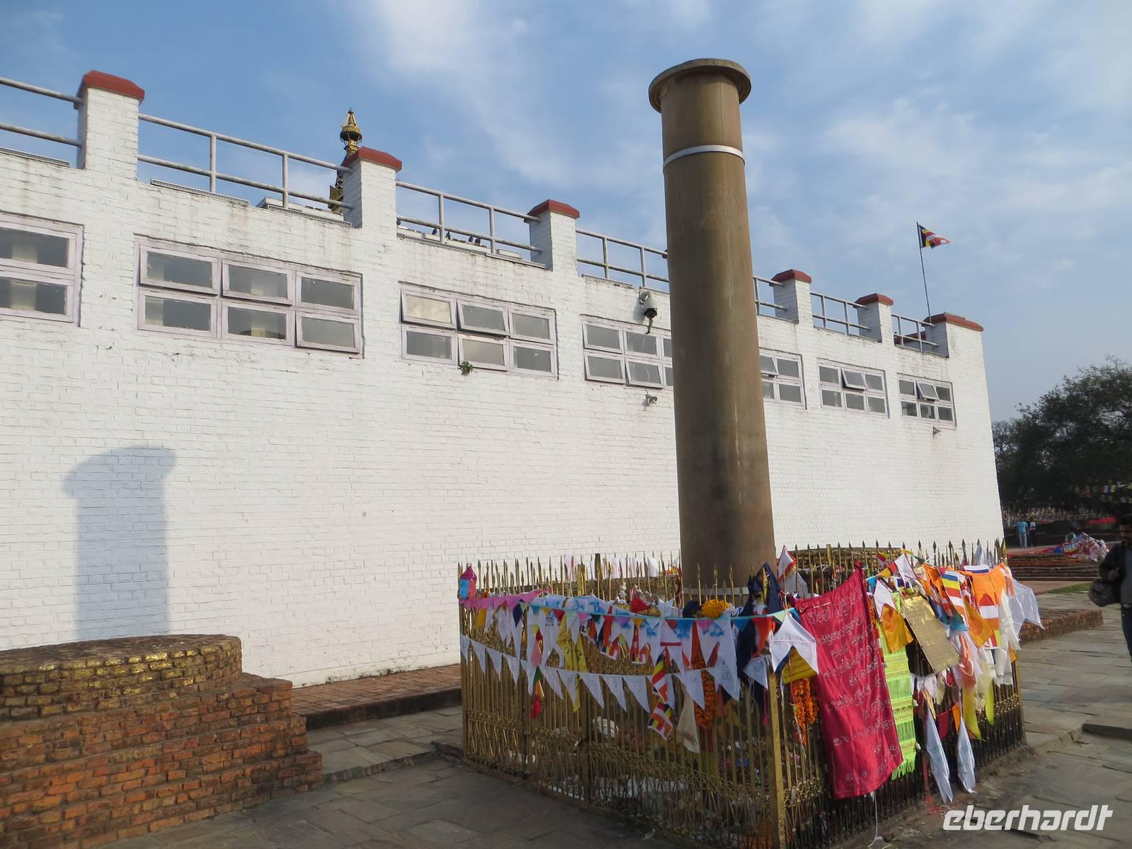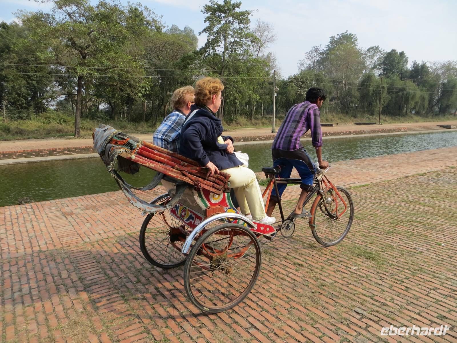 Nach knapp dreistündiger Fahrt erreichten wir Lumbini wieder im Terrai nahe der indischen Grenze. Nach dem check in ließen wir uns auf Fahrradrikschas durch den Lumbini-Park fahren. Zahlreiche buddhistische Staaten haben hier einen Tempel errichtet. Im recht neu errichteten chinesischen Tempel machten wir uns mit der Anlage verstraut und mit riesigen goldenen Buddhafiguren bekannt. Im zentralen Mittelpunkt des UNESCO-Weltkulturerbes steht jedoch eine Stupa direkt auf jenem Platz, an dem einst der Religionsstifter Gaudama („Buddha") geboren worden sein soll. Im 2. Jahrhundert v.C. erichtete der damalige Herrscher die nach ihm benannte Ashoka-Säule, auf der er schreiben ließ, das an jenem Ort Buddha geboren worden sei.