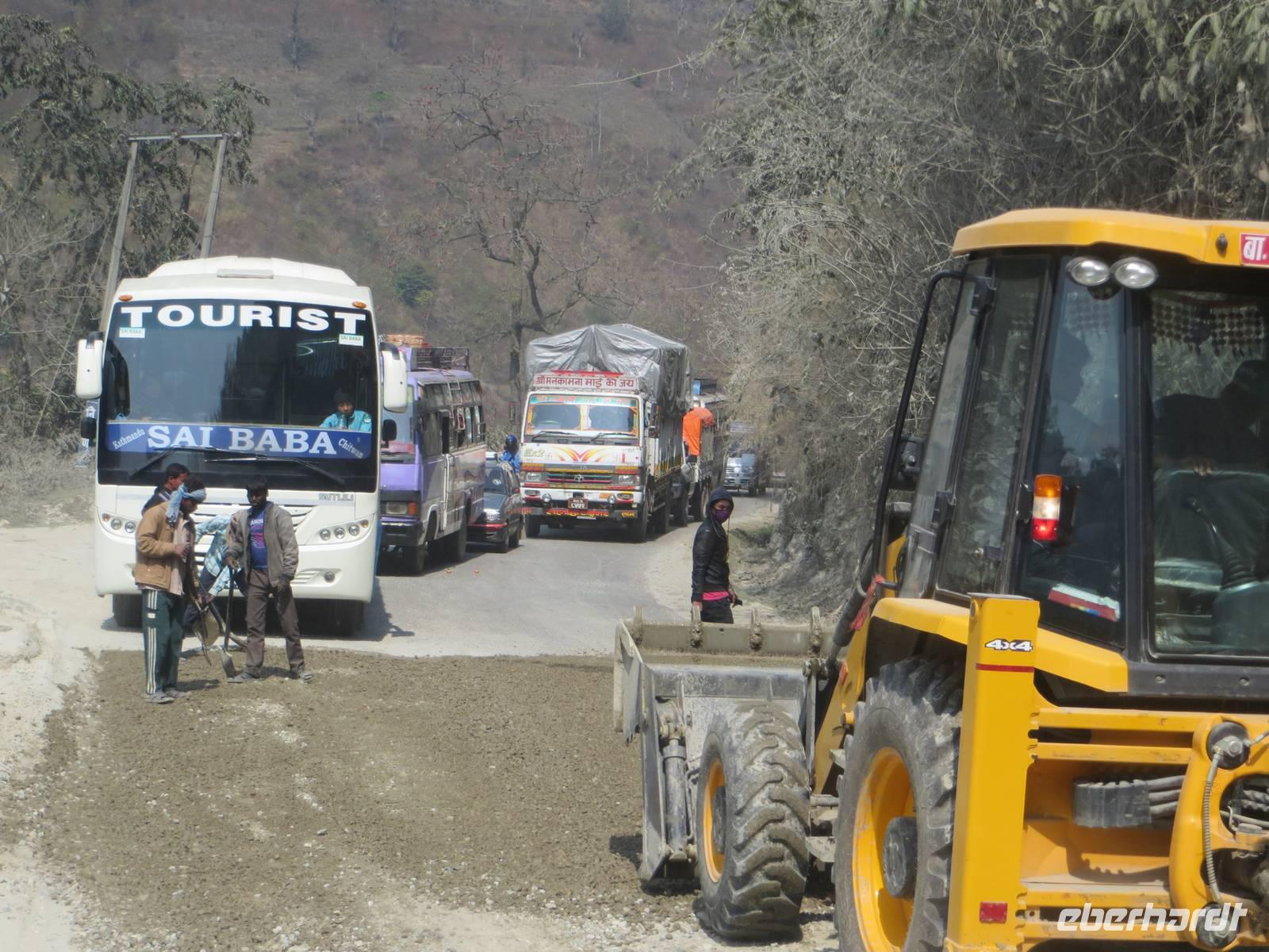 Mit dem Wissen um zahlreiche Baustellen starteten wir, aber bereits nach einer Stunde mussten wir für mehr als eine Stunde stehen. Als der Strom der wartenden Fahrzeuge auf eher einspuriger Piste fast dreispurig startete, hielt auch unser Fahrer Phub mit. Am Dochula-Pass war schlechtere Sicht als am Vortag. Phub war allein weitergefahren und wartete vereinbarungsgemäß hinter der nächsten Baustelle. So wanderten wir knapp zwei Kilometer auf fahrzeugfreier Passstraße an den Baustellen vorbei und stiegen in den Bus, ohne, dass andere Fahrzeuge uns mehr verdrängen konnten. Diese clevere Idee brachte uns eine Stunde Zeitgewinn und eine recht angenehme Wanderung in knapp dreitausend Meter Höhe.