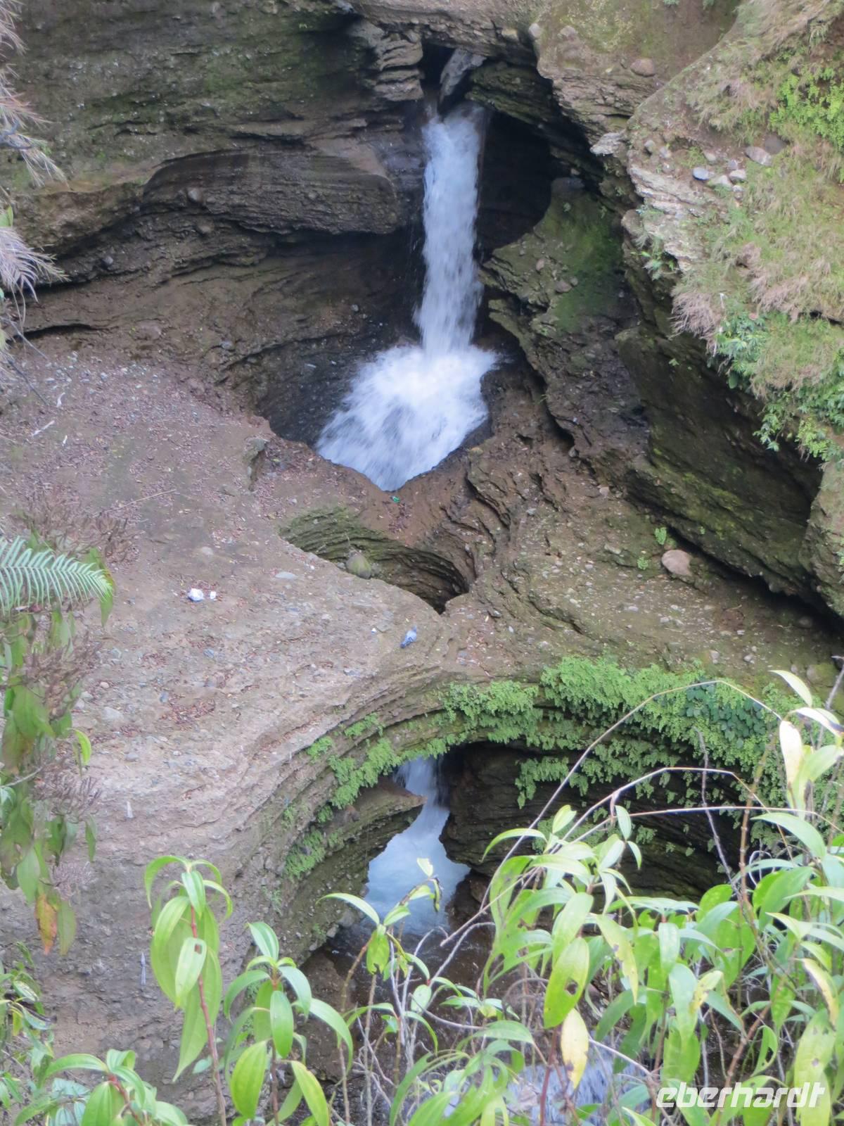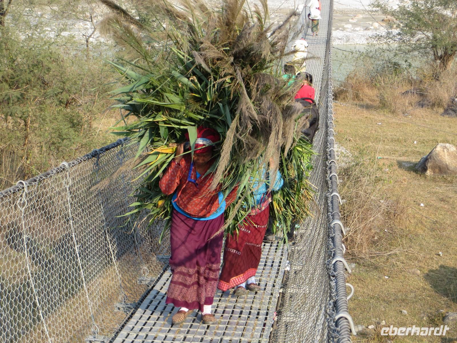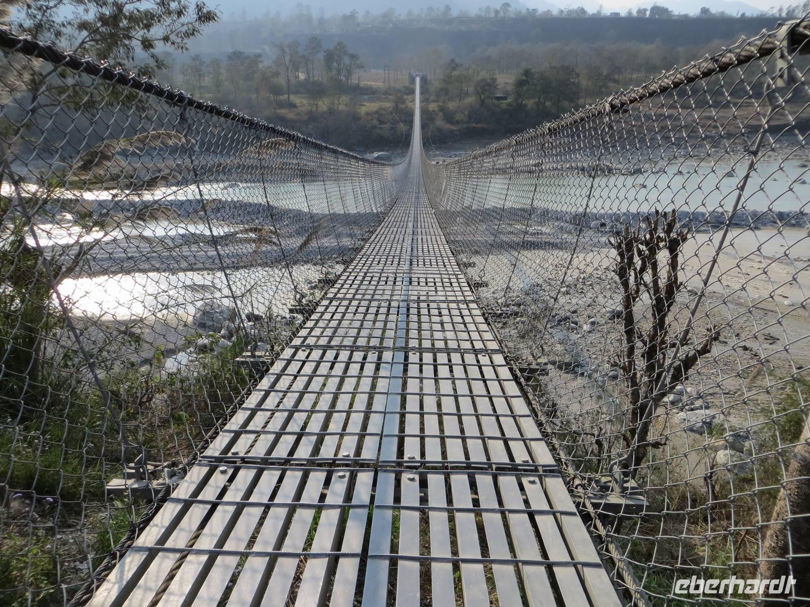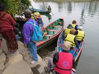 Auf einer pausenreichen Fahrt von fast zehn Stunden war natürlich Zeit nochmals an die ethischen Grundsätze Buddhas und Gesetze des Königs Ashoka anzuknüpfen.Die Fahrt führte uns aus dem Terrai hinaus über die südliche und dann die mittlere Gebirgskette des Mittellandes, oft durch Täler oberhalb reißender Flüsse. Auf unserer Fahrt bis Mugling interessierten uns tiefe Talblicke und Zusammenflüsse. Hinter Mugling waren wir im Gorkhaland und erinnerten uns der Geschichte der Einigung Nepals unter dem König Shah und der Rolle der Gorkhasoldaten. In den Tälern an der Fahrstrecke nahmen nun die Terrassenfelder zum Anbau von Senf, Linsen, Getreide und Buchweizen zu. Bauern mit Ochsengespann und Pflugscharr prägten hier das Bild. Am fortgeschrittenen Nachmitag nutzten wir dann die Chance über eine Hängebrücke zu laufen. Mit 256 m war dies eine kapitale Brücke, die uns schwankend über den Setifluss trug. Beim Einzug in Pokhara stoppten wir an den Devi-Wasserfällen: da ist natürlich in der Monsunzeit mehr Wasser als im trockenen Februar. Hier stürzt das Wasser 30 Meter in die Tiefe und verschwindet fünfhundert Meter unter der Erde. Ankunft dann 18 Uhr am dem Hotel gegenüberliegenden Ufer: ein Fährmann zog uns mit dem Fährponton hinüber. Wohnpavillons mit mehreren Zimmern inmitten einer zauberhaften Parklandschaft am Seitenarm des Phewa-Sees empfingen uns. Das feine Abendessen vom Büffet gab es dann im Speisepavillon, der vom offenen Holzfeuer beheizt wurde. Mancher ließ sich nach dem Abendessen nochmals auf die andere Seite bringen, um ein wenig nach Mitbringseln zu schauen.