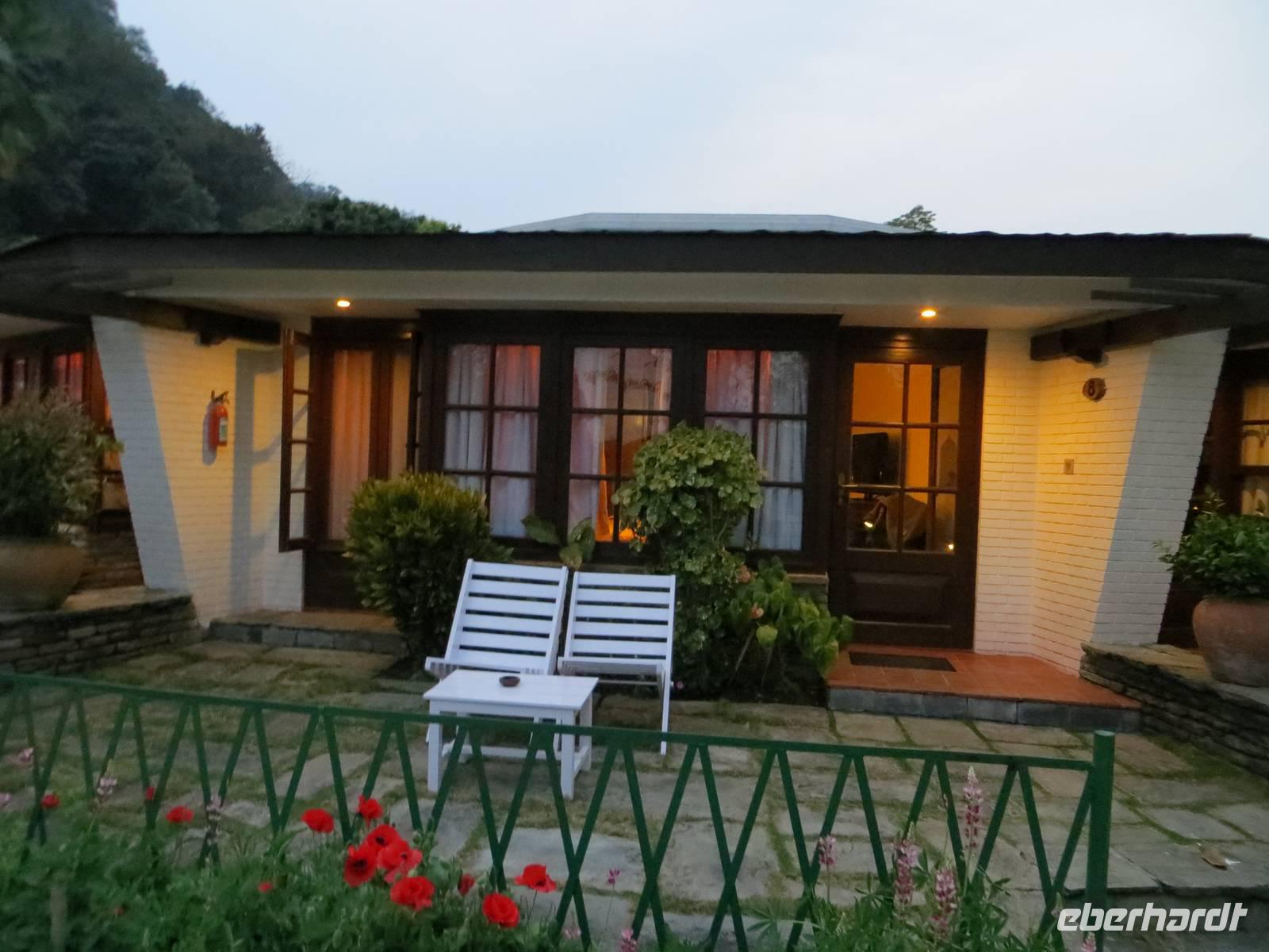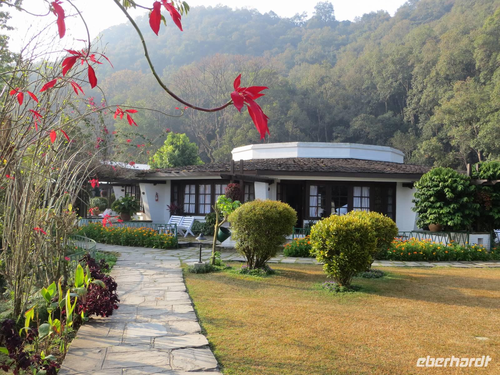 Die zweite, über die der Reiseleiter folglich nicht direkt und mit Fotos berichten kann, ist eine vom realisierten Programmablauf. Hier kann der berichtende Reiseleiter dann nur auf das vom Hörensagen anderer zurückgreifen: Bei Sonnenschein und guter Sicht wurde der Manakamana-Tempel hoch oben auf einem Berg im Ghorkagebiet besichtigt. Sicht über die Mittelgebirgslandschaft Nepals bis zu den Gipfeln des Himalaya. Am zeitigen Abend traf die Gruppe dann im Chitwan-Nationalpark ein. Die Machan Country Villa, ein Lodgeressort bot jedem eine Übernachtung mit gutem Lodgekomfort und einem zentralen Gebäude für das Abendessen. Die Mitarbeiter erwarteten uns bereits mit großem Lagerfeuer und einem Vortrag über den Nationalpark. Dörfliche Laute am Rande des Dschungels begleiteten alle in den Schlaf.