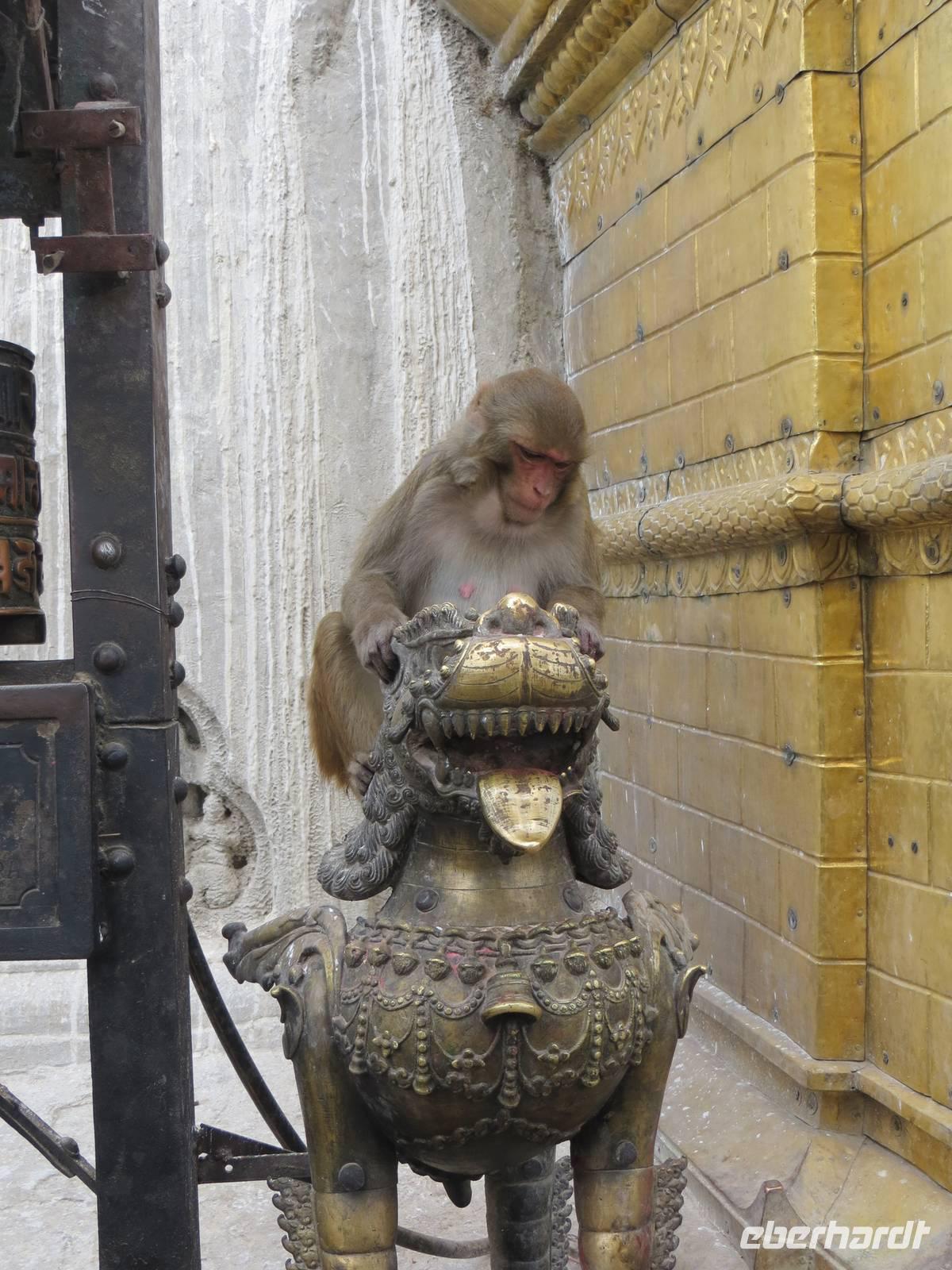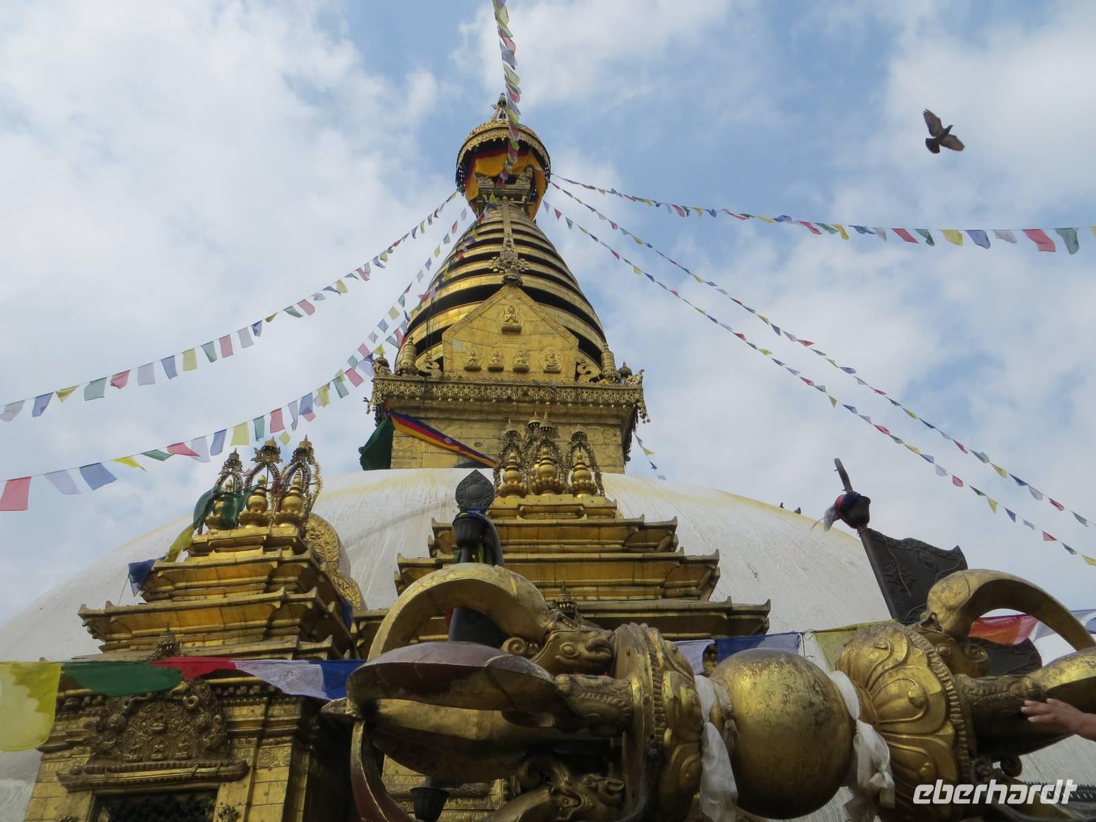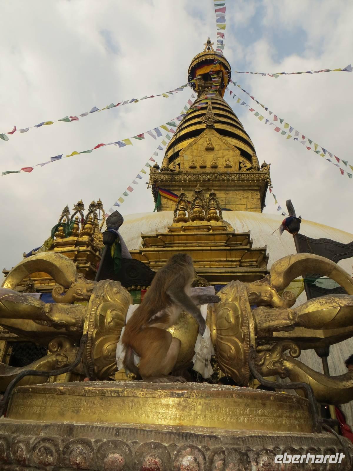 Am späten Vormittag besuchten wir Syambhunath mit dem Affentempel und einer großen Stupa. Selten sind Hinduismus und Buddhismus auch baulich so eng vereint wie auf diesem Hügel im Nordwesten der Stadt. Noch ließen Sonnenstrahlen die vergoldete Stupa glänzen.