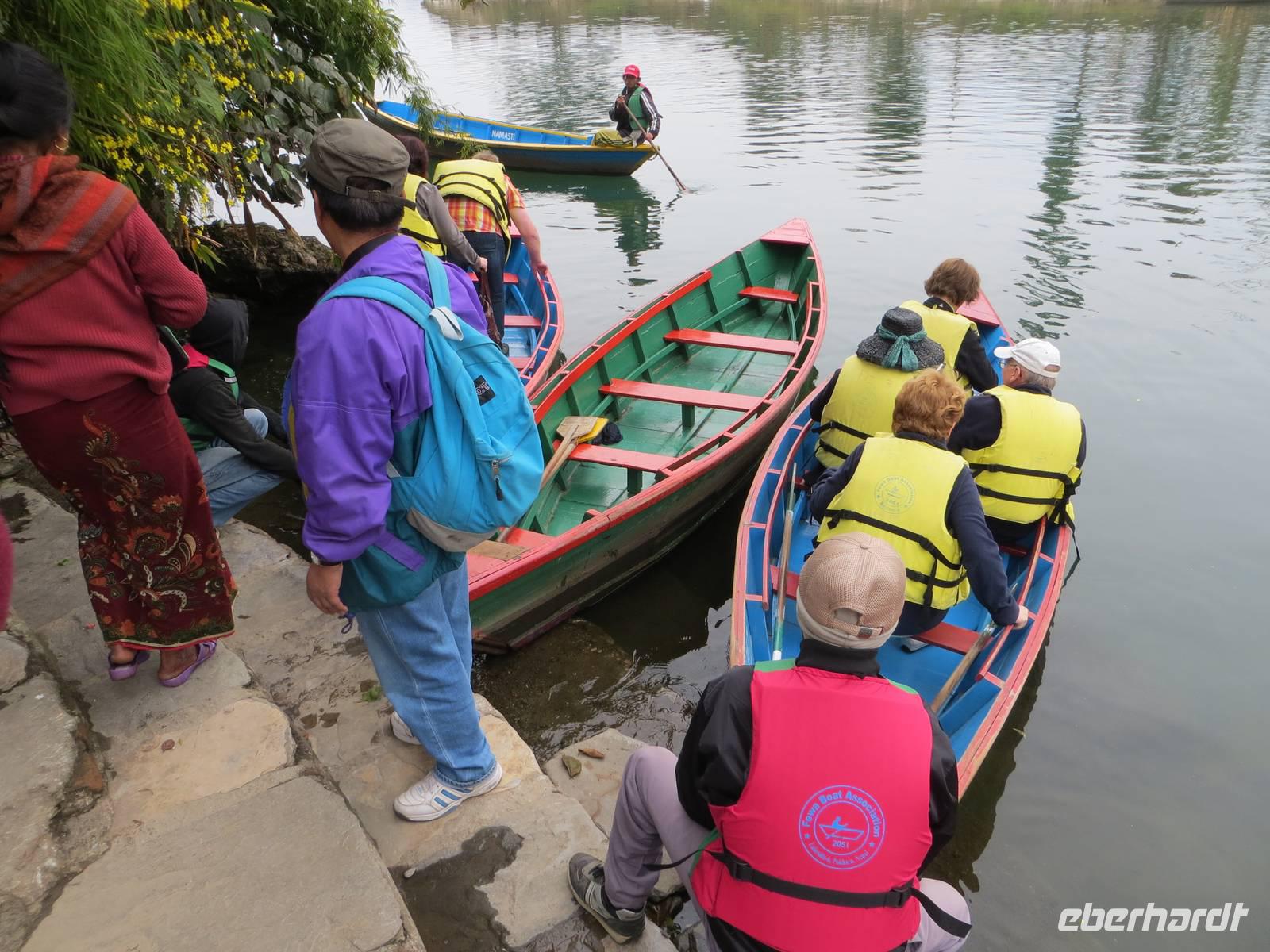Am Nachmittag war es zwar etwas wärmer geworden, aber die Berge blieben verhüllt. Dennoch bestiegen wir die Boote und ließen uns über den See zu einer kleinen Insel mit Tempel paddeln.