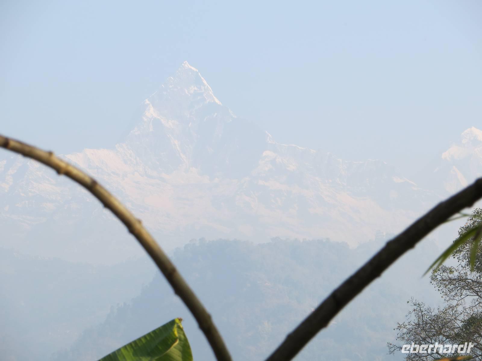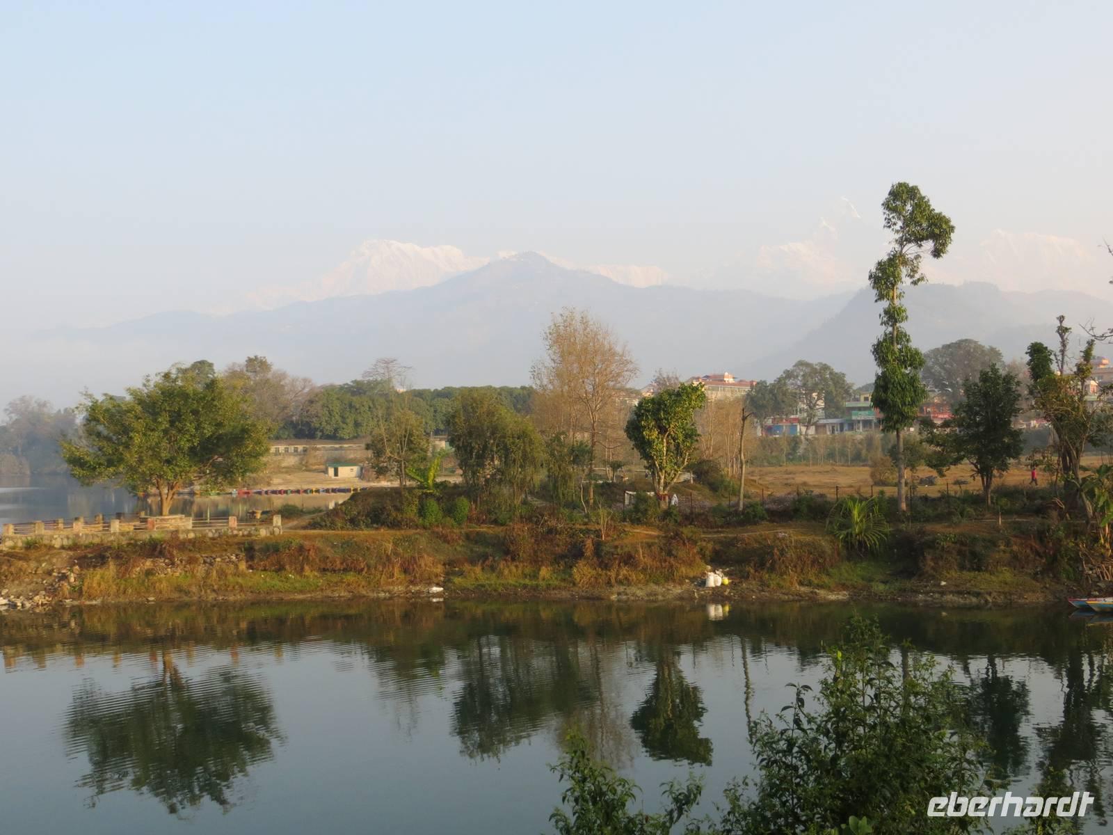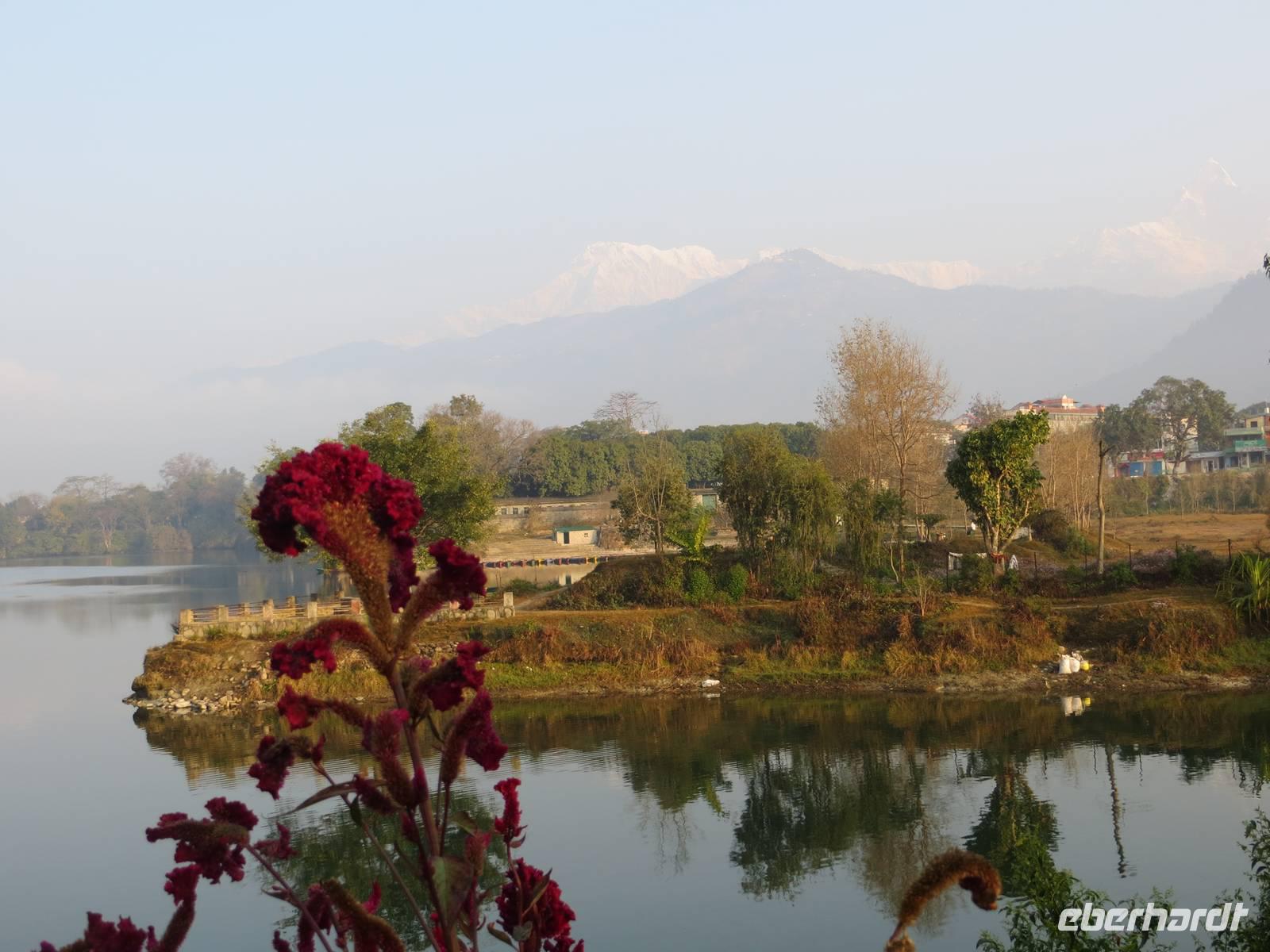 Wir konnten ausschlafen und ein Sonnenblitzeln weckte manchen. Es war zwar etwas milchig, aber die Sonne kam tatsächlich hervor. Bereits vor dem Frühstück wurden so die ersten Bilder von der Annapurna Range und vom Fischschwanz gemacht. Später erkannten wir an der Westseite des Sees auch den Dhaullaigiri und ließen uns die Abfolge der fünf Annapurna-Gipfel und den Tigersprung am Fischschwanz erklären. Tief hinten über einem Schneefeld sahen wir auch Annapurna I, den ersten Achttausender der von Bergsteigern bestiegen wurde.