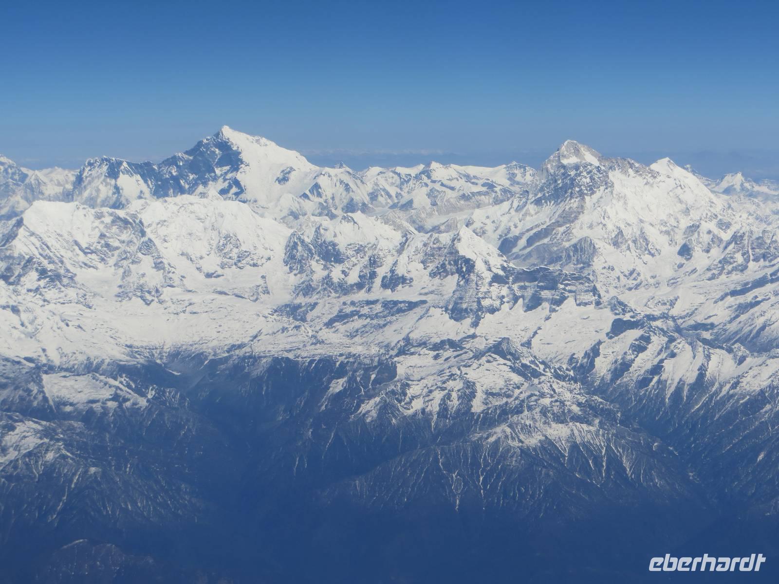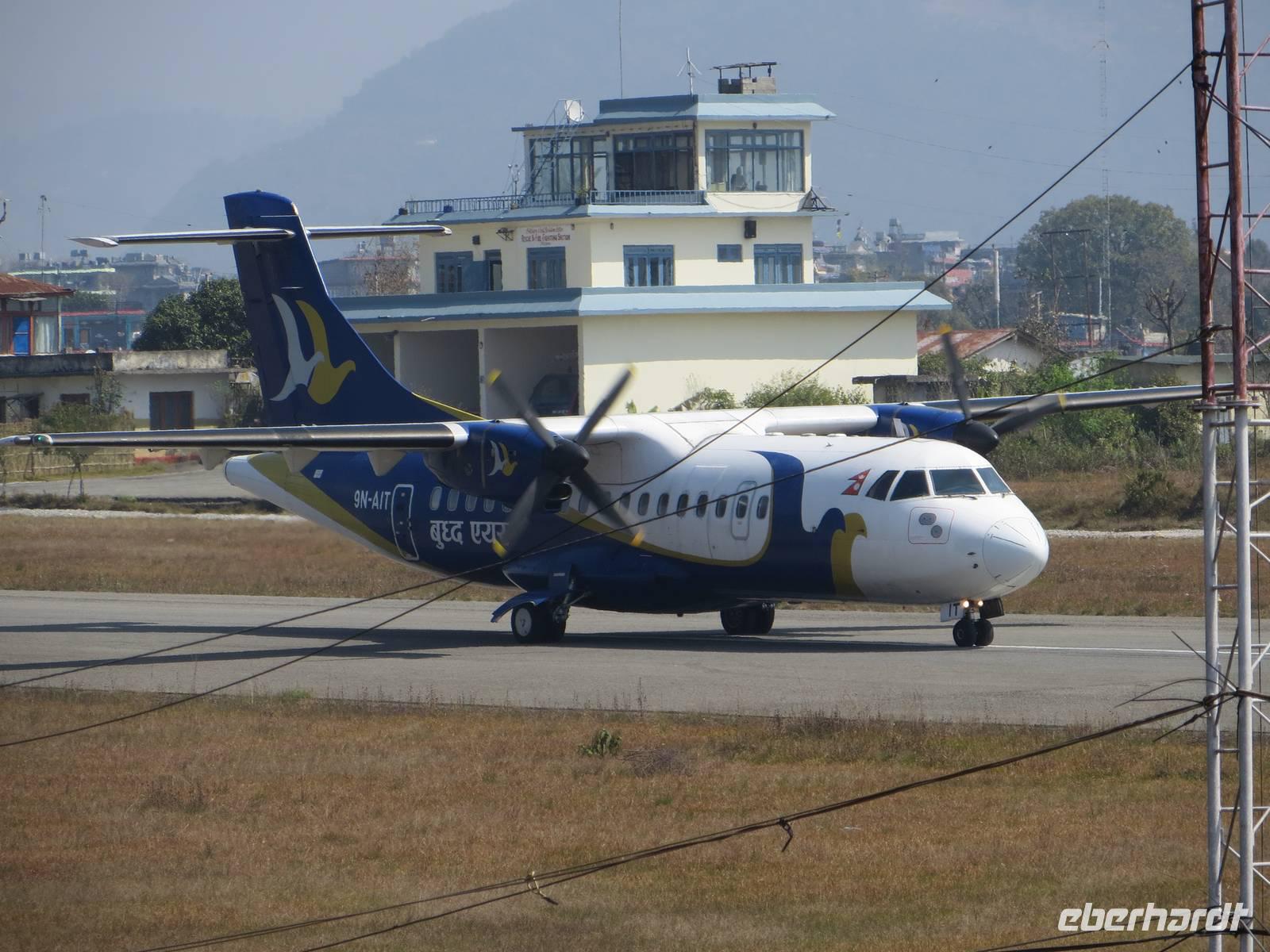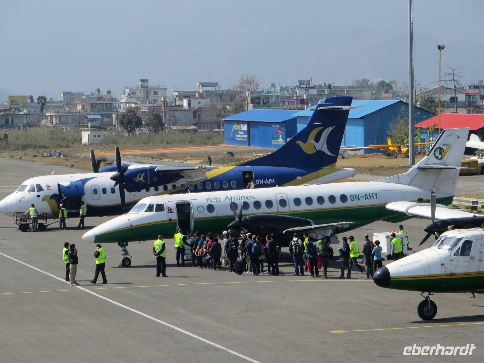 Bereits vor unserer Abfahrt zum Flughafen hatten wir erfahren, dass in Kathmandu wegen Nebels keine Flieger starten können. Das entwickelte sich dann zu einer zweieinhalbstündigen Verspätung bis unsere Beech Aircraft der Buddha Air mit uns abhob. Das Grummeln des Schulterdeckers für 50 Passagiere ist schon etwas gewöhnungsbedürftig. Wer links saß, konnte schon manchen Gipfel des Himalayas sehen.