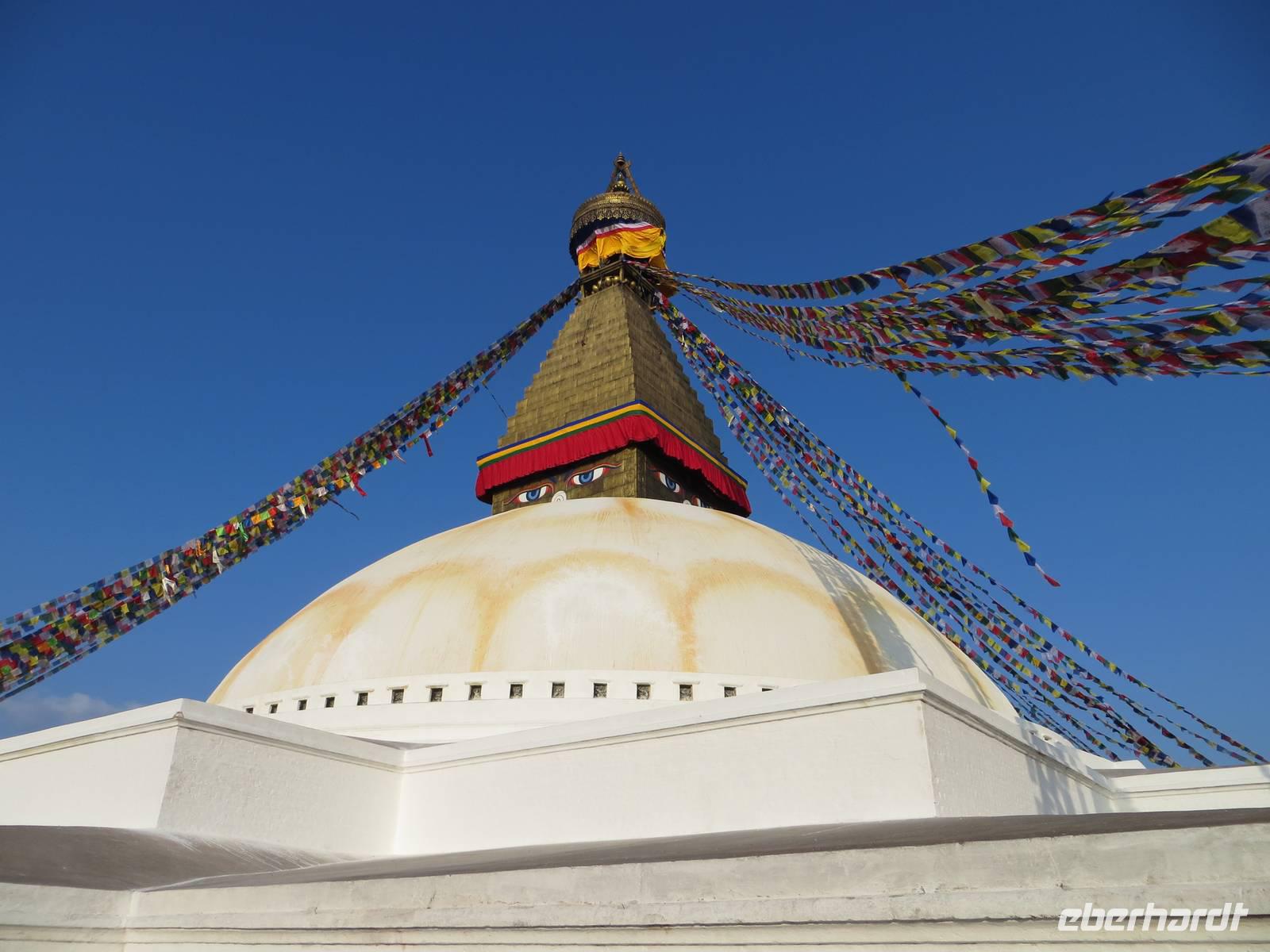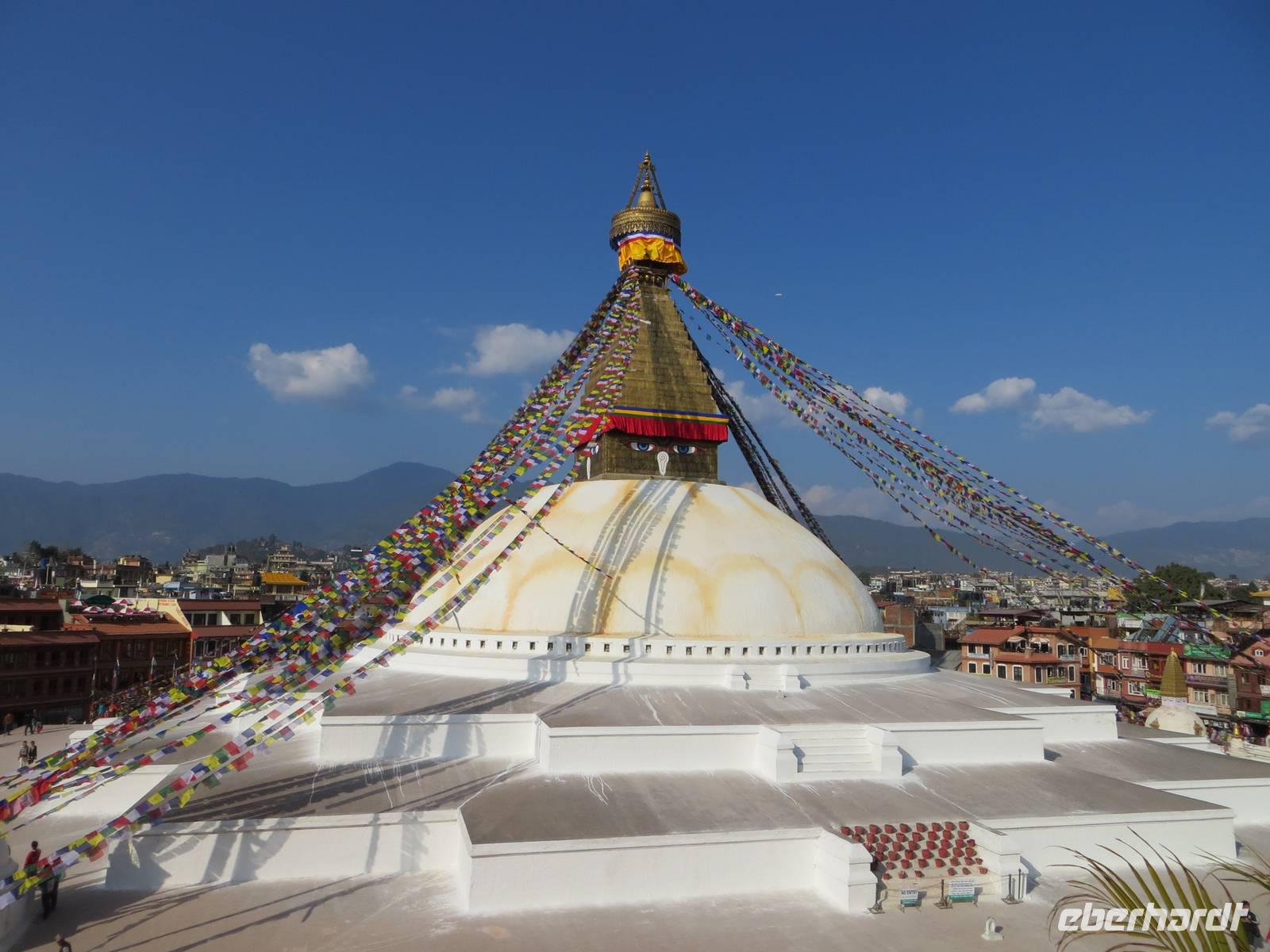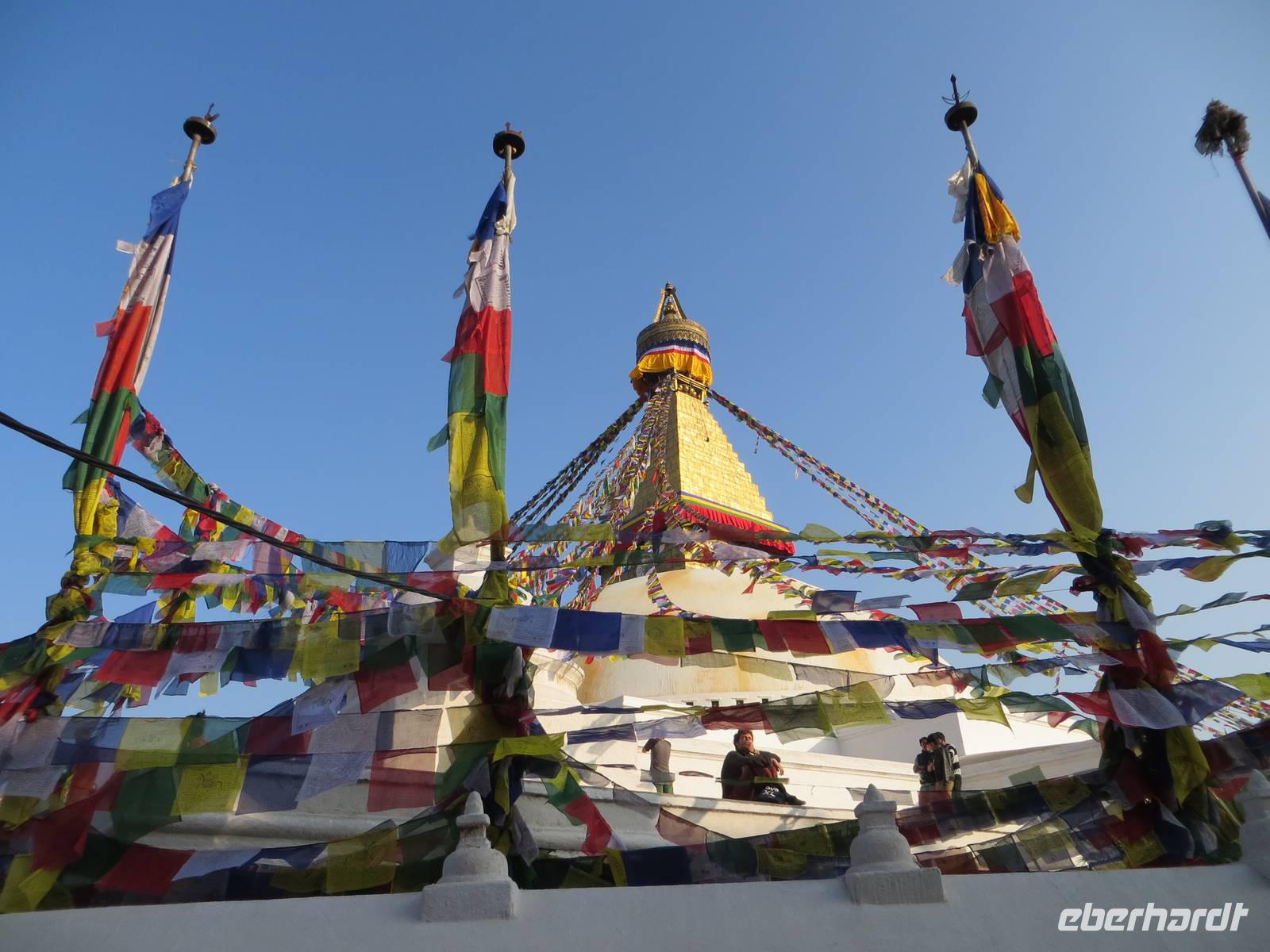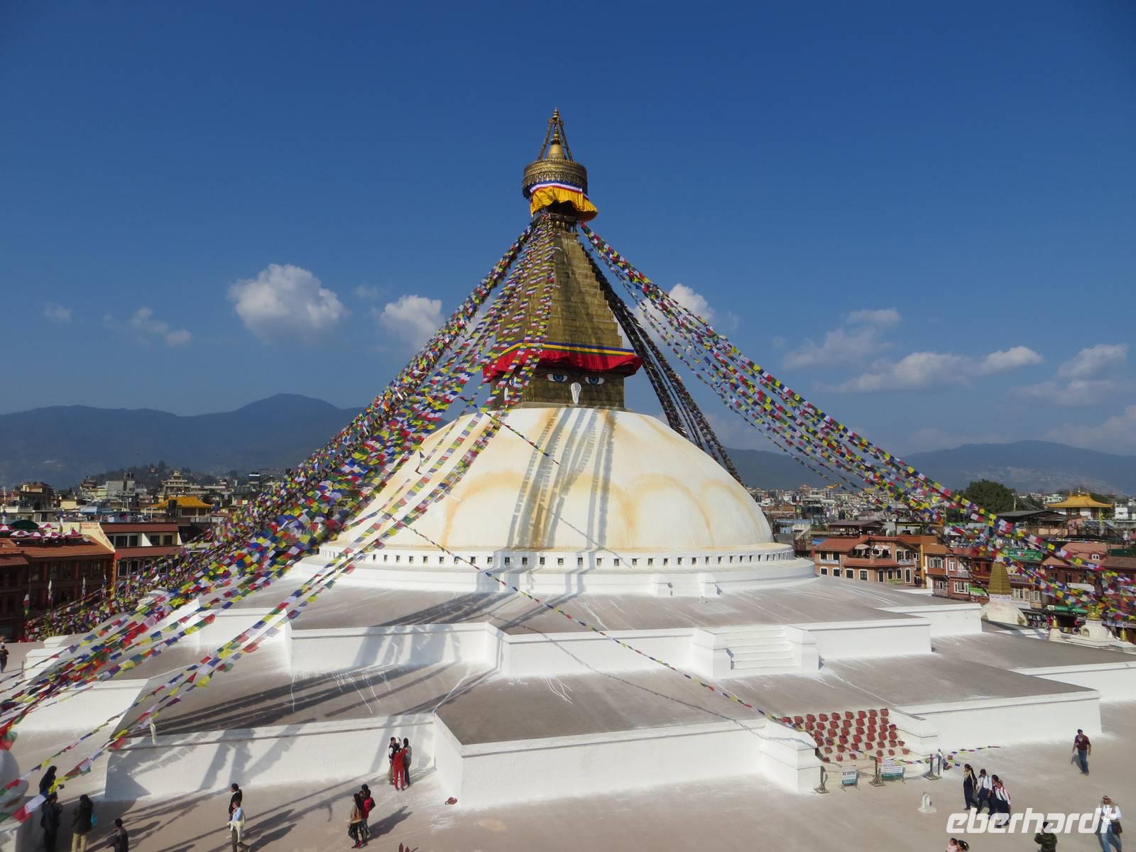 Am Nachmittag besuchten wir Bodnath mit seiner großen Stuppa, deren Weiß im Sonnenlicht glänzte. Schöne Fotomotive der die Stuppa umrandenden Häuser waren mit dem tief stehenden Nachmittagslicht möglich: tibetische wie hinduistisch geprägte Architektur im Rund; Klänge von Om mani padmi um, Mandalamalerei und ein endloser Strom von buddhistischen Pilgern prägten unsere Eindrücke. Am späten Nachmittag fuhren wir durch das belebte Kathmandu zum bekannten Hotel Himalaya in Patan.