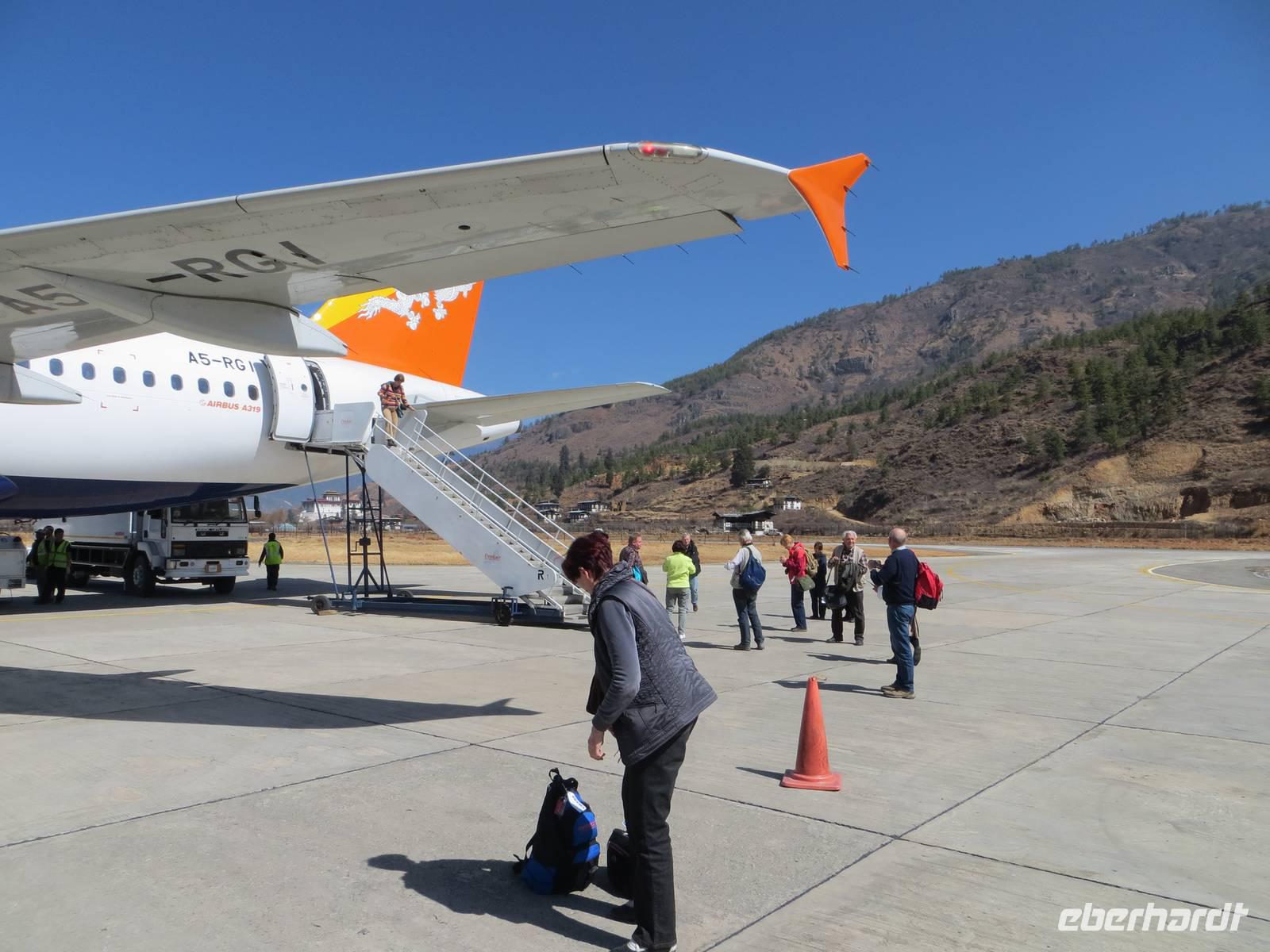 Zeitiges Wecken und Frühstück waren heute erforderlich, um drei Stunden vor Abflug am Flughafen in Kathmandu zu sein. Mit Druk Air, der Königlichen Fluggesellschaft von Bhutan, flogen wir von Kathmandu nach Paro, dem Einreiseflughafen Bhutans. Bereits wenige Flugkilometer hinter Kathmandu konnten wir das Panorama des östlichen Himalaya bestaunen: nach 15 min die 8000er um den Evererest (mit Makalu, Cho Oyu, Lhotse) und wenige Minuten später den prächtigen Kantschendzonga, den dritthöchsten Berg der Erde im Grenzgebiet von Nepal, Sikkim und China. Wir überflogen Sikkim und linker Hand bot sich ein Blick auf die chinesischen Berge; bevor wir nach Bhutan einflogen. Durch die Täler sich windend wurde der Flughafen von Paro angesteuert. Nach etwas langwierigen aber unkomplizierten Einreisemodalitäten begrüßte uns Tenzing, unser örtlicher Reiseleiter.