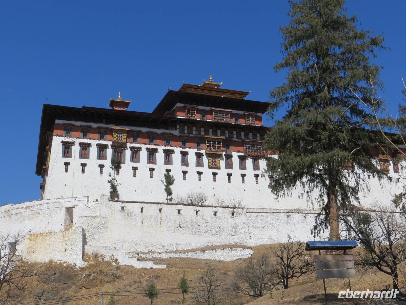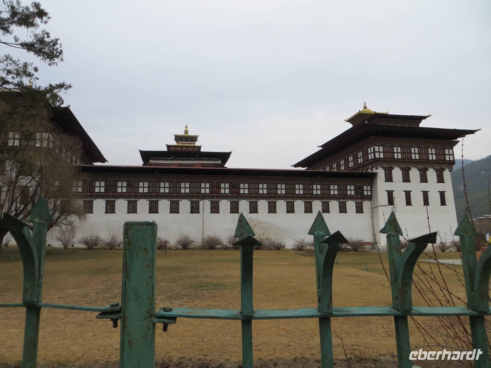 Pünktlich zum Büroschluss im Regierungspalast standen wir zum nun möglichen Einlass in den Thimphu-Dzong bereit. Der König selbst wohnt in einem eher unscheinbaren Haus in Palastnähe. Die alte Burganlage (Dzong), mit ersten Gebäuden aus dem 17. Jahrhundert, dient heute sowohl als Sommersitz für die religiöse Obrigkeit des Landes als auch als Arbeitsgebäude der Regierung und des Königs. Morgen geht es nach Punakha, dem Wintersitz des geistlichen Oberhaupts der hiesigen Rotmützen und in die einstige Hauptstadt.