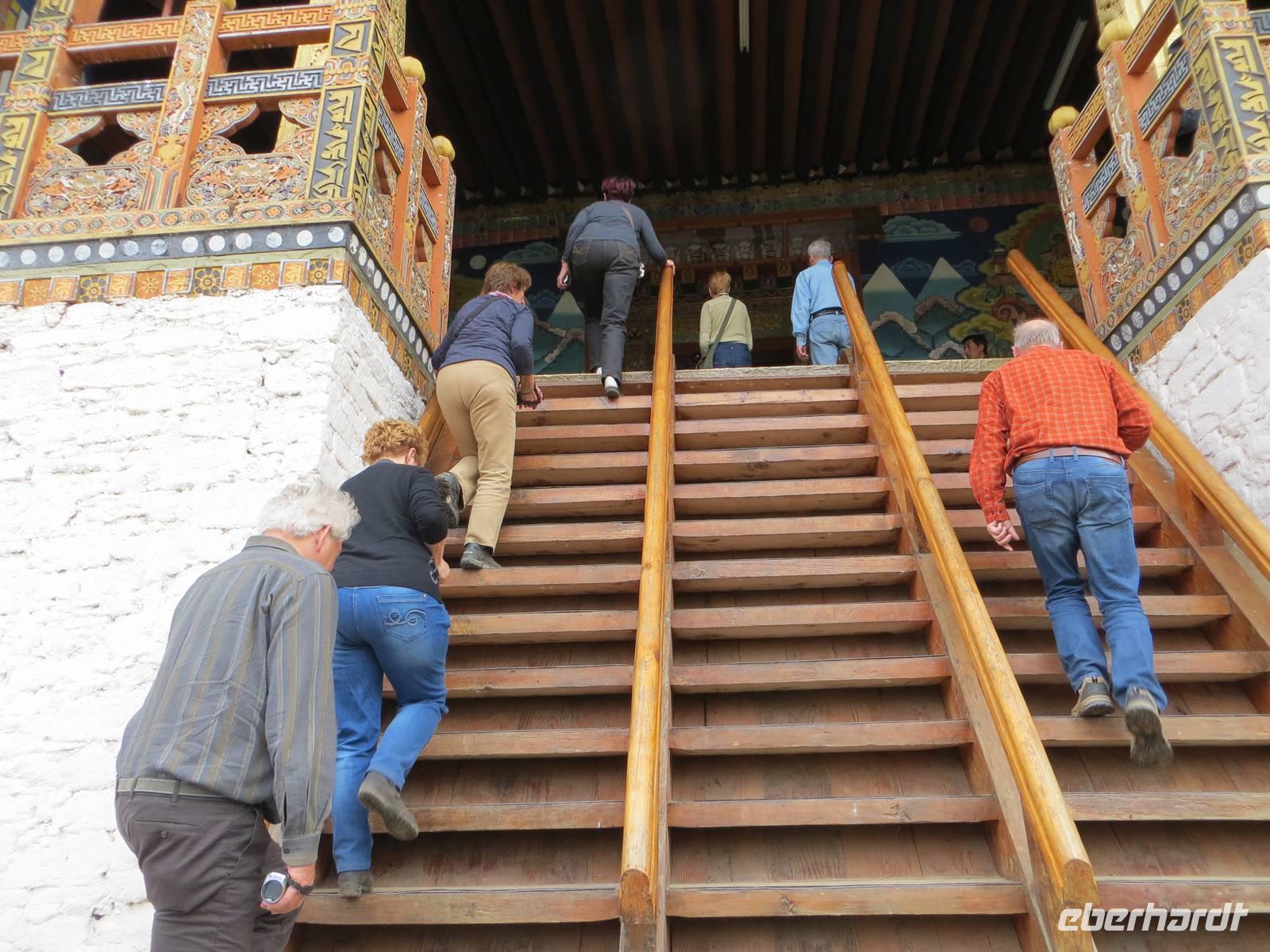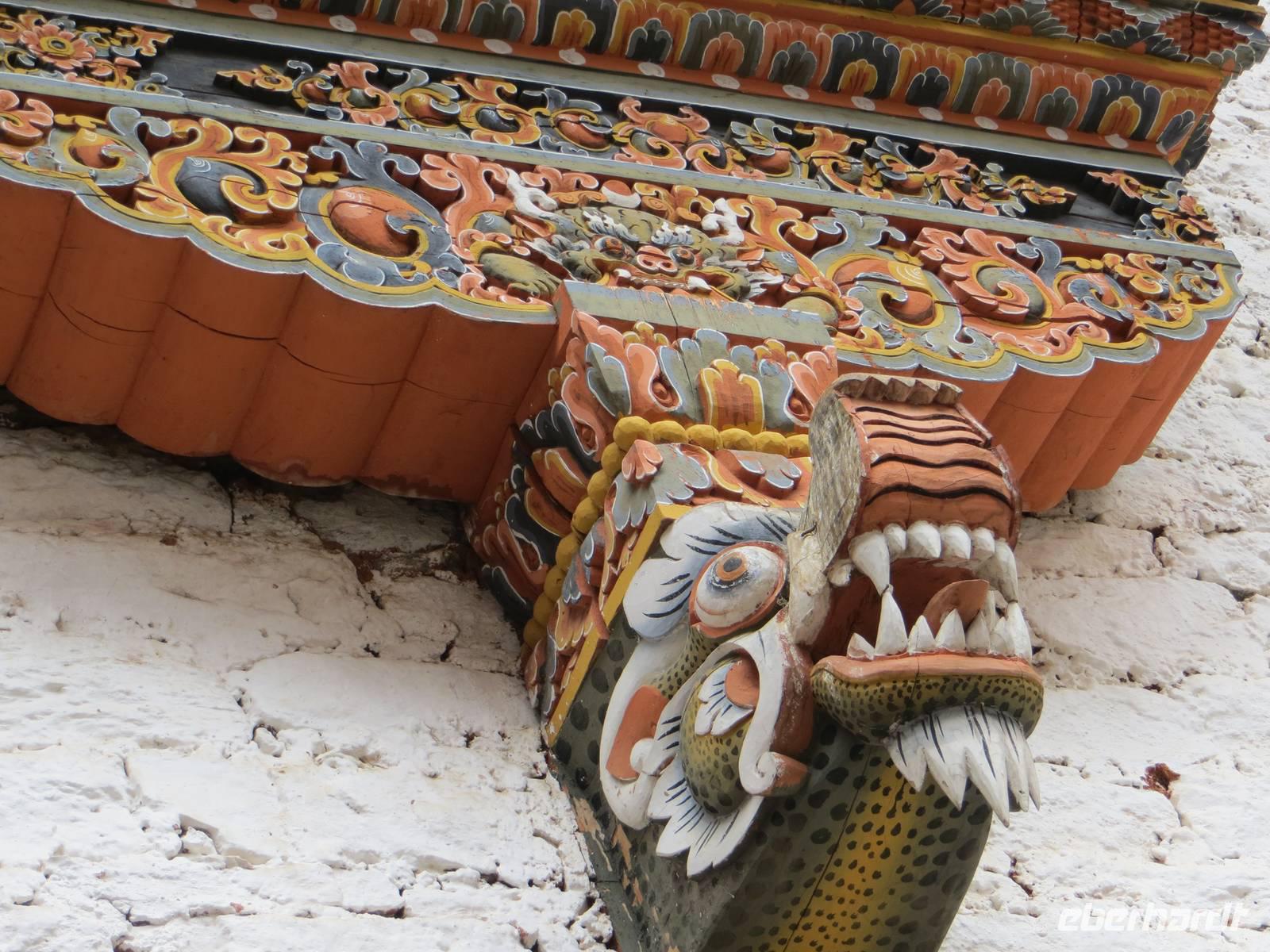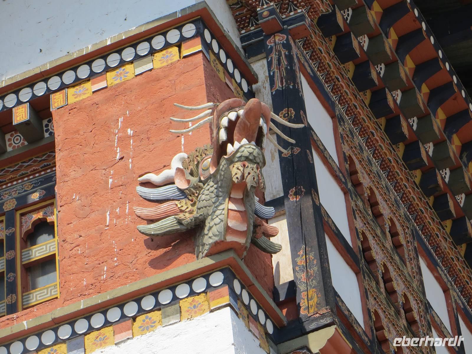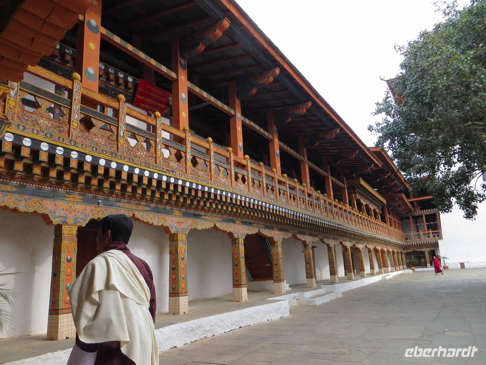 Zum Start unseres Aufenthaltes besichtigten wir den Dzong von Paro, eine alte Festung mit buddhistischem Kloster. Kaum zu glauben, dass vor dreihundert Jahren die Herrschenden hier im Prinzip eine Burg nicht anders bauten als in Mitteleuropa: hohe Festungsmauern, Brücke zur Vorburg, Wohnturm, Burgvorhof und Ober- oder Haupthof. Farbige Holzbalken und budddistische Bemalungen faszinierten uns ebenso wie der große Versammlungssaal der Mönche.
