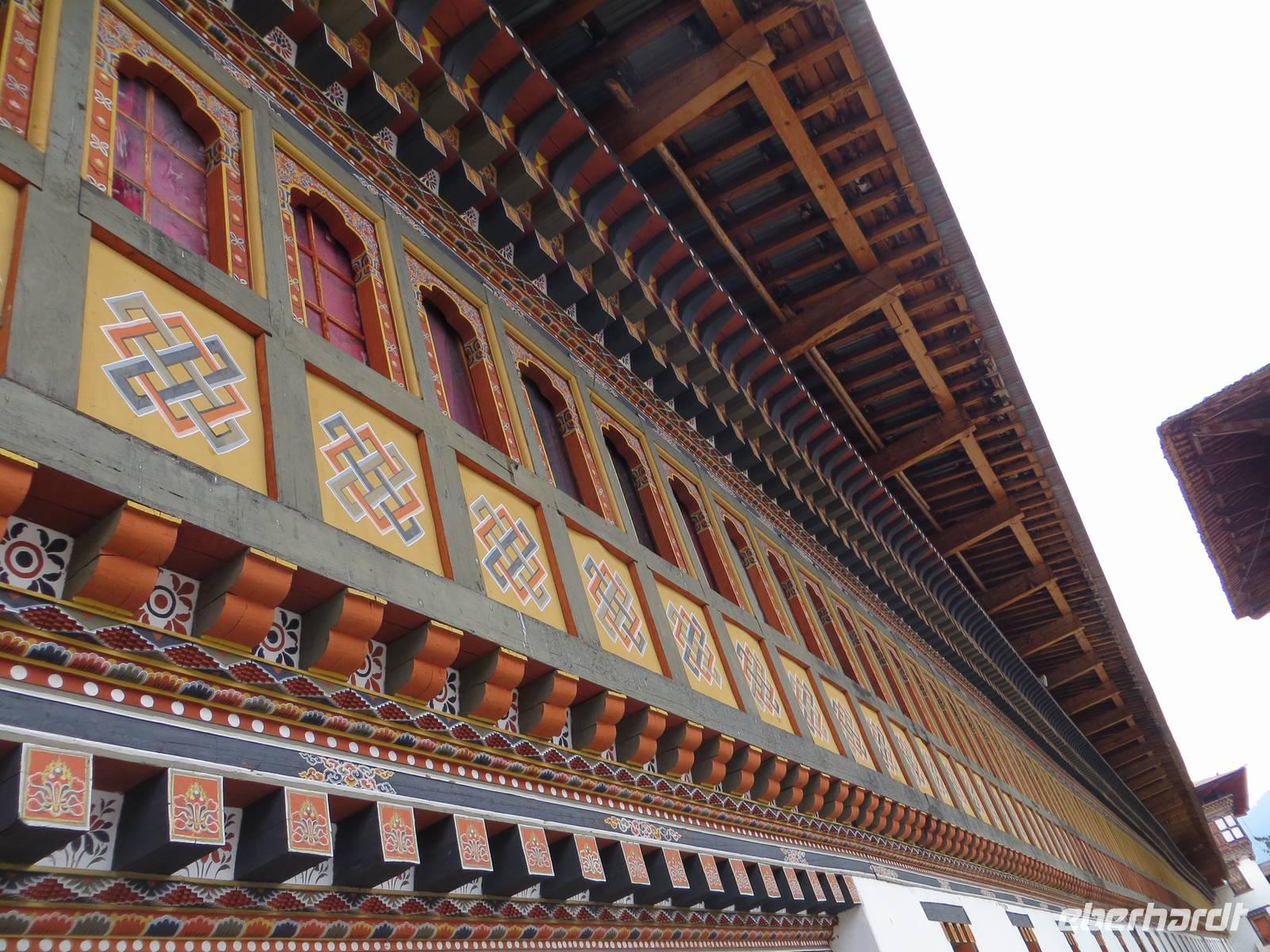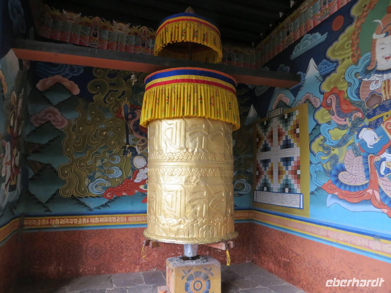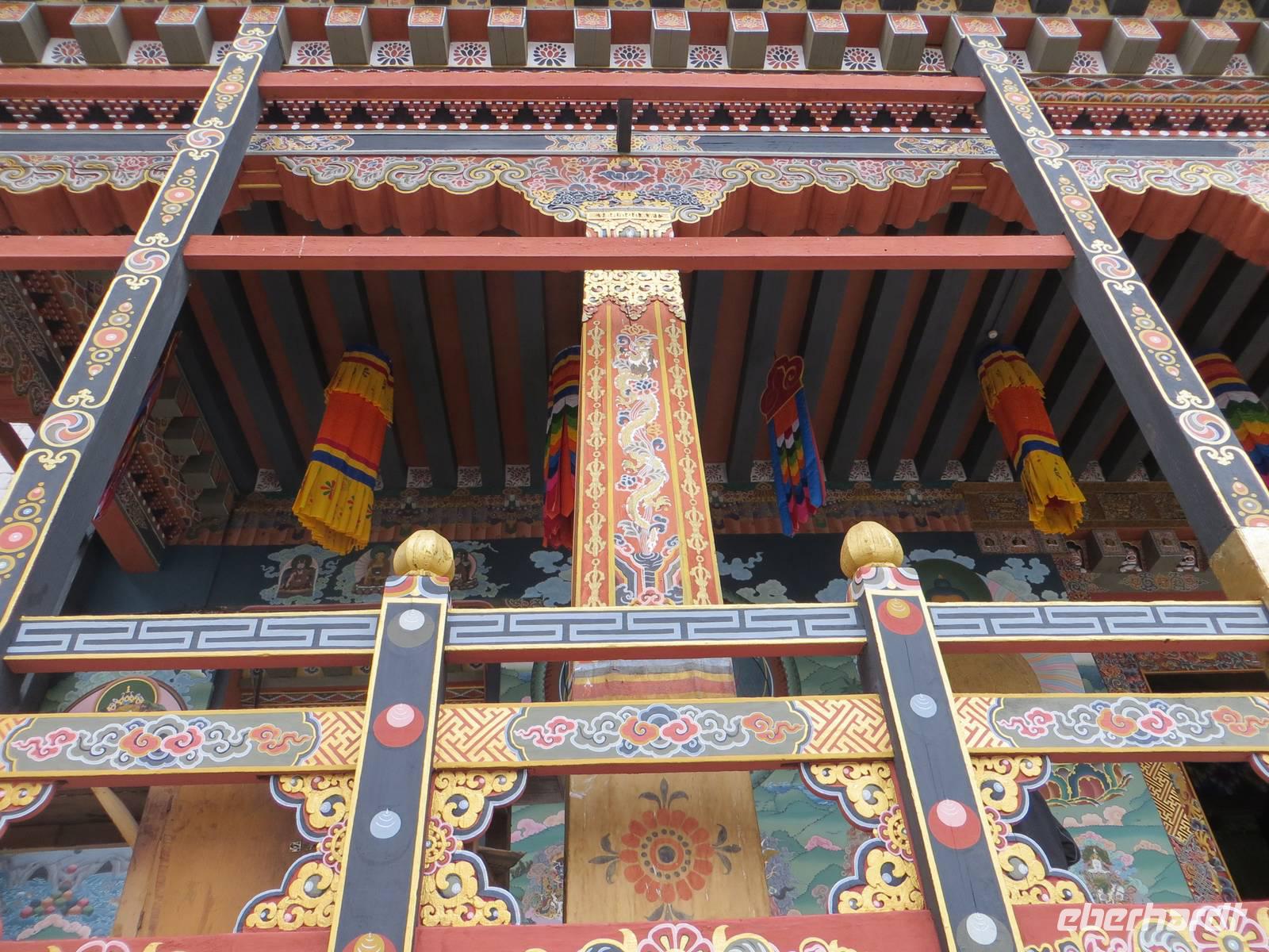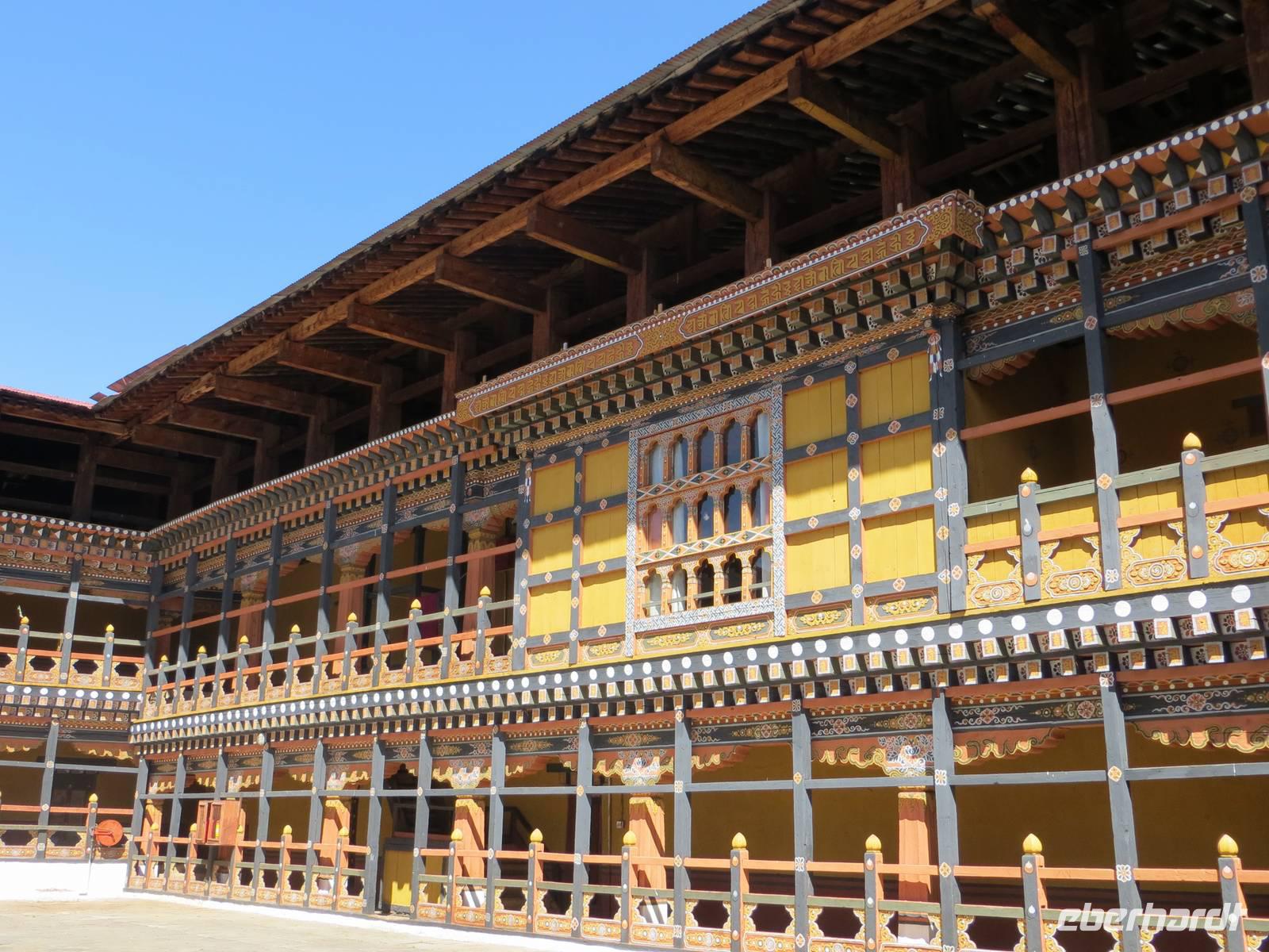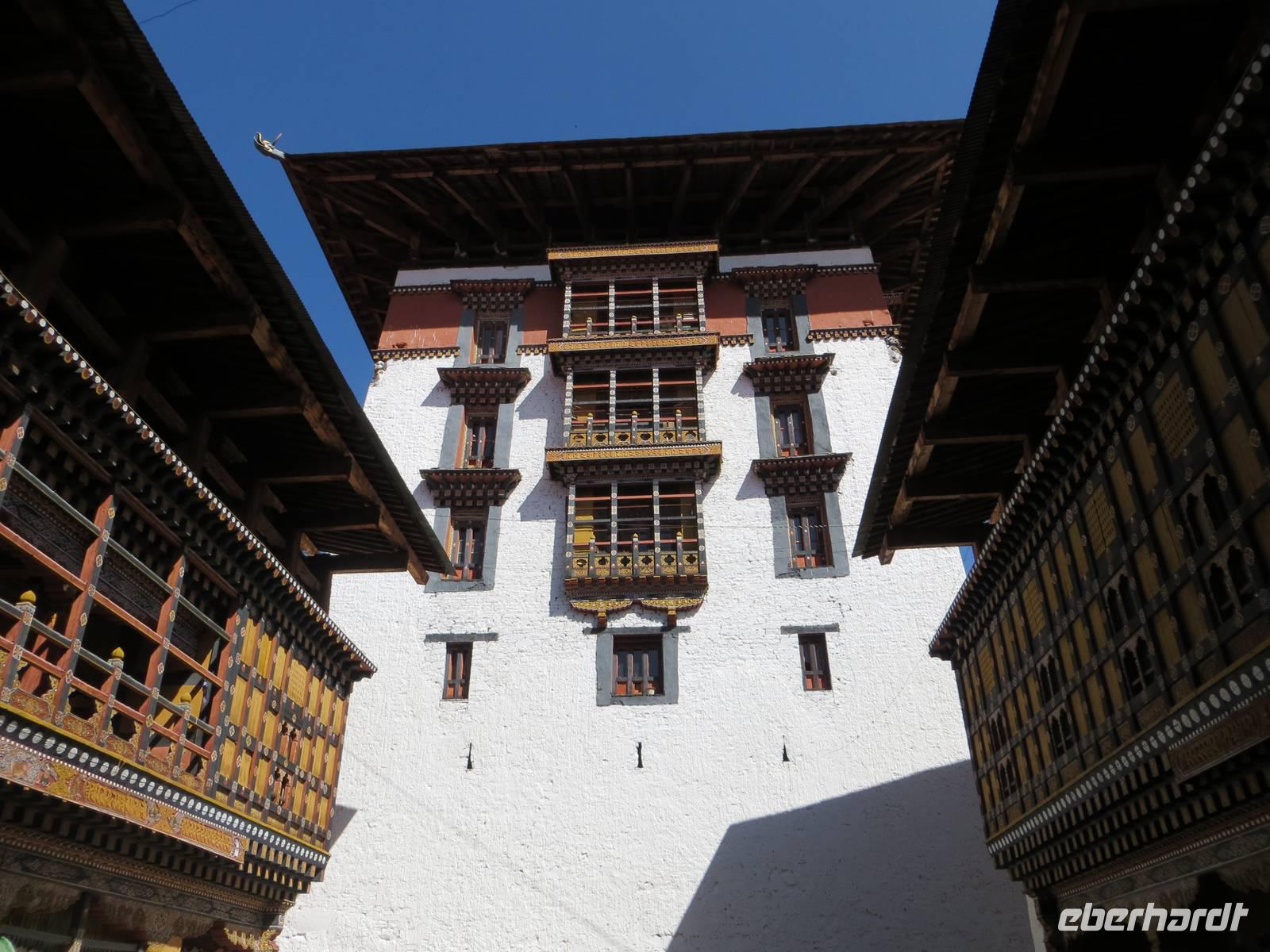 Zum Start unseres Aufenthaltes besichtigten wir den Dzong von Paro, eine alte Festung mit buddhistischem Kloster. Kaum zu glauben, dass vor dreihundert Jahren die Herrschenden hier im Prinzip eine Burg nicht anders bauten als in Mitteleuropa: hohe Festungsmauern, Brücke zur Vorburg, Wohnturm, Burgvorhof und Ober- oder Haupthof. Farbige Holzbalken und budddistische Bemalungen faszinierten uns ebenso wie der große Versammlungssaal der Mönche.