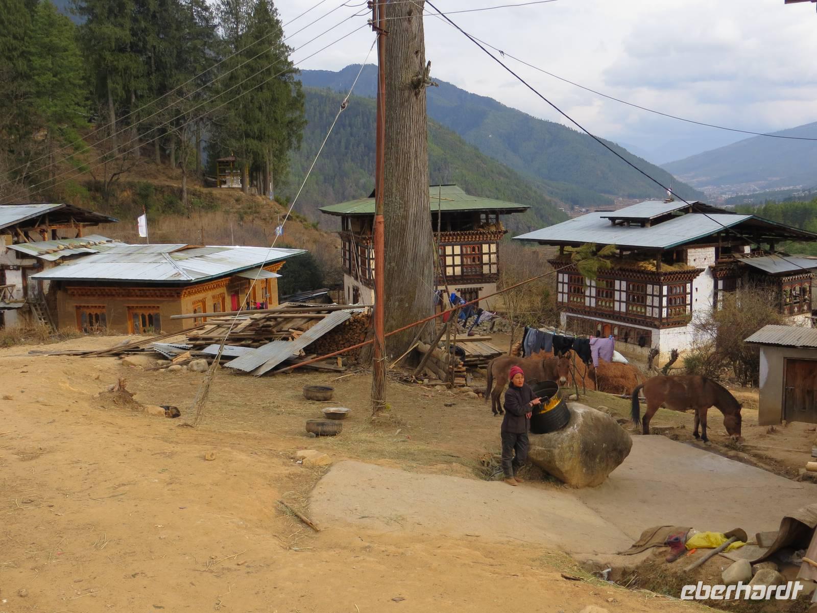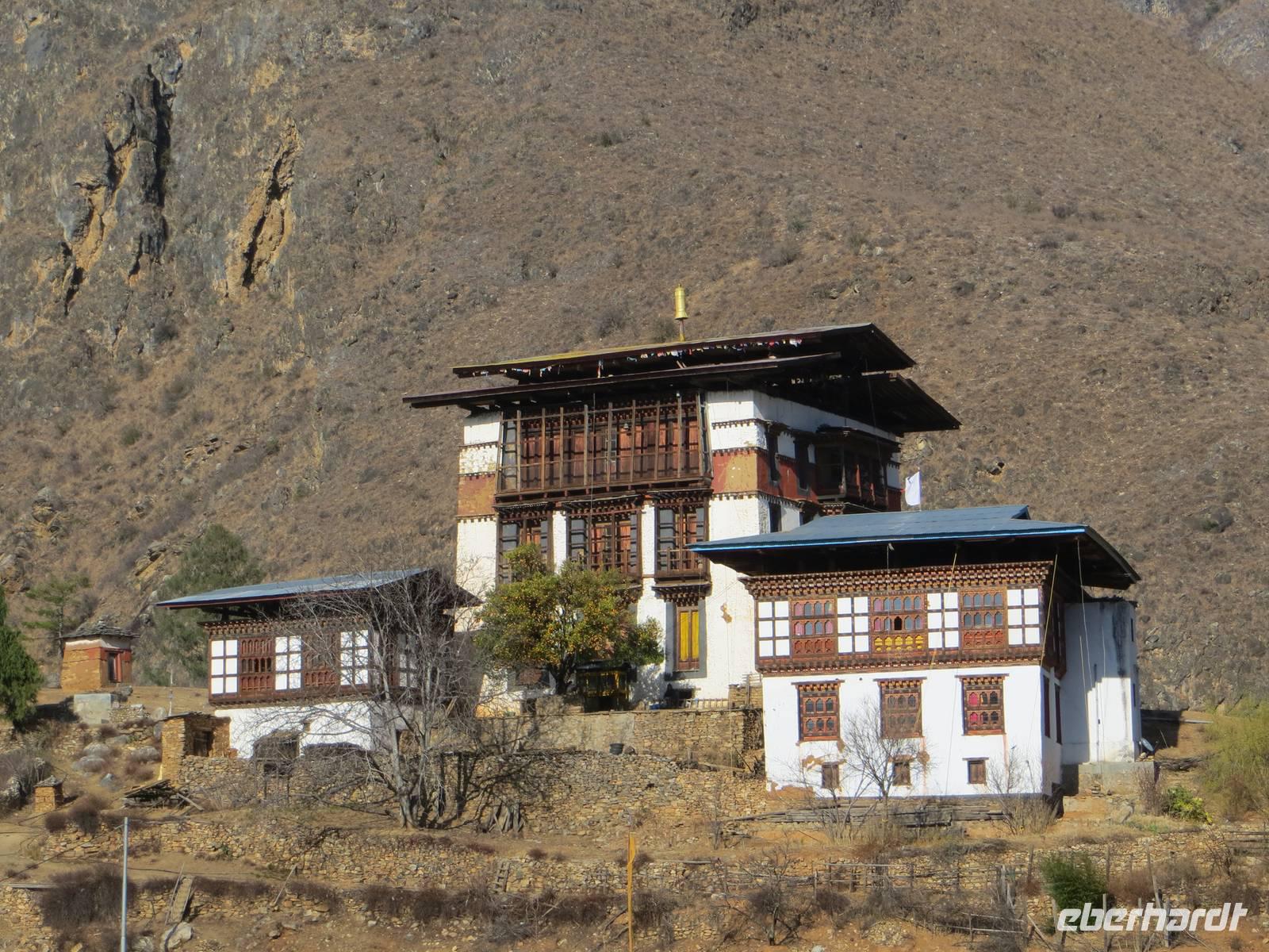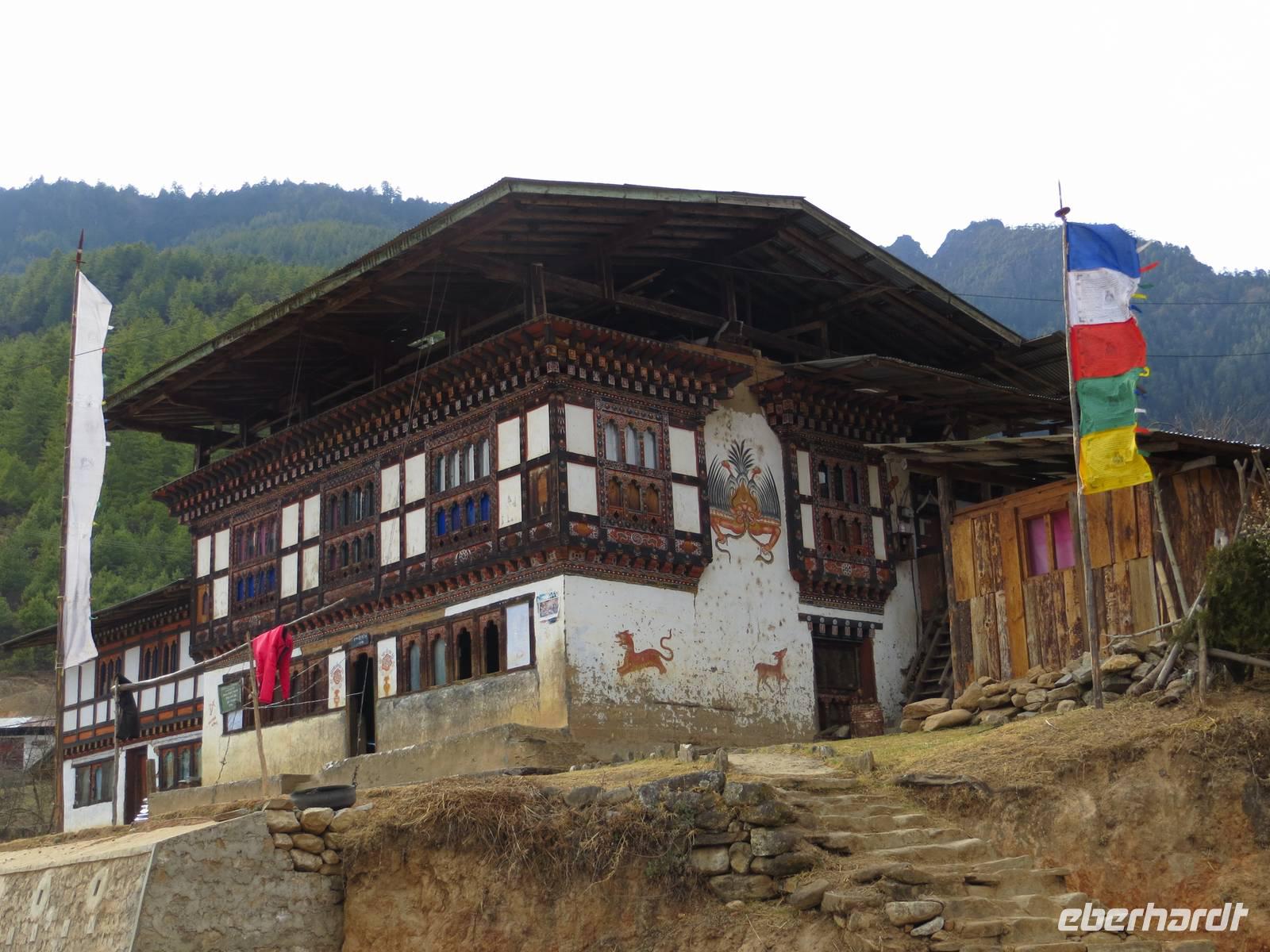 Nach dem Mittagessen im bekannten Hotel in Thimphu fuhren wir nach Paro. Im Paro-Tal steht hier mit dem Kijuchu Lakhang-Kloster, das älteste Kloster Bhutans mit Reliquien aus dem 7. Jahrhundert. Auf recht holpriger Straße fuhren wir in ein oberes Talende und stoppten unterhalb des Tigernestes. Im Ort am Ende der Straße steht das Haus von Phub unserem Fahrer. Er und seine Frau luden uns zur Besichtigung ein und schenkten Buttertee und einen Reisschnapps aus.