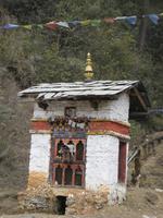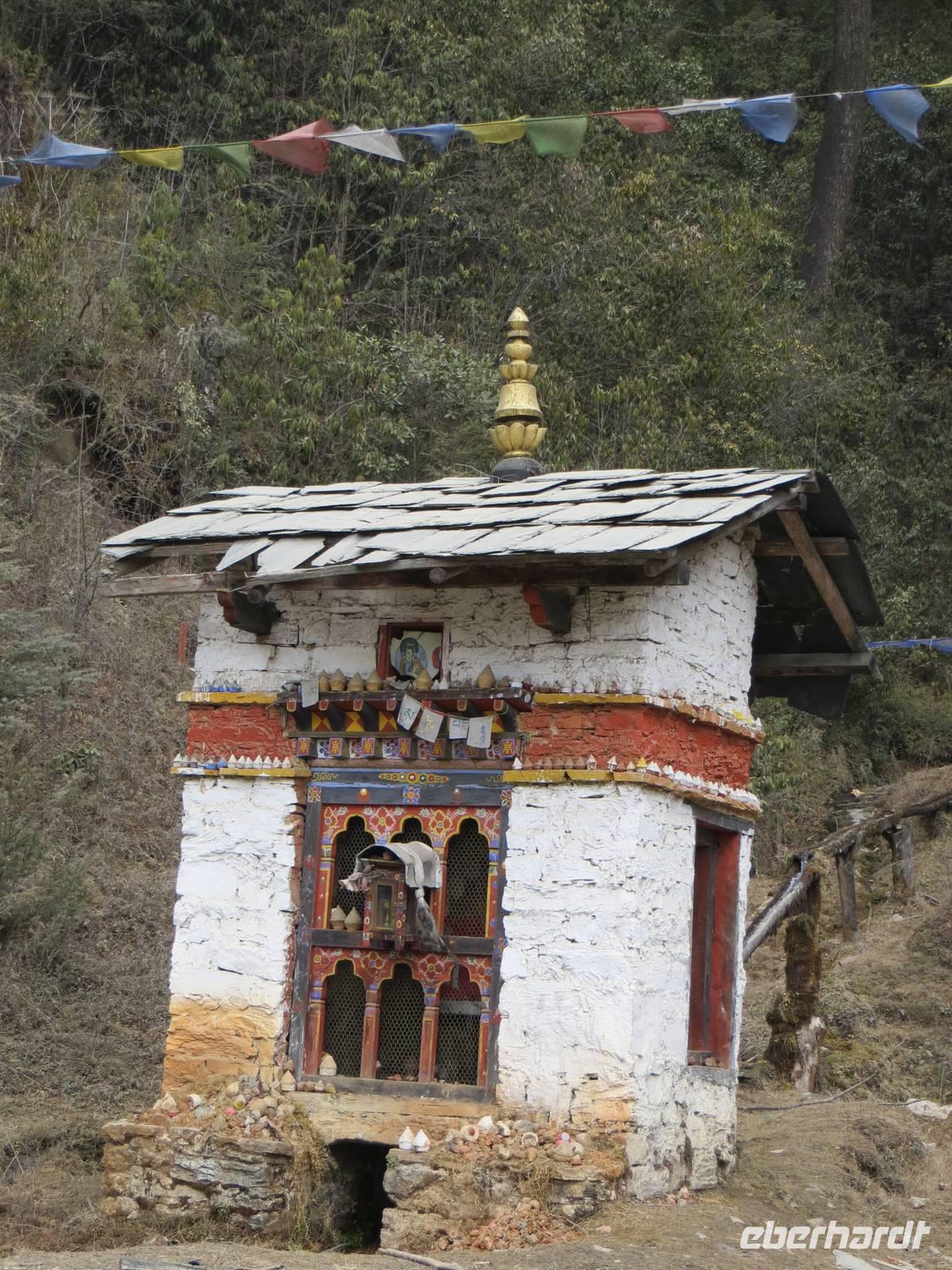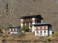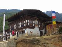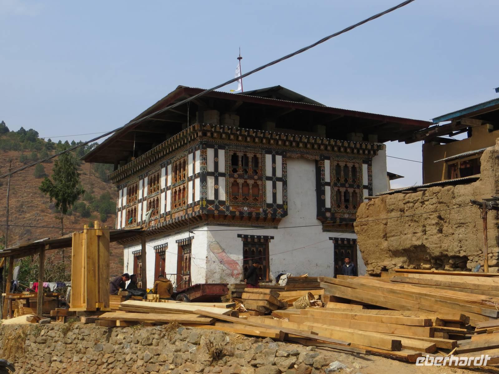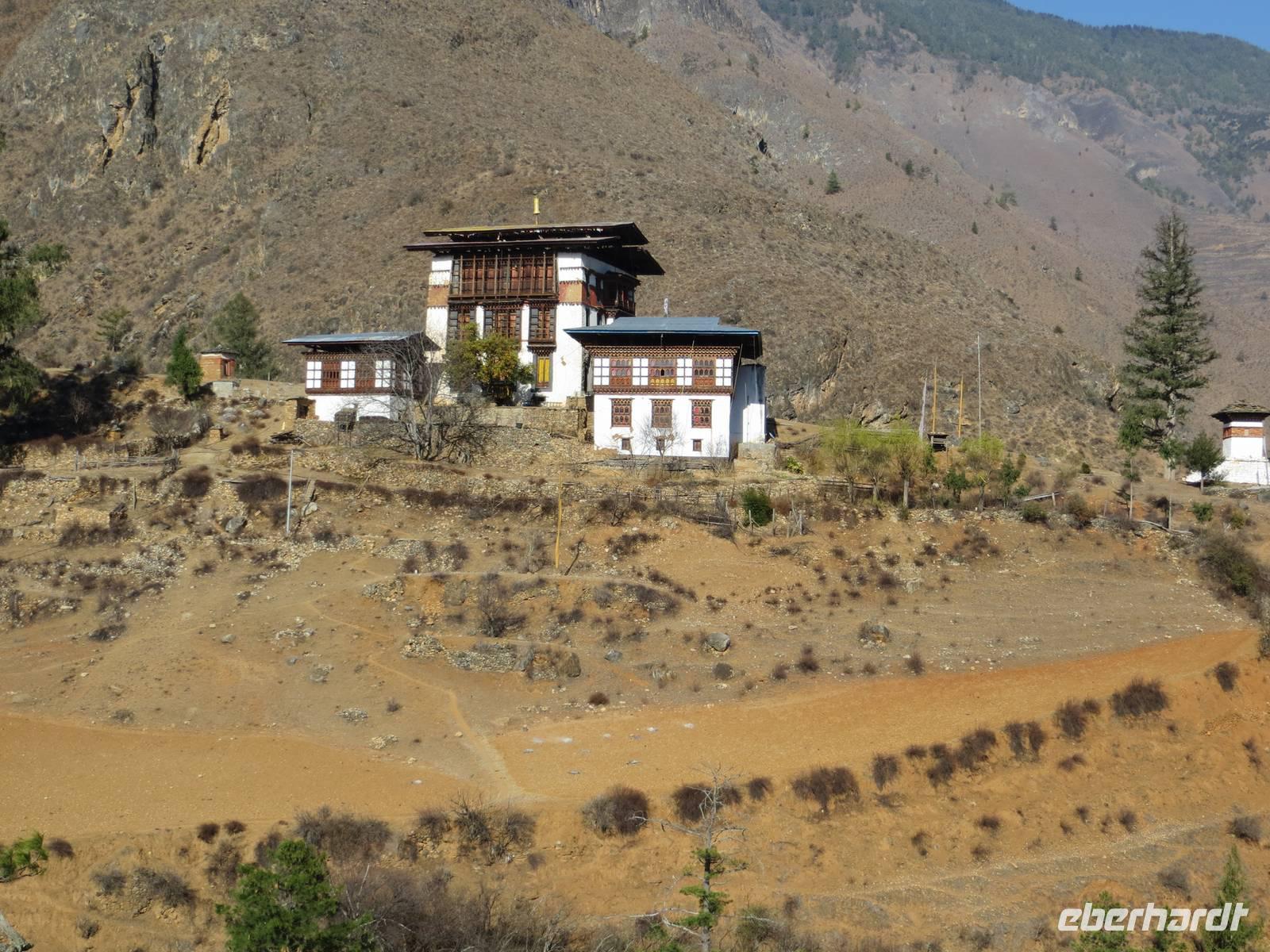 Nach dem Mittagessen im bekannten Hotel in Thimphu fuhren wir nach Paro. Im Paro-Tal steht hier mit dem Kijuchu Lakhang-Kloster, das älteste Kloster Bhutans mit Reliquien aus dem 7. Jahrhundert. Auf recht holpriger Straße fuhren wir in ein oberes Talende und stoppten unterhalb des Tigernestes. Im Ort am Ende der Straße steht das Haus von Phub unserem Fahrer. Er und seine Frau luden uns zur Besichtigung ein und schenkten Buttertee und einen Reisschnapps aus.