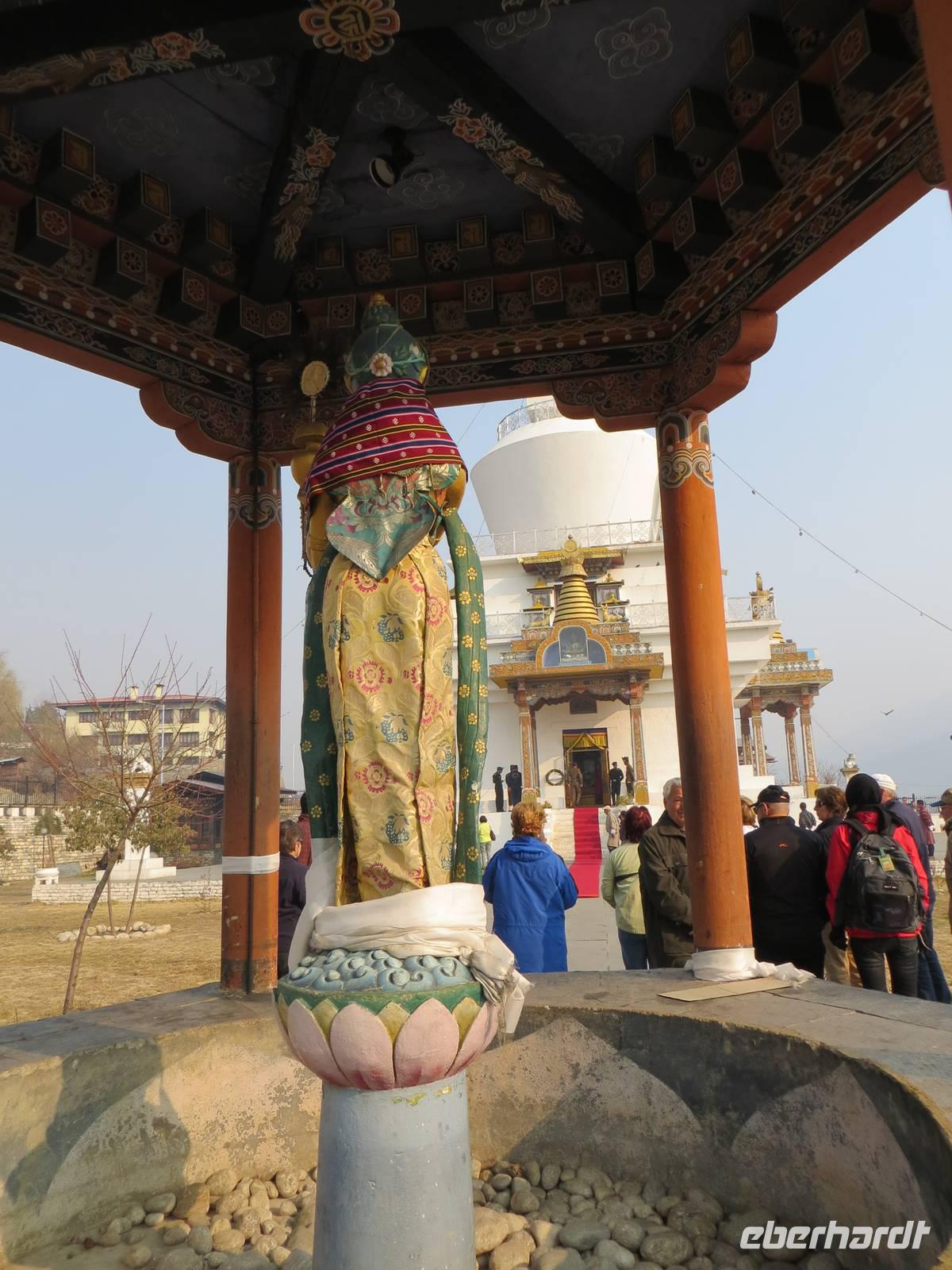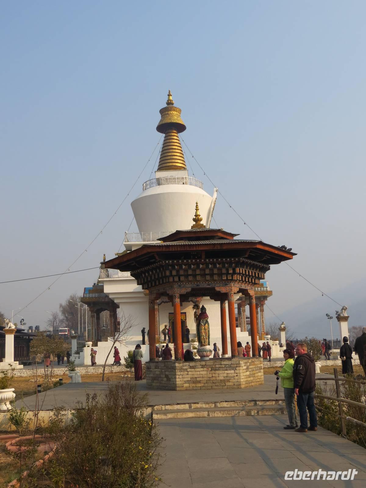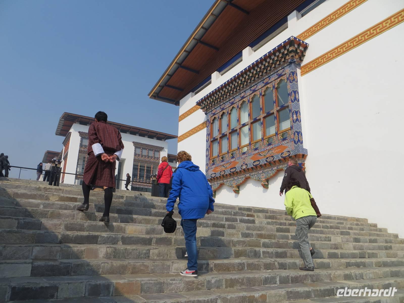 Ein ganzer Tag für die 70.000 Einwohner zählende Hauptstadt des Landes stand uns zur Verfügung. Leider gab es in der Umgebung Waldbrände, so dass alles recht bedeckt-diesig qar. Zunächst stoppten wir am Gedächtnis-Chörte für den 3. König Bhutans. Hohe indische Militärs hatten sich angesagt, so dass schon der rote Teppich ausgerollt war. Viele Gläubige umrundeten die Chörte und warfen sich als Zeichen der Gottverehrung nieder. Anschließend hielten wir an der Post Bhutans, die bekannt ist für die Herausgabe mannigfaltiger Briefmarken für die Sammler in der ganzen Welt. Auch die Produktion individueller Briefmarken war möglich und machte uns allen viel Spaß.