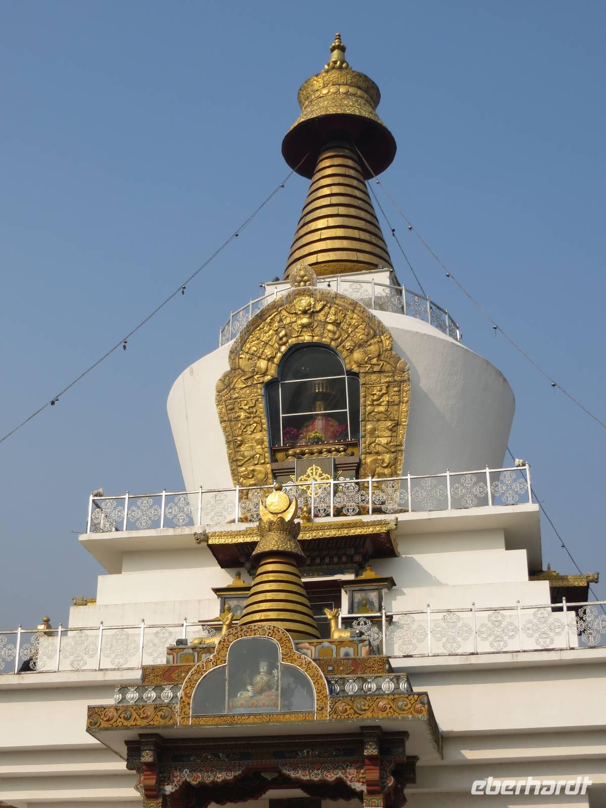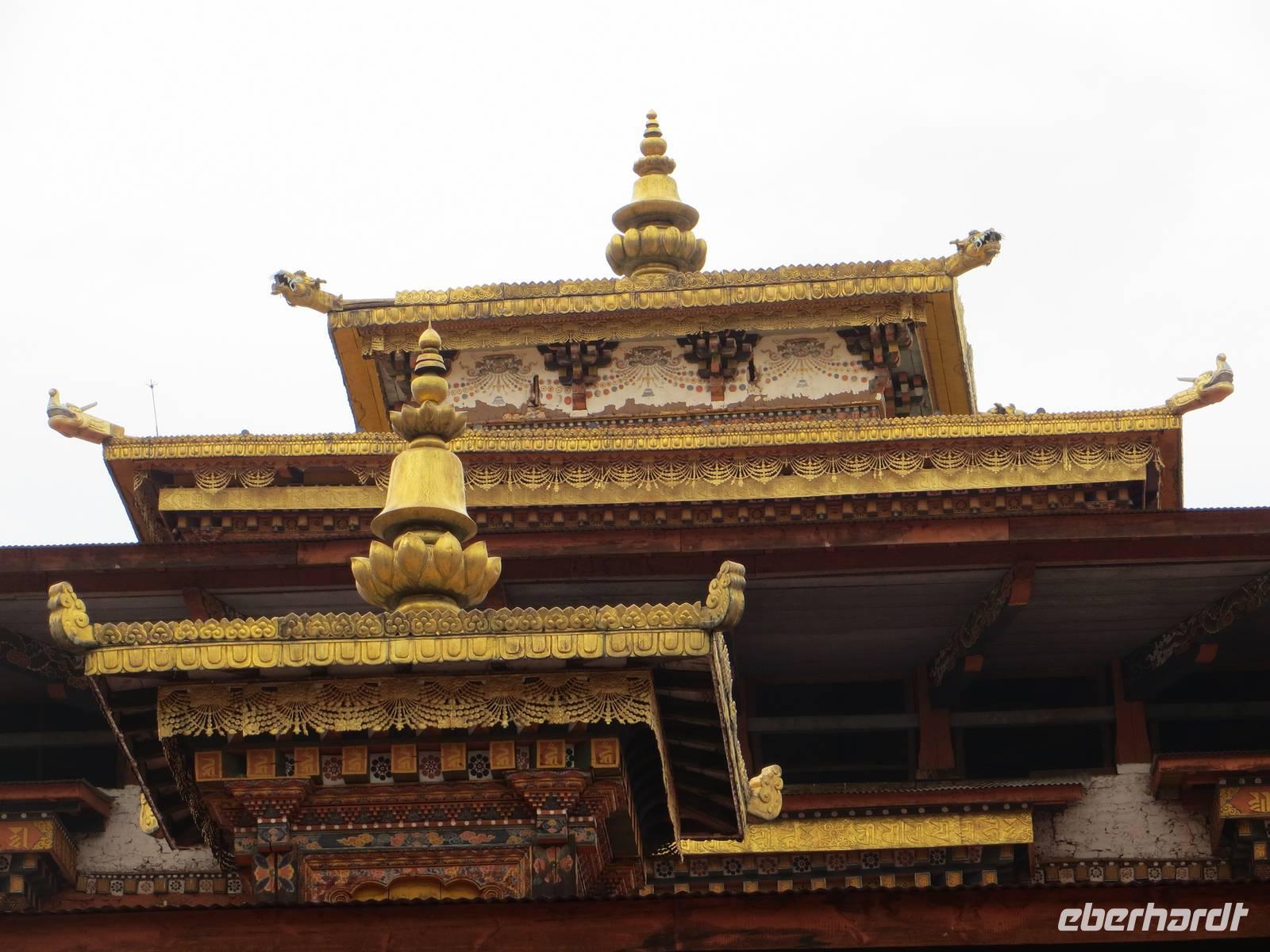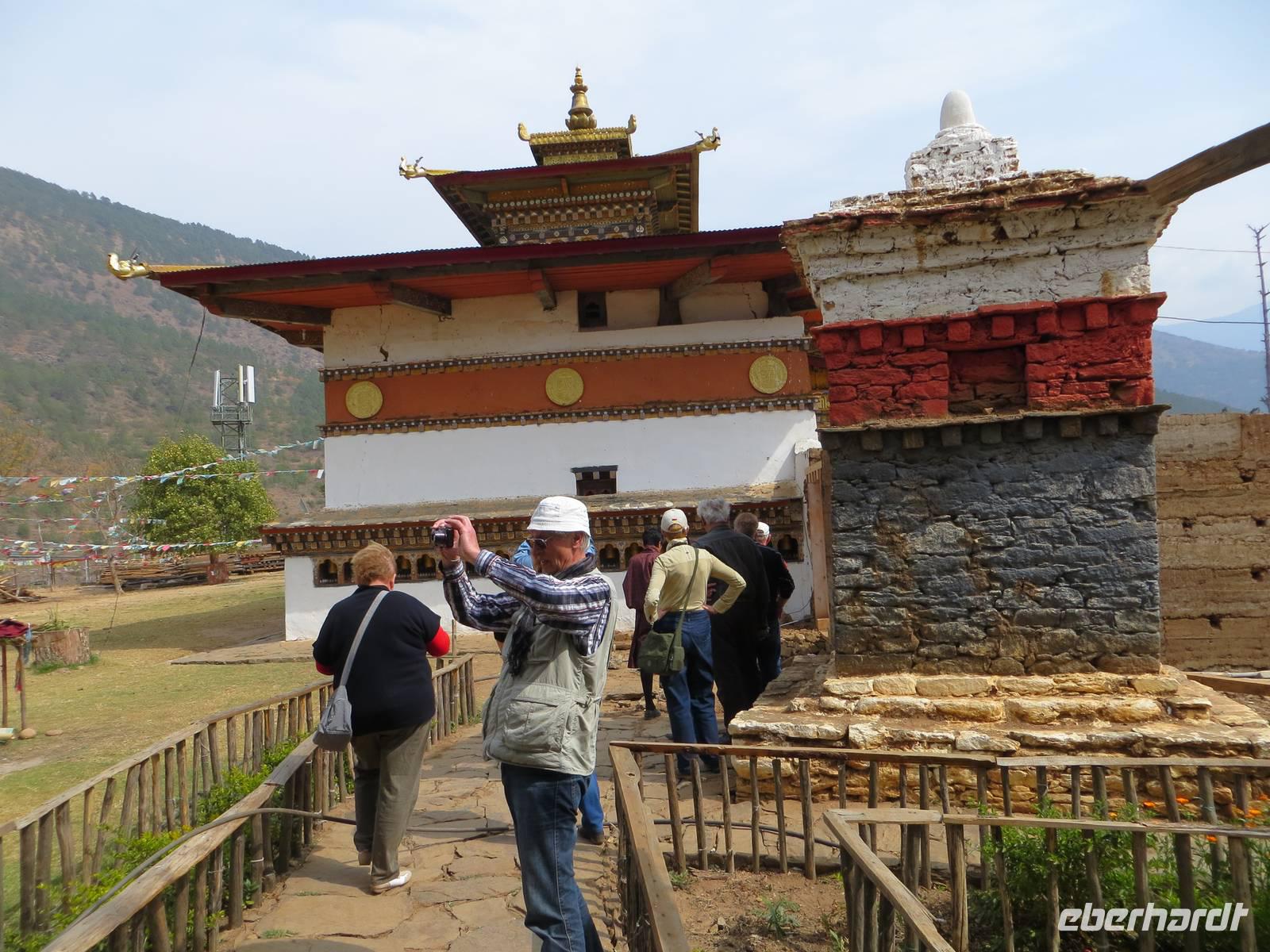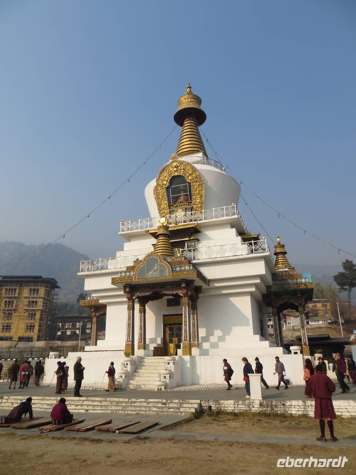Ein ganzer Tag für die 70.000 Einwohner zählende Hauptstadt des Landes stand uns zur Verfügung. Leider gab es in der Umgebung Waldbrände, so dass alles recht bedeckt-diesig qar. Zunächst stoppten wir am Gedächtnis-Chörte für den 3. König Bhutans. Hohe indische Militärs hatten sich angesagt, so dass schon der rote Teppich ausgerollt war. Viele Gläubige umrundeten die Chörte und warfen sich als Zeichen der Gottverehrung nieder. Anschließend hielten wir an der Post Bhutans, die bekannt ist für die Herausgabe mannigfaltiger Briefmarken für die Sammler in der ganzen Welt. Auch die Produktion individueller Briefmarken war möglich und machte uns allen viel Spaß.