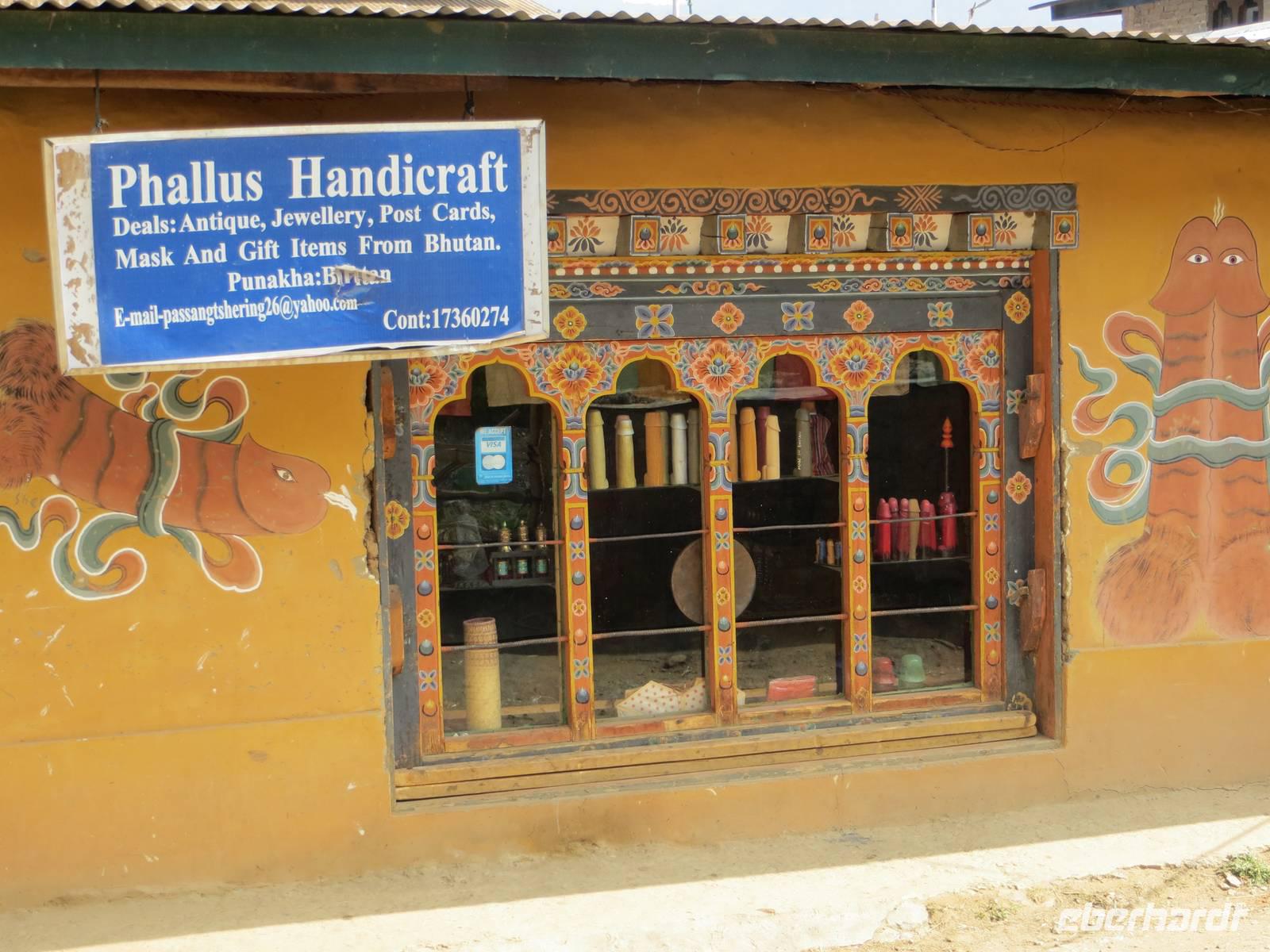 Um Straßensperrungen für Bauarbeiten zu umgehen, begann der Tag bereits kurz nach 5 Uhr, so dass wir noch vor 7 Uhr starteten. Nach einer dreiviertel Stunde waren wir auf dem Dochula Pass in 3100 Meter Höhe. 108 Chörten im Rund eines kleinen Hügels und hunderte Gebetsfahnen am Hang darüber bestimmen die Passhöhe. Im Tal darunter war es trüb, aber ganz in der Ferne zeigten sich für eine Stunde die weißen Spitzen der höchsten Berge Bhutans im Grenzgebiet zu China. Die höchsten Gipfel sind immerhin 7000er. In steiler Kurvenfahrt ging es nach einer Teezeit hinab auf 1400 m Höhe nach Wangdue. Hochoben über dem Fluss steht die alte Burganlage, die 2012 ausbrannte. So blieb uns nur ein Fotomotiv mit Fluss. Auf dem Weg nach Punakha hielten wir am Bauernmarkt: Gemüse der Region, getrocknete Pilze und jede Menge Chilli als große und kleine Schote, getrocknet und als Pulver, sowie ein Weizengebäck wie ein aufgeblasener kleiner Ballon brachten uns vor Kaufentscheidungen. In einem Dorf in der Nähe des Klosters Chimi Lakhang speisten wir mit Blick auf Terrassenfelder zu Mittag. Danach spazierten wir eineinhalb Stunden durch die dörfliche Landschaft zum Kloster, einem Fruchtbarkeitskloster. Bereits im Dorf prangten riesige Phallusmalereien von den Wänden und im Souvenirshop bot man eben diese Teile aus Holz geschnitzt an.