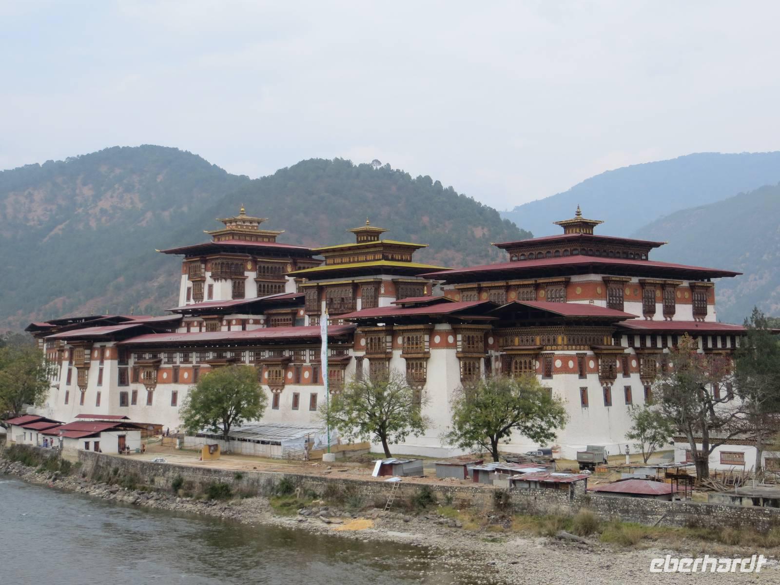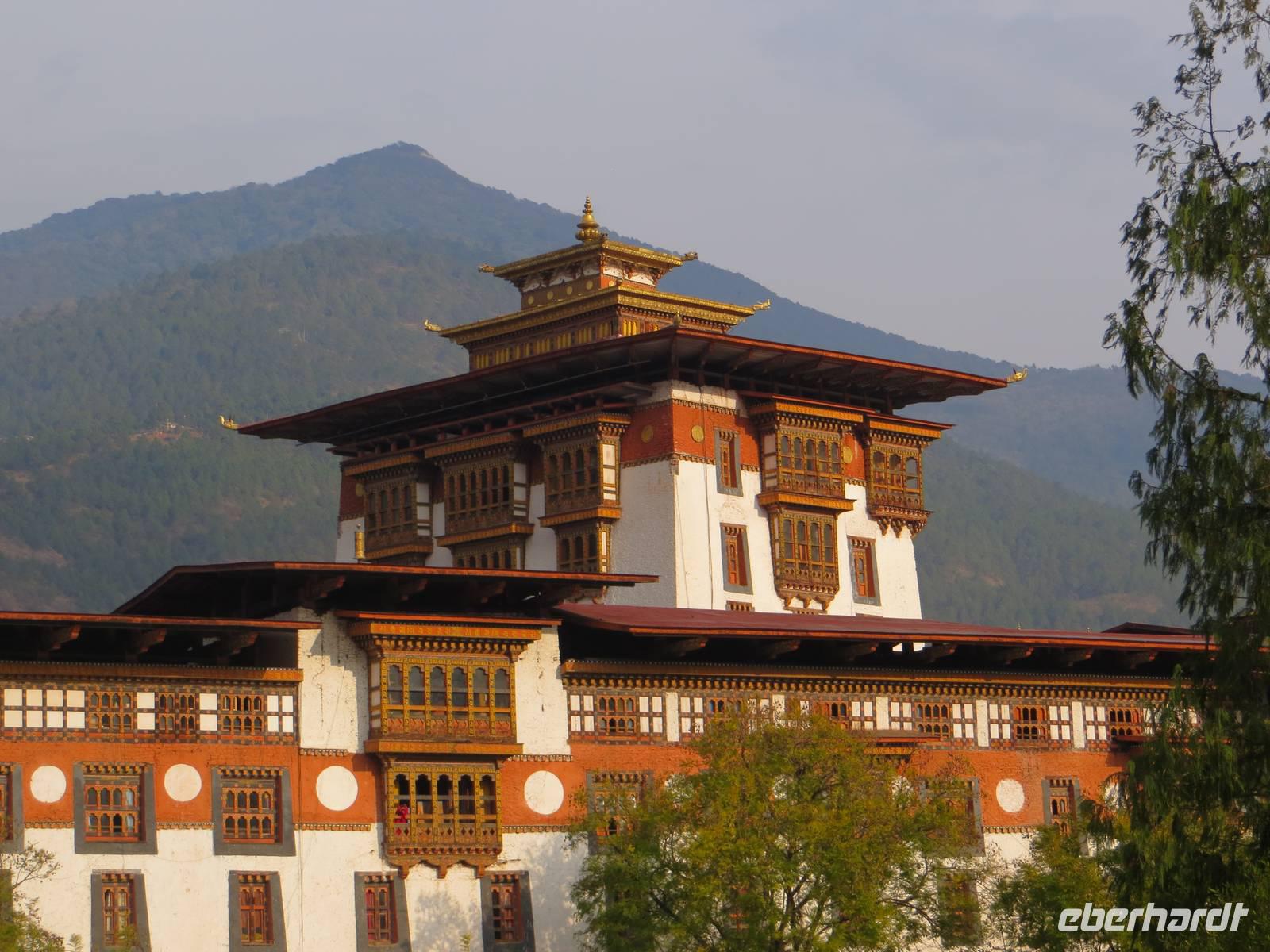 Am Nachmittag erreichten wir dann Punakha, die einstige Hauptstadt Bhutans. Ein riesiger Dzong bestimmt die Landschaft am Fluss. Es ist die Winterresidenz des geistlichen Oberhauptes des Landes und Krönungsort sowie Hochzeitsort des Königs von Bhutan. Mehr als dreihundert Mönche leben hier und prägen das Bild der Anlage mit ihrer Anwesenheit in karminroten Gewändern. Eindruckvoll auch diese Anlage mit weißen hohen Mauern und den Schnitzereien und Holzarbeiten. Hier liegt einbalsamiert der Gründer des heutigen Bhutans. Einige Minuten nutzten auch wir zur Teilnahme am Gebet der Mönche in der großen Versammlungshalle des Klosters. Zum Abschied hüllte die tiefliegende Sonne das Kloster und die in der Umgebung grünenden Bäume und Sträucher in zartes Licht.
