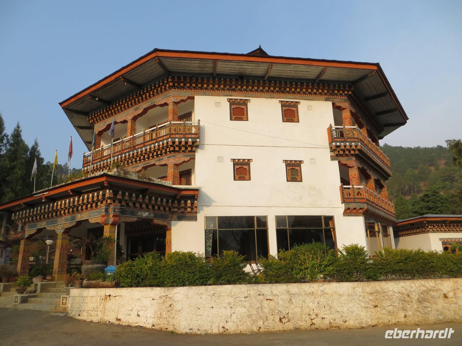 Nach unserem ersten, inkludierten Mittagessen in Bhutan ging es dann mit mehreren Fotostopps nach Thimphu, der Hauptstadt des Königreiches. Ganz anders hier die Wohnbauten als im eher hinduistisch geprägten Kathmandu. Ein Tag mit viel Sonne ging in 2300 m Höhe zu Ende.