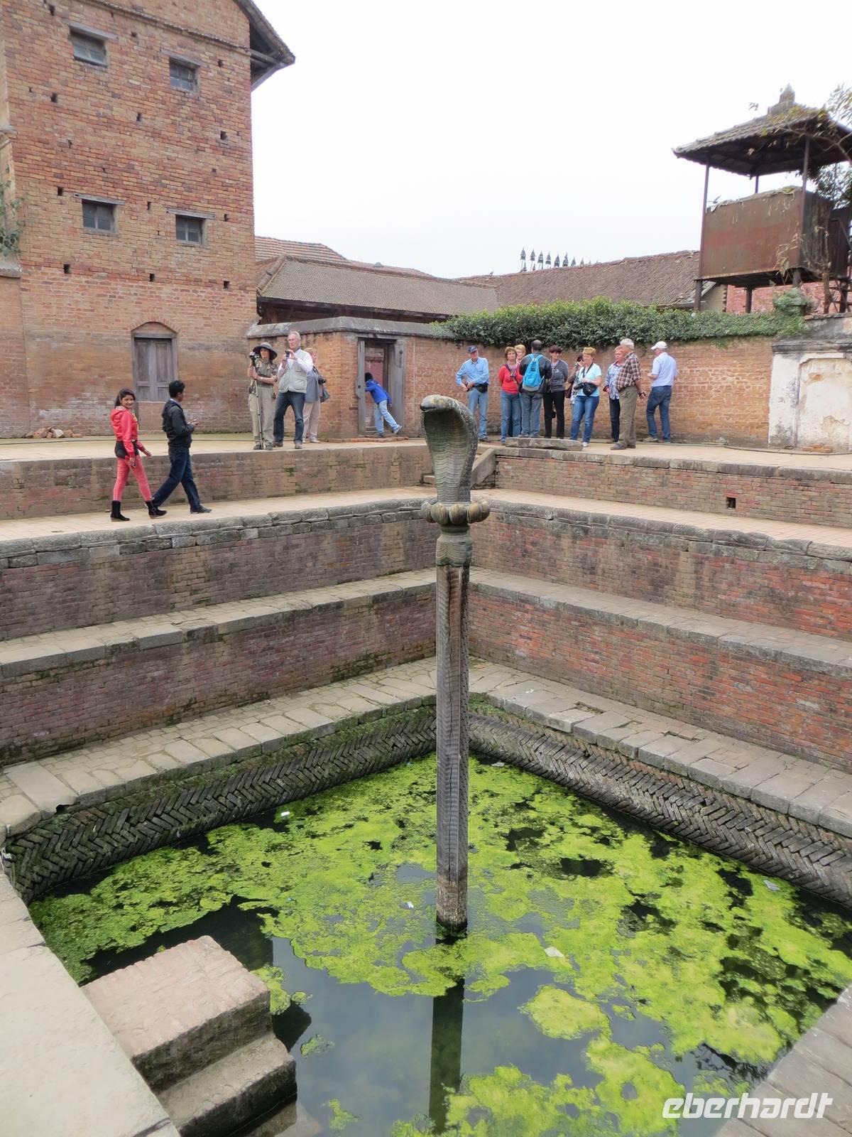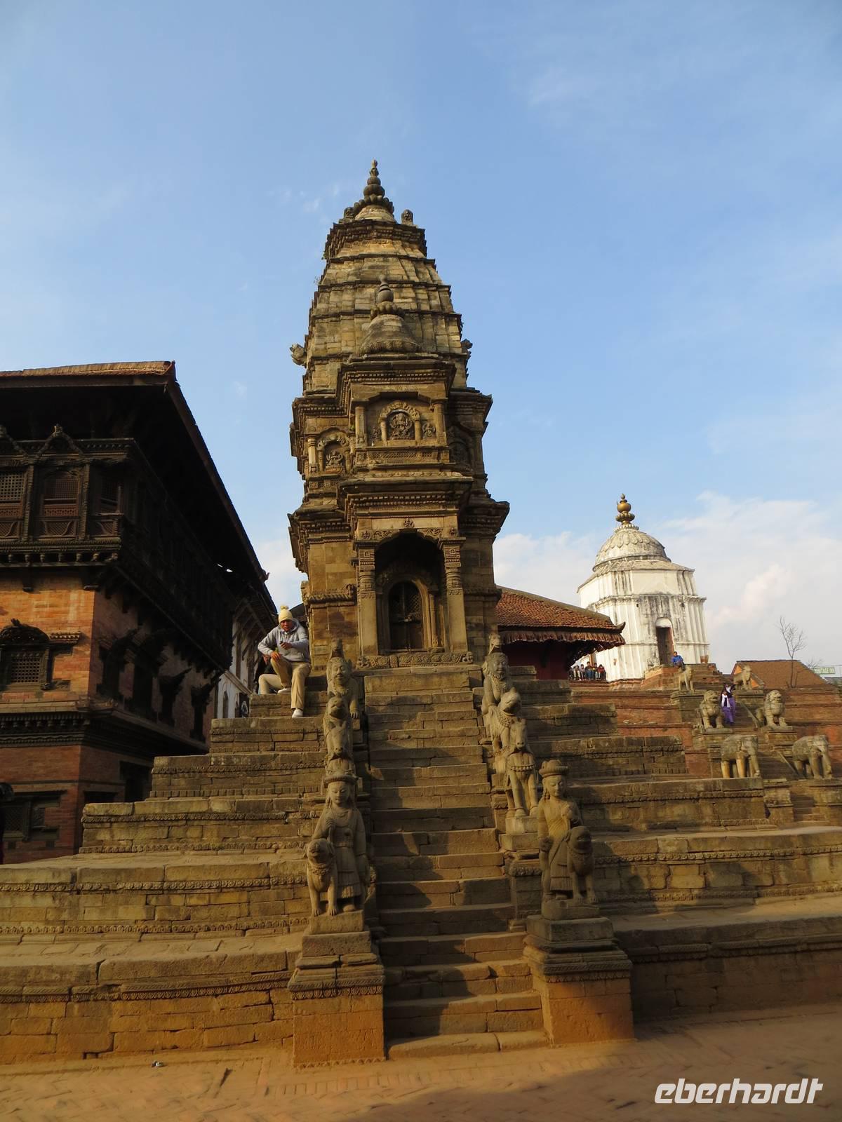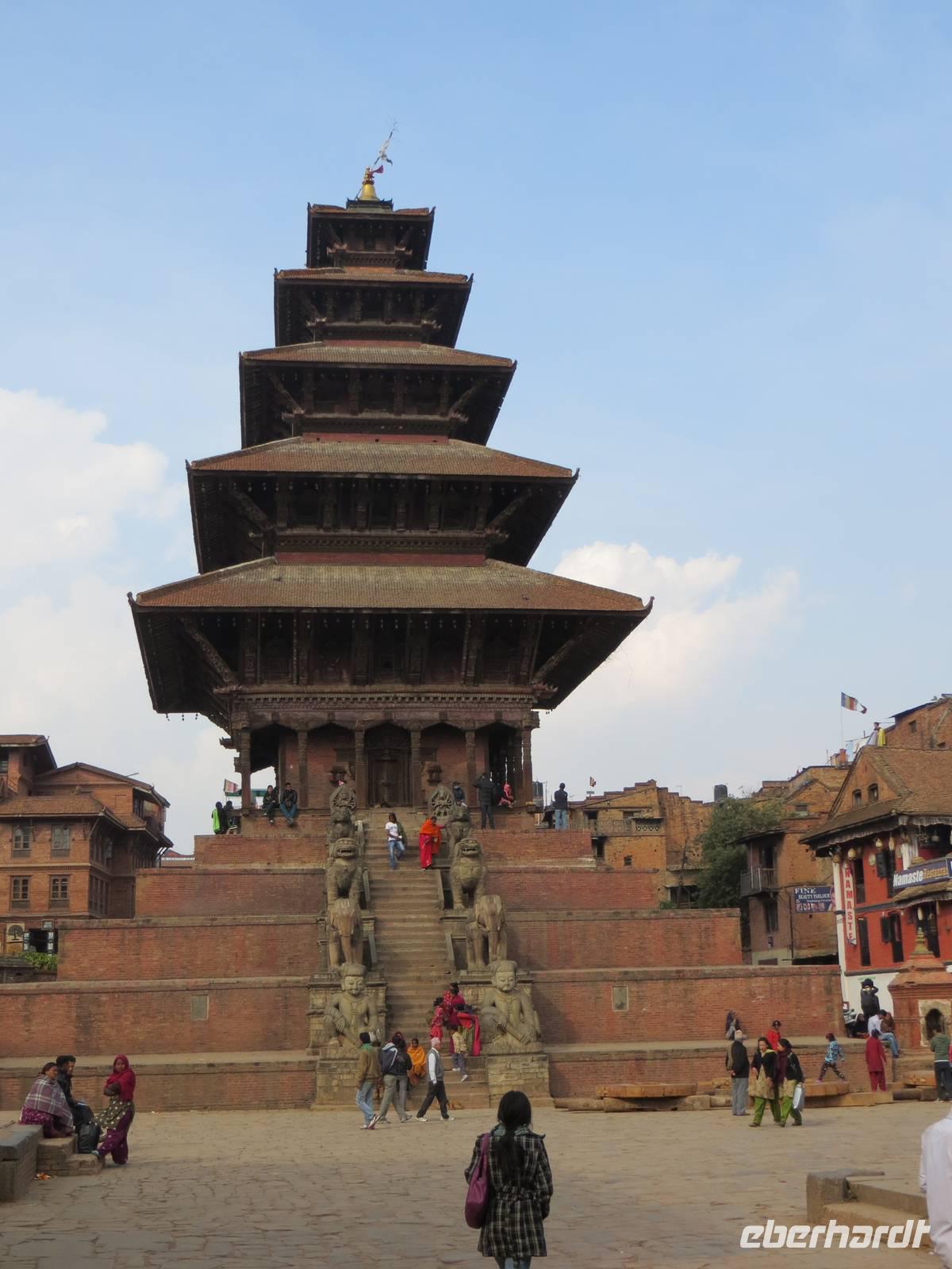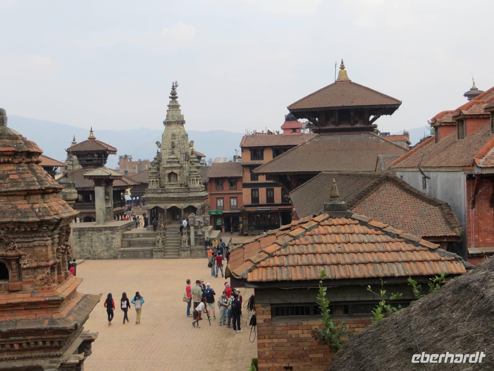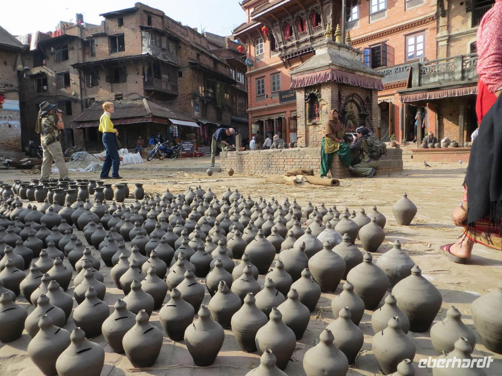 Am Nachmittag fuhren wir nach Bakhtapur der alten Königsstadt, zwanzig Kilometer östlich der alten Stadtgrenze von Kathmandu. Auch maßgeblich mit deutscher Unterstützung wurde dieses UNESCO-Weltkulturerbe erhalten. Alte Königspaläste, der Palastbrunnen mit großen Bronze-Cobra, die Königsloge auf der Durbar Square und zahlreiche Tempel und Pagoden prägen das Bild. Mit einem Bummel durch die engen Gassen gelangten wir zum Taumadhi Tole, dem bedeutenden traditionellen Platz Bakhtapus, mit der fünfetagigen Nyatapola Mandir, einer der wenigen fünfetagigen Pagoden. Unser Weg führte über den Töpfermarkt zurück zum Durbar Square, wo wir bei warmen Spätnachmittagslicht unsere erstgeschossenen Fotos aufbessern konnten. Nach mehr als zwölf Stunden Reisezeit ging der Tag im bereits bekannten Hotel Himalaya in Patan zu Ende.