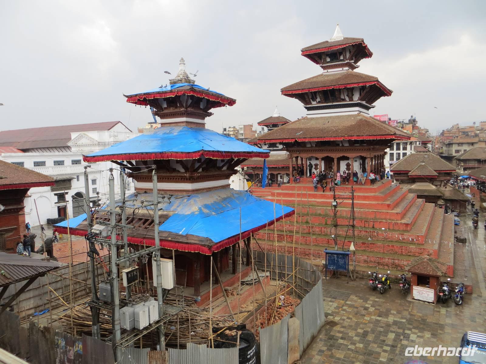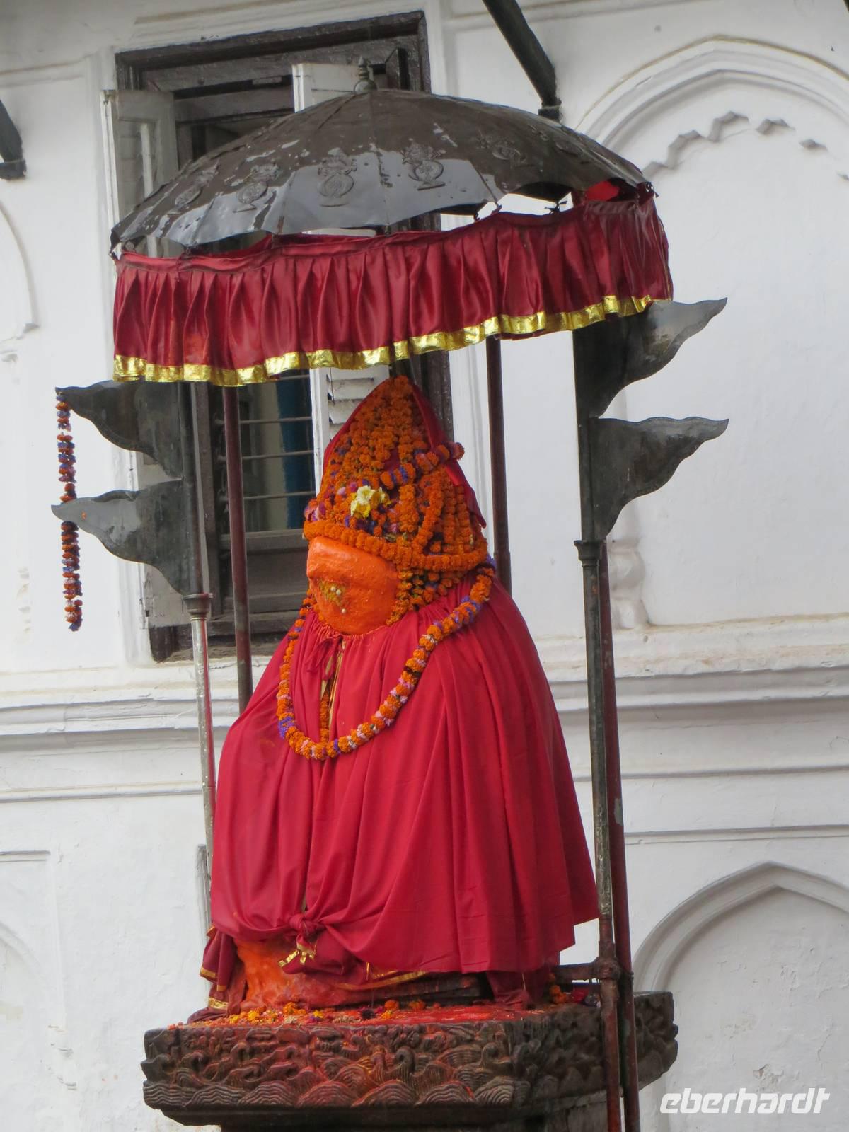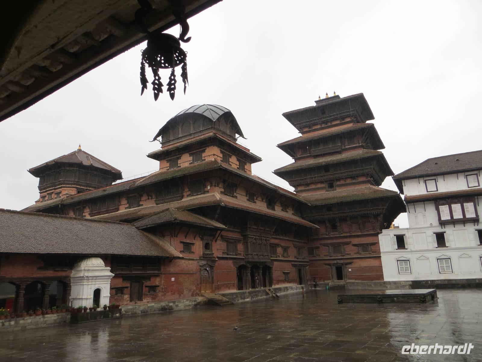 Als wir zur besten Mittagszeit im Zentrum Kathmandus den Durbar Squuare erreichten, begann es zu regnen. In der Hoffnung, das es sich nur um einen Schauer handelt, legten wir eine Mittagspause mit Momos und Suppen ein. Aber bald erklärte sich das Canceln des morgendlichen Fluges: eine riesige Regenfront ließ den Tag verwässern. Dafür nicht ausreichend bekleidet, hüpften wir über Pfützen und versuchten unter Dächern stehend wenigstens einige Fotos zu machen. Regenbilder also von: Durbar Square mit allen Tempeln und dem Palastbezirk, das Haus der Kumari, „Hanuman Dhoka" und der Kali-Statue. Mit Nahaufnahmen wurden aber sicher einige akzeptable Fotos der phantastischen Holzschnitzereien an Fenstern, Säulen, Türen und Dachkonstruktion der Tempel und des Palastes erzielt. Bei so viel Regen zeigte sich uns die Kumari, die lebende Göttin - eine ausgesuchte Jungfrau in kultischer Verehrung - natürlich nicht.
