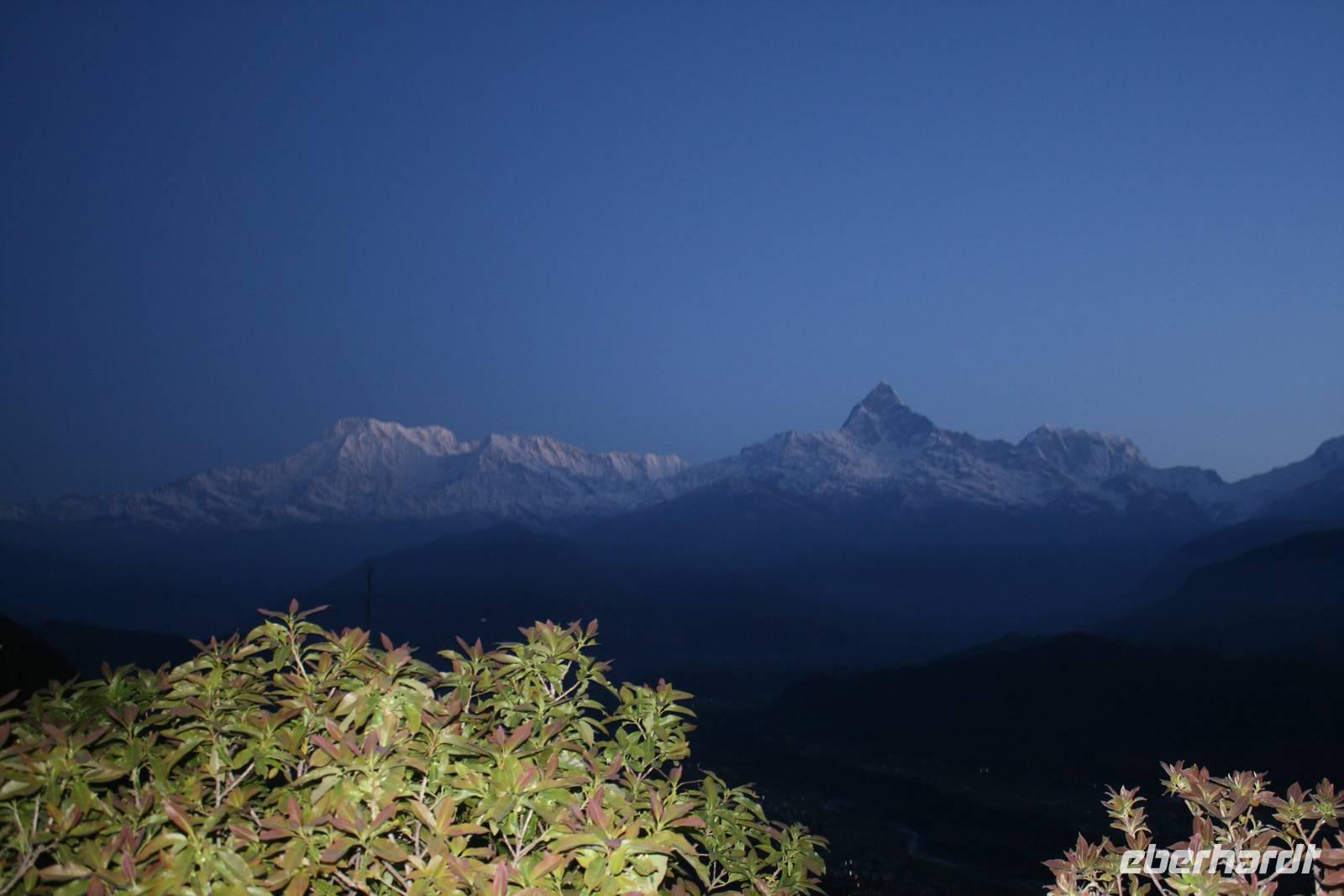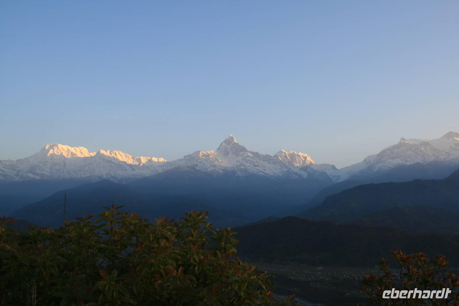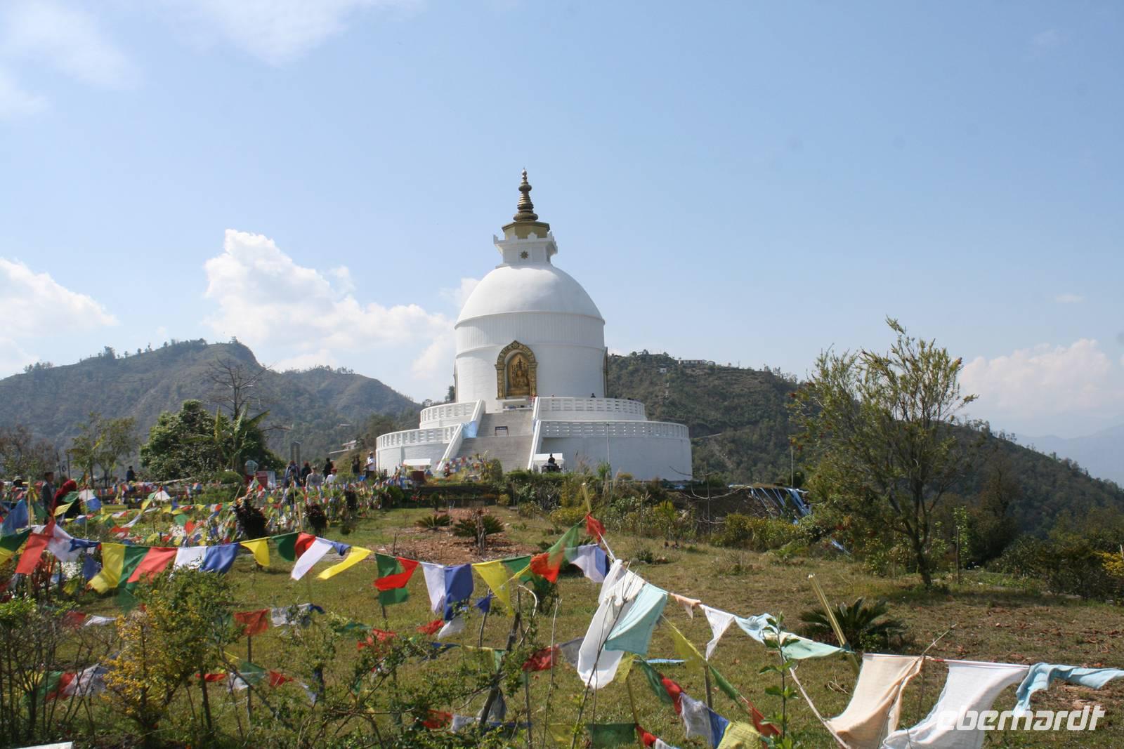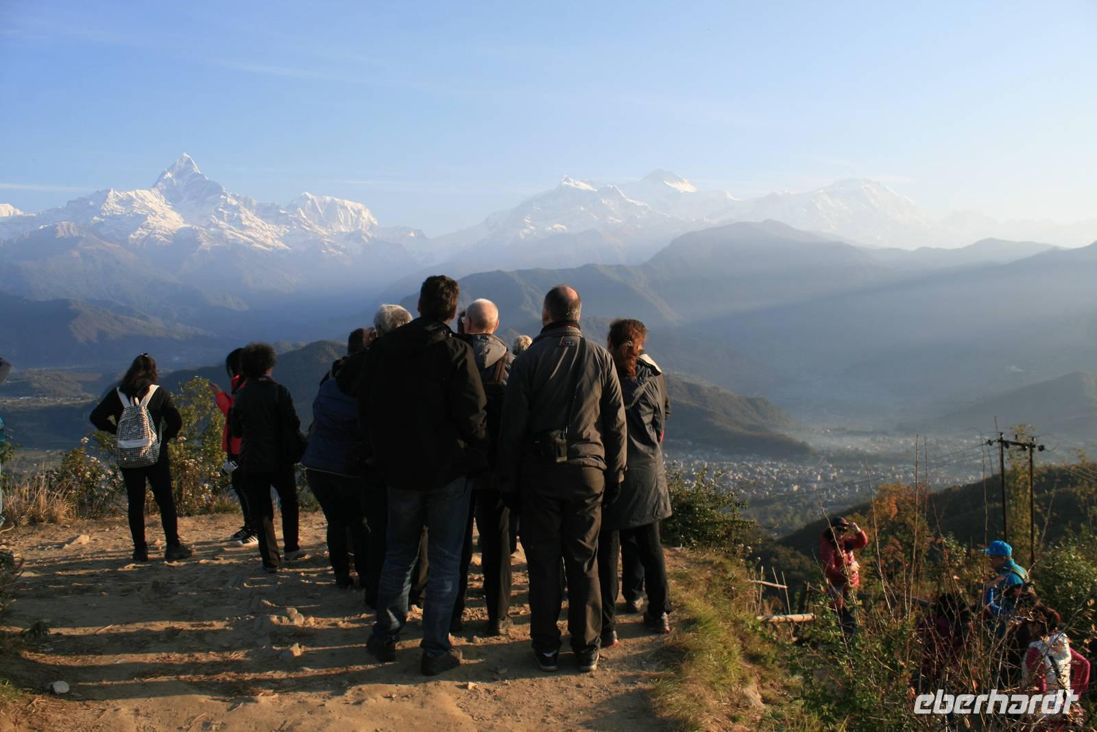 Heute hat Morgenstund sprichwörtlich Gold im Mund. Alle erwachen heute schon früh aus Ihrem Schönheitsschlaf, denn natürlich will jeder die Annapurna-Gebirgskette in Ihrer ganzen Schönheit bewundern. So trinken wir noch einen wohltuenden Kaffee, bevor wir mit unserem Bus zum Hügel Sarangkot fahren, von wo aus wir wunderbar das Bergmassiv bewundern können. Wir sind nicht die Einzigen, die sich das heute überlegt haben. Über eine steile Straße erreichen wir unseren Ausgangspunkt, von dem wir in der Dunkelheit noch etwa einen Kilometer zu Fuß gehen. Mit Taschenlampen fällt uns das Laufen leichter. Oben angekommen können wir das Bergmassiv bereits erahnen. Zwar noch in Dunkelheit gehüllt, zeigt sich der Fishtail schon langsam in seinem schneebedeckten Kleid. Von hier aus können wir auch einen atemberaubenden Blick auf das Pokhara-Tal und auf die gleichnamige Stadt genießen. Es wird immer heller und so langsam wird uns bewusst, dass wir heute mit dem Wetter Glück haben. Wenn Engel eben reisen. So geht langsam die Sonne auf und immer mehr Berge des Massivs kommen zum Vorschein. So sehen wir die Annapurna Süd (7219 Meter), den Hiunchuli (6641 Meter, der niedrige vorgelagerte Gipfel), die Annapurna I (8091 Meter) , den Roc Noir (7485 Meter), den Machhapuchare oder auch Fischschwanz (6997 Meter) sowie die Annapurna III (7555 Meter), Annapurna IV (7525 Meter) und die Annapurna II (7937 Meter). Wir können unser Glück kaum fassen und knipsen was das Zeug hält. Überwältigt von dieser Kulisse darf hier ein Gruppenbild natürlich nicht fehlen. Die Schönheit kann man kaum in Worte fassen. Nach einer ausgiebigen Fotopause laufen wir zurück zu unserem Bus und können auch auf dem Weg kaum unseren Blick von der Gebirgskette abwenden. Zurück in unserem Hotel, genießen wir ein ausgiebiges Frühstück, bevor wir uns später wieder treffen zu unserer Besichtigung von Pokhara. Die Stadt liegt genau 198 Kilometer westlich von Kathmandu und ist mit seinen etwa 180 000 Einwohner, das zweitwichtigste Touristenziel Nepals. Der Name Pokhara ist sehr alt und wurde abgeleitet von dem Wort Pokhari, was soviel bedeutet wie Teich oder See. Pokhara liegt etwas über achthundert Meter über dem Meeresspiegel, und damit fast 500 Meter tiefer als Kathmandu. Dies merken wir direkt am wärmeren, aber auch feuchterem Wetter. In Pokhara friert es nie und so säumen tropische Blütenpflanzen und manchmal Bananenstauden die Gärten. So besichtigen wir hier zunächst die Devi-Wasserfälle und spazieren später zu einem SOS Kinderdorf, wo wir sehen wie die Kinder zusammen spielen und hier leben. Hier fehlt es im Gegensatz zu Deutschland an Allem und so entscheiden wir uns, auch einen kleinen Betrag als Spende hier zu lassen. Dafür möchte ich auch noch einmal allen Reisenden danken. Bevor wir unsere Bootsfahrt über den Phewa-See unternehmen, besuchen wir noch eine Teppichweberei. Am Phewa-See angekommen, stehen unsere Boote schon bereit und werden noch ganz altmodisch aber schön als Ruderboote betrieben. Die Kulisse hier ist einfach herrlich. Unser erstes Ziel ist der hinduistische Bindya Basini-Tempel. Interessant ist die kultische Bedeutung des Tempels, denn der Hauptschrein ist der Göttin Bhagwati geweiht, der regelmäßig Tieropfer dargebracht werden. Danach erreichen wir mit unseren Booten ein kleines Restaurant auf einer Insel. Doch wir sind nicht nur zum Essen hier, denn Abi und Vicky haben für Ihre Gäste noch eine Überraschung vorbereitet. Oberhalb der Stadt thront die Shanti Stupa oder auch Friedenspagode. Allerdings ist Sie nur über einen ca. zweistündigen, steilen Fußmarsch zu erreichen. Wir entscheiden uns trotzdem diese Wanderung zu unternehmen. Einige haben dies vielleicht danach noch bereut. So machen wir uns auf und entscheiden uns vorher noch schnell, was wir zu Mittag essen wollen, sollten wir heil wieder unten ankommen. Der Aufstieg war wirklich beschwerlich aber oben wurden wir dann doch mit einem atemberaubenden Ausblick belohnt. Am Ende war doch jeder froh, die Wanderung geschafft zu haben und so lassen wir den Nachmittag bei leckerem Chicken-Curry und einem Bier ausklingen. Das haben wir uns wirklich verdient. Zurück auf dem Festland, sind die spontanen Ideen meistens die besten. So entdecken unsere aufmerksamen und trinkfreudigen Gäste eine Hippie-Bar der besonderen Art und das Wort Happy Hour lockt uns an. So entscheiden wir uns, noch einzukehren und genießen bei einem Cocktail oder einem Glas Wein und Hippie-Musik die wunderbare Atmosphäre am Phewa-See. Immerhin ist heute auch Freitag und Wochenende. Hier haben wir uns auch überlegt, dass das Marihuana, was wir im Chitwan-Nationalpark gesehen haben, doch hier auch gut hergepasst hätte, aber es blieb uns leider verwehrt. In jedem Fall war es ein toller Abschluss für sicher einen der schönsten Tage unserer Reise, an den wir uns noch oft zurückerinnern werden. Im Hotel zurück, essen wir zu Abend und fallen dann alle in unsere Betten.