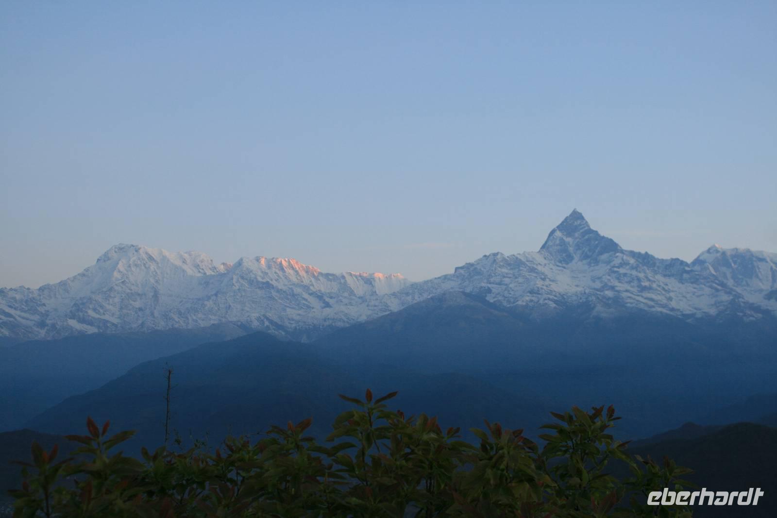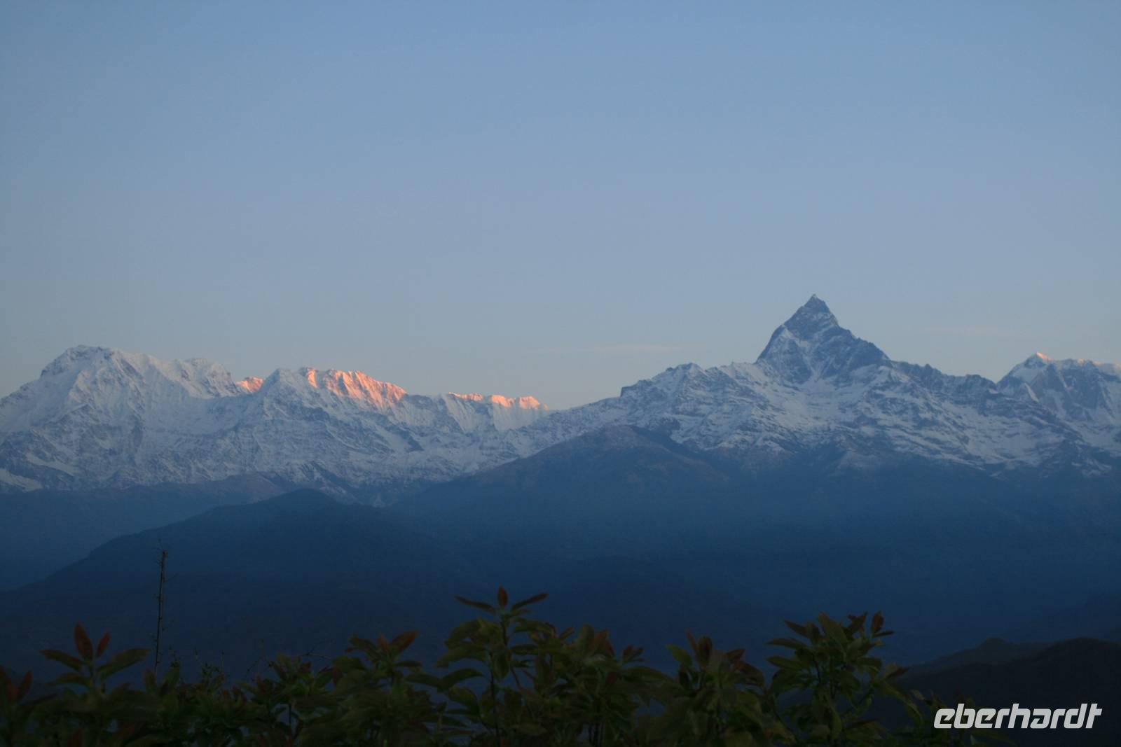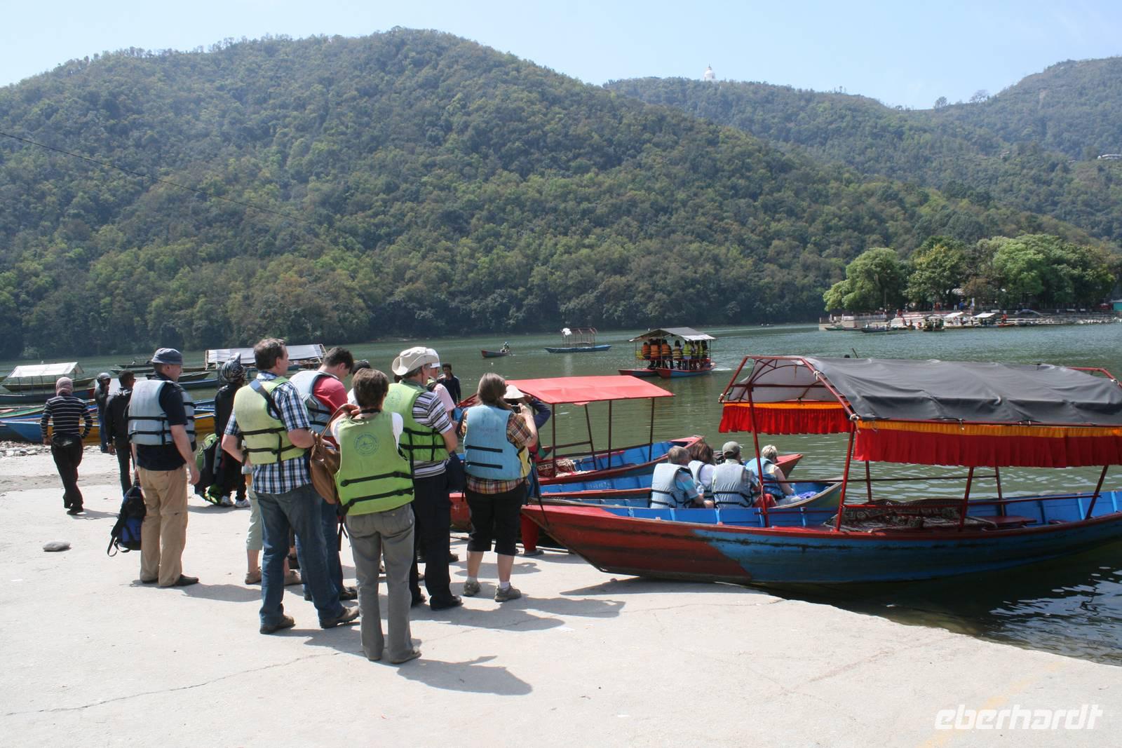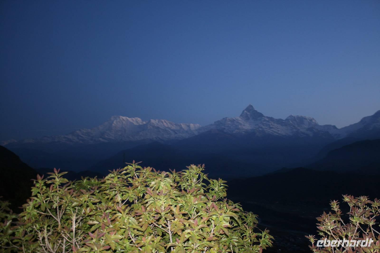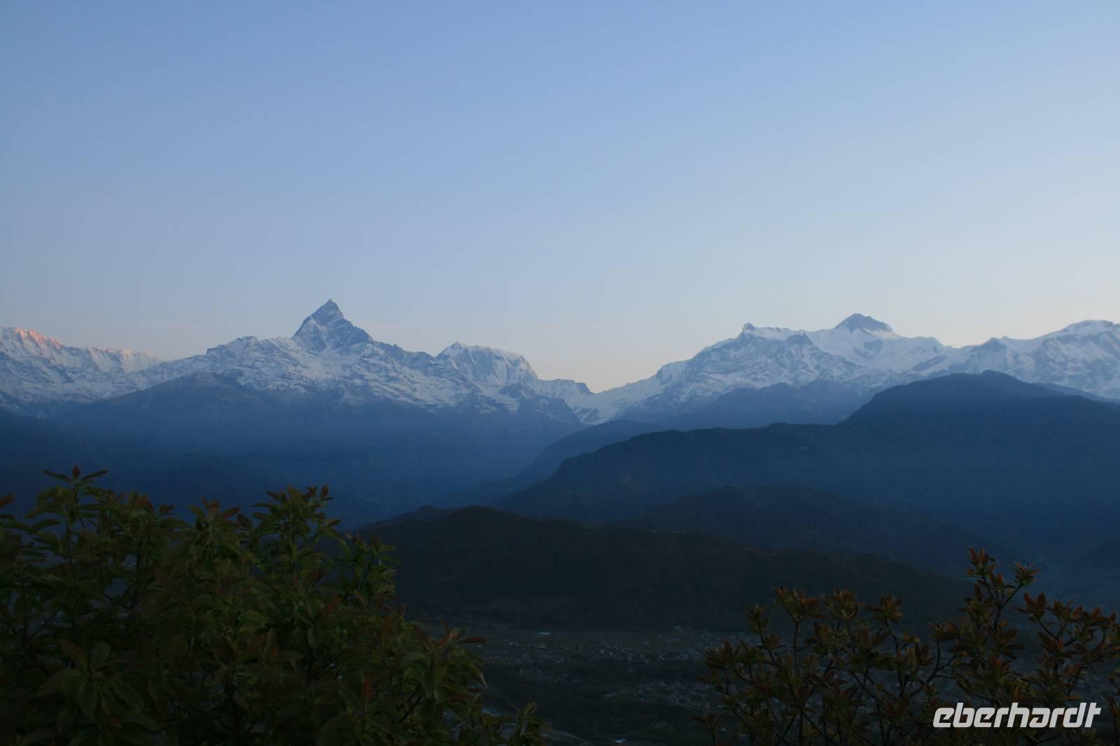 Heute hat Morgenstund sprichwörtlich Gold im Mund. Alle erwachen heute schon früh aus Ihrem Schönheitsschlaf, denn natürlich will jeder die Annapurna-Gebirgskette in Ihrer ganzen Schönheit bewundern. So trinken wir noch einen wohltuenden Kaffee, bevor wir mit unserem Bus zum Hügel Sarangkot fahren, von wo aus wir wunderbar das Bergmassiv bewundern können. Wir sind nicht die Einzigen, die sich das heute überlegt haben. Über eine steile Straße erreichen wir unseren Ausgangspunkt, von dem wir in der Dunkelheit noch etwa einen Kilometer zu Fuß gehen. Mit Taschenlampen fällt uns das Laufen leichter. Oben angekommen können wir das Bergmassiv bereits erahnen. Zwar noch in Dunkelheit gehüllt, zeigt sich der Fishtail schon langsam in seinem schneebedeckten Kleid. Von hier aus können wir auch einen atemberaubenden Blick auf das Pokhara-Tal und auf die gleichnamige Stadt genießen. Es wird immer heller und so langsam wird uns bewusst, dass wir heute mit dem Wetter Glück haben. Wenn Engel eben reisen. So geht langsam die Sonne auf und immer mehr Berge des Massivs kommen zum Vorschein. So sehen wir die Annapurna Süd (7219 Meter), den Hiunchuli (6641 Meter, der niedrige vorgelagerte Gipfel), die Annapurna I (8091 Meter) , den Roc Noir (7485 Meter), den Machhapuchare oder auch Fischschwanz (6997 Meter) sowie die Annapurna III (7555 Meter), Annapurna IV (7525 Meter) und die Annapurna II (7937 Meter). Wir können unser Glück kaum fassen und knipsen was das Zeug hält. Überwältigt von dieser Kulisse darf hier ein Gruppenbild natürlich nicht fehlen. Die Schönheit kann man kaum in Worte fassen. Nach einer ausgiebigen Fotopause laufen wir zurück zu unserem Bus und können auch auf dem Weg kaum unseren Blick von der Gebirgskette abwenden. Zurück in unserem Hotel, genießen wir ein ausgiebiges Frühstück, bevor wir uns später wieder treffen zu unserer Besichtigung von Pokhara. Die Stadt liegt genau 198 Kilometer westlich von Kathmandu und ist mit seinen etwa 180 000 Einwohner, das zweitwichtigste Touristenziel Nepals. Der Name Pokhara ist sehr alt und wurde abgeleitet von dem Wort Pokhari, was soviel bedeutet wie Teich oder See. Pokhara liegt etwas über achthundert Meter über dem Meeresspiegel, und damit fast 500 Meter tiefer als Kathmandu. Dies merken wir direkt am wärmeren, aber auch feuchterem Wetter. In Pokhara friert es nie und so säumen tropische Blütenpflanzen und manchmal Bananenstauden die Gärten. So besichtigen wir hier zunächst die Devi-Wasserfälle und spazieren später zu einem SOS Kinderdorf, wo wir sehen wie die Kinder zusammen spielen und hier leben. Hier fehlt es im Gegensatz zu Deutschland an Allem und so entscheiden wir uns, auch einen kleinen Betrag als Spende hier zu lassen. Dafür möchte ich auch noch einmal allen Reisenden danken. Bevor wir unsere Bootsfahrt über den Phewa-See unternehmen, besuchen wir noch eine Teppichweberei. Am Phewa-See angekommen, stehen unsere Boote schon bereit und werden noch ganz altmodisch aber schön als Ruderboote betrieben. Die Kulisse hier ist einfach herrlich. Unser erstes Ziel ist der hinduistische Bindya Basini-Tempel. Interessant ist die kultische Bedeutung des Tempels, denn der Hauptschrein ist der Göttin Bhagwati geweiht, der regelmäßig Tieropfer dargebracht werden. Danach erreichen wir mit unseren Booten ein kleines Restaurant auf einer Insel. Doch wir sind nicht nur zum Essen hier, denn Abi und Vicky haben für Ihre Gäste noch eine Überraschung vorbereitet. Oberhalb der Stadt thront die Shanti Stupa oder auch Friedenspagode. Allerdings ist Sie nur über einen ca. zweistündigen, steilen Fußmarsch zu erreichen. Wir entscheiden uns trotzdem diese Wanderung zu unternehmen. Einige haben dies vielleicht danach noch bereut. So machen wir uns auf und entscheiden uns vorher noch schnell, was wir zu Mittag essen wollen, sollten wir heil wieder unten ankommen. Der Aufstieg war wirklich beschwerlich aber oben wurden wir dann doch mit einem atemberaubenden Ausblick belohnt. Am Ende war doch jeder froh, die Wanderung geschafft zu haben und so lassen wir den Nachmittag bei leckerem Chicken-Curry und einem Bier ausklingen. Das haben wir uns wirklich verdient. Zurück auf dem Festland, sind die spontanen Ideen meistens die besten. So entdecken unsere aufmerksamen und trinkfreudigen Gäste eine Hippie-Bar der besonderen Art und das Wort Happy Hour lockt uns an. So entscheiden wir uns, noch einzukehren und genießen bei einem Cocktail oder einem Glas Wein und Hippie-Musik die wunderbare Atmosphäre am Phewa-See. Immerhin ist heute auch Freitag und Wochenende. Hier haben wir uns auch überlegt, dass das Marihuana, was wir im Chitwan-Nationalpark gesehen haben, doch hier auch gut hergepasst hätte, aber es blieb uns leider verwehrt. In jedem Fall war es ein toller Abschluss für sicher einen der schönsten Tage unserer Reise, an den wir uns noch oft zurückerinnern werden. Im Hotel zurück, essen wir zu Abend und fallen dann alle in unsere Betten.