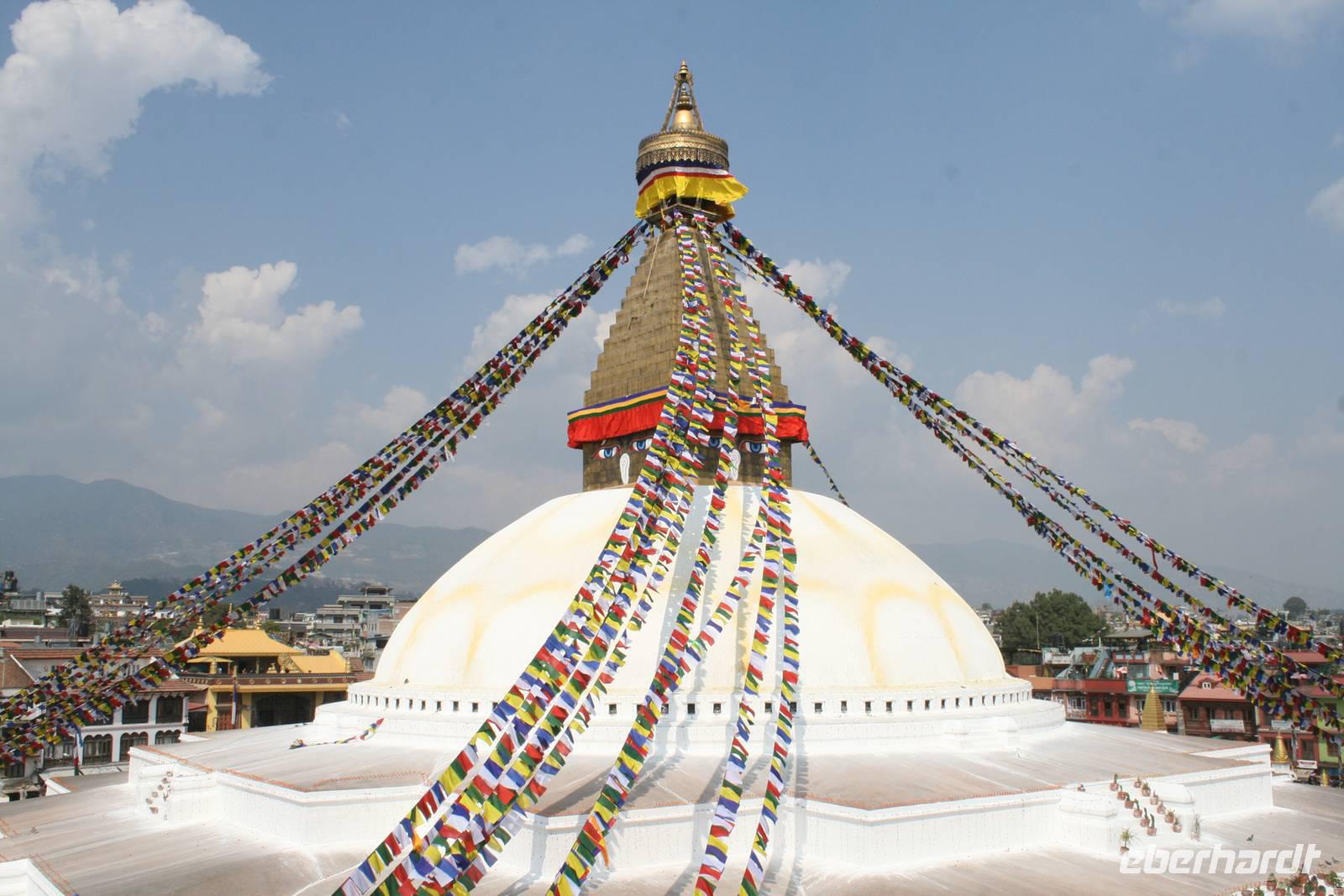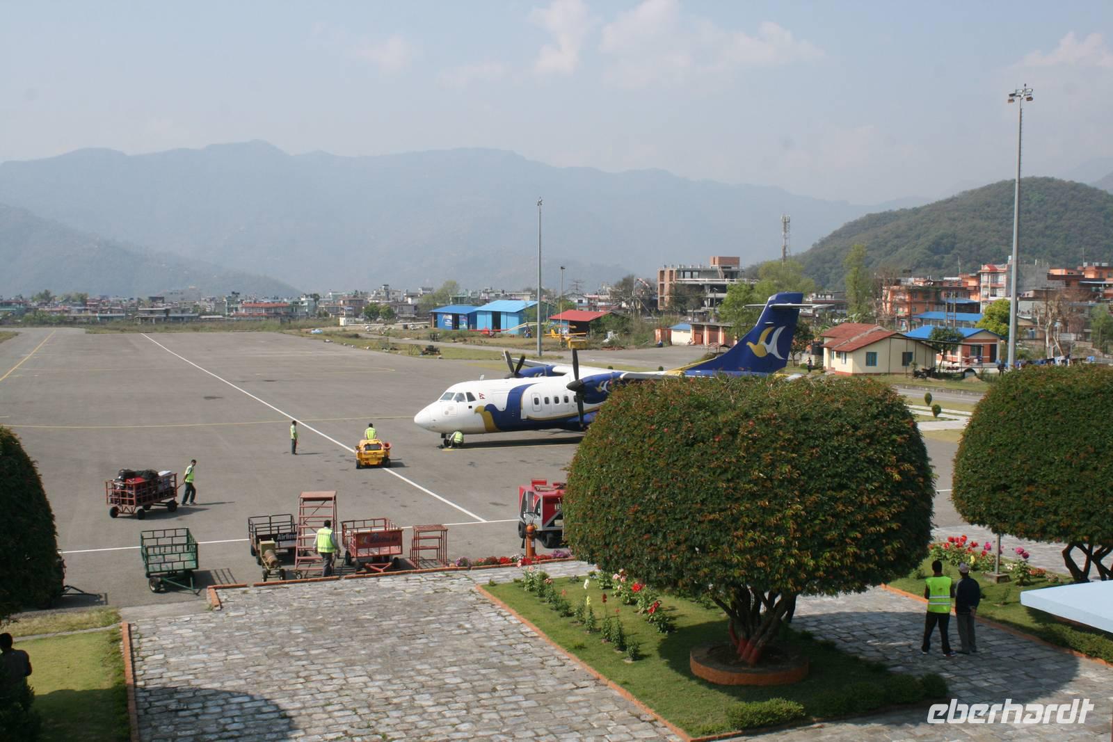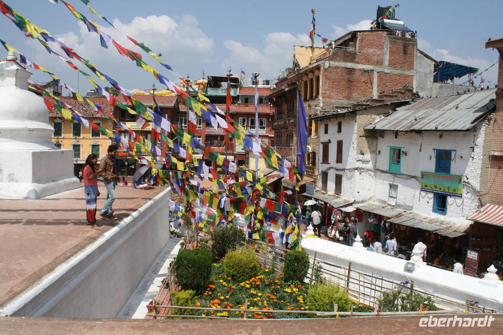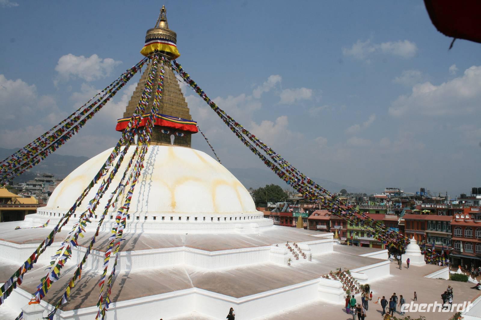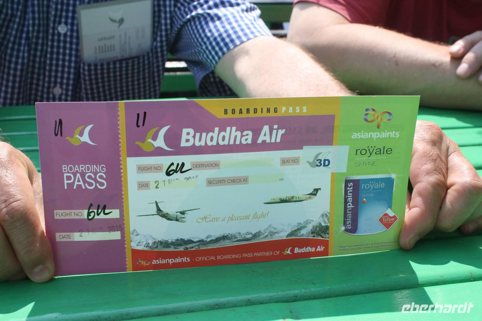 Heute müssen wir am Vormittag unser schönes 5-Sterne-Hotel in Pokhara leider schon wieder verlassen aber ein jeder genießt es auch heute etwas länger schlafen zu können. Am Vormittag packen wir wieder unsere sieben Sachen und begeben uns zum kleinen aber feinen Flughafen von Pokhara, denn heute geht es für uns zurück nach Kathmandu. Am Flughafen angekommen, erledigte Abi für uns die Formalitäten und wir ließen uns so während der Wartezeit noch einige Sonnenstrahlen auf der Terasse ins Gesicht scheinen. In Deutschland kaum denkbar, dass man aus einem Flughafengebäude auch rausgehen kann. Einige Koffer waren etwas schwerer als die erlaubten 20 Kilogramm aber dies wurde hier noch akzeptiert. Auch mit den Sicherheitskontrollen nimmt man es hier nicht so genau. So flogen wir mit einer Verpätung von etwa einer Stunde, aber für nepalesische Verhältnisse trotzdem noch pünktlich mit einer kleinen Bhudda Air Maschine nur etwa eine halbe Stunde zurück nach Kathmandu. Am späten Mittag hier angekommen, haben wir auch unsere Koffer wieder in Empfang genommen. Das Gepäckband war zwar etwas gewöhnungsbedürftig aber in Nepal geht alles. So fuhren wir zurück zu unserem schon bekannten Hotel und bezogen wieder unsere Zimmer. Später trafen wir uns wieder und spazierten gemeinsam zur Stupa von Bodnath, die wir mittlerweile schon ganz gut kennen. Abi hat hier ein tolles Restaurant mit Dachterrasse für uns ausgesucht und so genießen wir von hier auch einen tollen Blick auf das Treiben an der Stupa. Tradtionnell werden wieder viele Momos gegessen und Everest Bier getrunken. Den Nachmittag nutzt dann jeder indviduell um noch ein paar Souvenirs oder Postkarten zu erstehen. Einige nutzen aber auch die Zeit, um sich bei den Tempeln etwas näher umzuschauen und müssen feststellen, dass Sie anscheinend als Eberhardt-Gäste so arm aussehen, dass Sie nun schon zur Nepalesischen Tafel gehören und mit Nahrung versorgt werden. Was man nicht alles in Kathmandu erlebt...am Abend genießen wir ein letztes Abendessen im Hotel und natürlich einen anschließenden Drink in der bekannten Yak Bar, bevor wir am nächsten Tag weiter nach Bhutan, in das Land des Donnerdrachens fliegen.