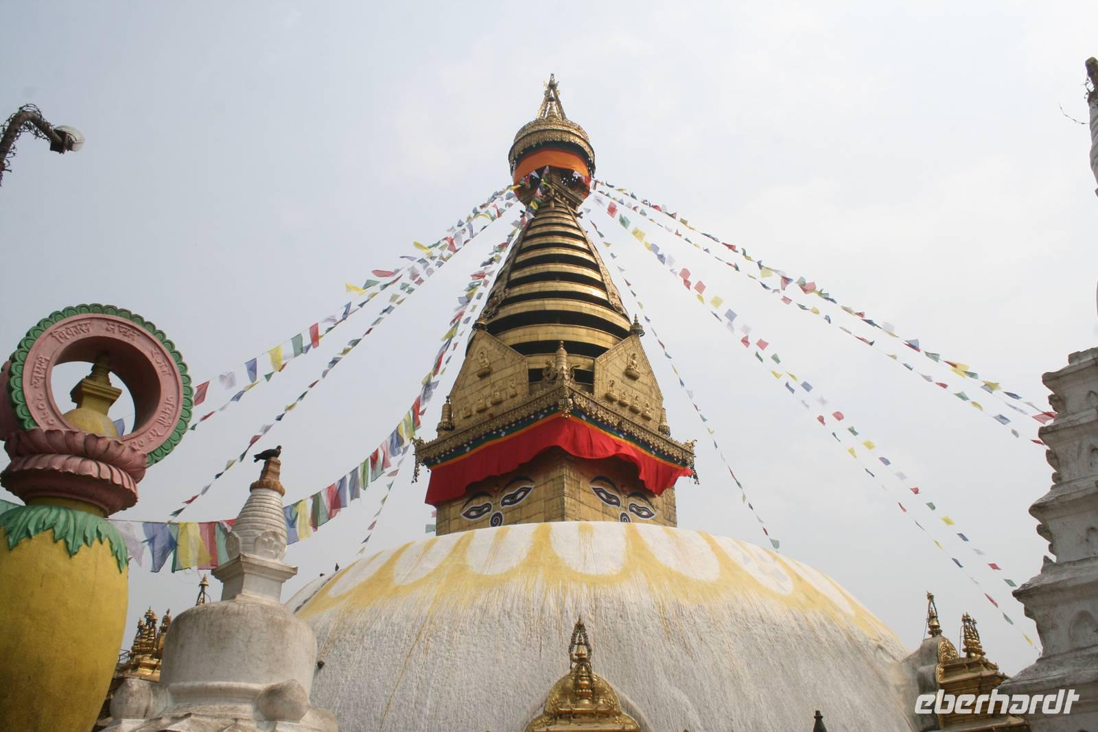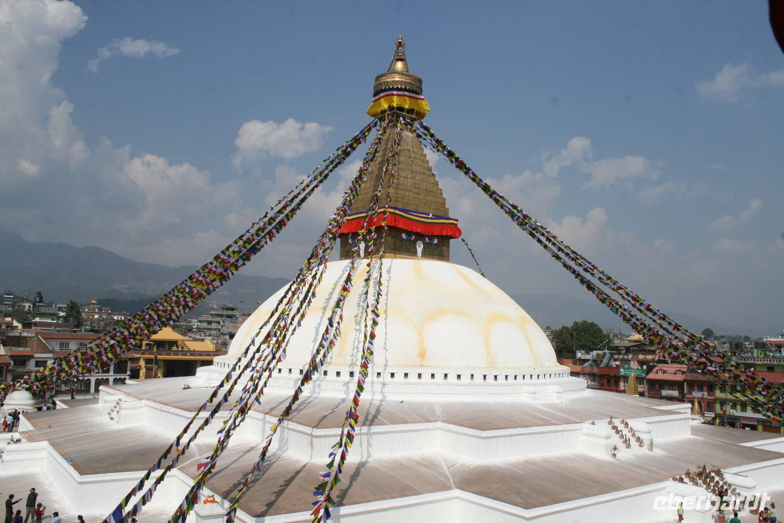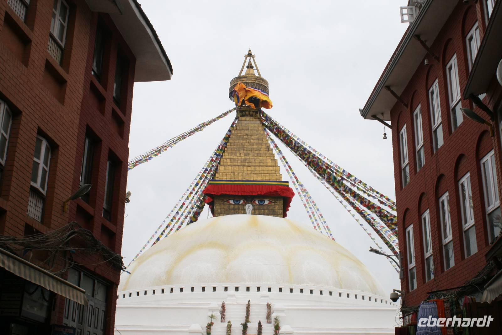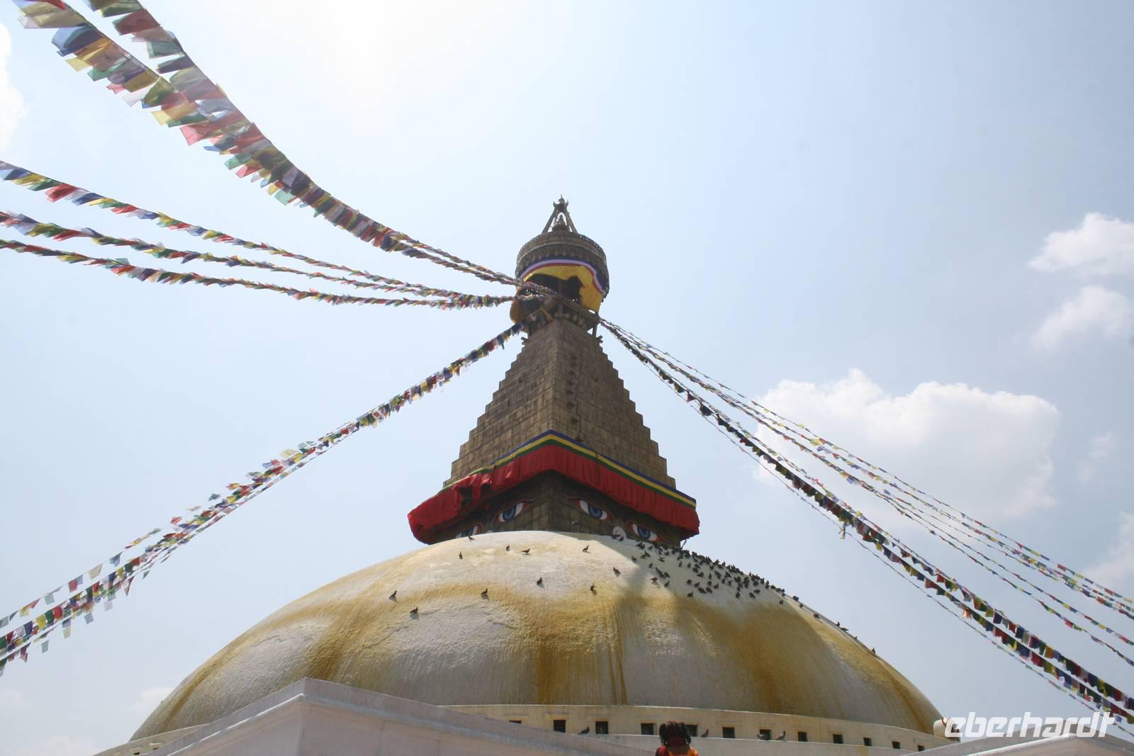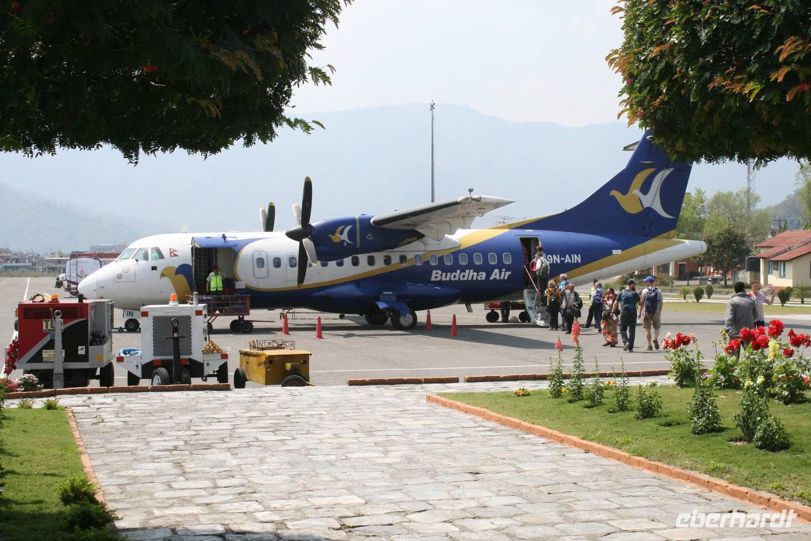 Heute müssen wir am Vormittag unser schönes 5-Sterne-Hotel in Pokhara leider schon wieder verlassen aber ein jeder genießt es auch heute etwas länger schlafen zu können. Am Vormittag packen wir wieder unsere sieben Sachen und begeben uns zum kleinen aber feinen Flughafen von Pokhara, denn heute geht es für uns zurück nach Kathmandu. Am Flughafen angekommen, erledigte Abi für uns die Formalitäten und wir ließen uns so während der Wartezeit noch einige Sonnenstrahlen auf der Terasse ins Gesicht scheinen. In Deutschland kaum denkbar, dass man aus einem Flughafengebäude auch rausgehen kann. Einige Koffer waren etwas schwerer als die erlaubten 20 Kilogramm aber dies wurde hier noch akzeptiert. Auch mit den Sicherheitskontrollen nimmt man es hier nicht so genau. So flogen wir mit einer Verpätung von etwa einer Stunde, aber für nepalesische Verhältnisse trotzdem noch pünktlich mit einer kleinen Bhudda Air Maschine nur etwa eine halbe Stunde zurück nach Kathmandu. Am späten Mittag hier angekommen, haben wir auch unsere Koffer wieder in Empfang genommen. Das Gepäckband war zwar etwas gewöhnungsbedürftig aber in Nepal geht alles. So fuhren wir zurück zu unserem schon bekannten Hotel und bezogen wieder unsere Zimmer. Später trafen wir uns wieder und spazierten gemeinsam zur Stupa von Bodnath, die wir mittlerweile schon ganz gut kennen. Abi hat hier ein tolles Restaurant mit Dachterrasse für uns ausgesucht und so genießen wir von hier auch einen tollen Blick auf das Treiben an der Stupa. Tradtionnell werden wieder viele Momos gegessen und Everest Bier getrunken. Den Nachmittag nutzt dann jeder indviduell um noch ein paar Souvenirs oder Postkarten zu erstehen. Einige nutzen aber auch die Zeit, um sich bei den Tempeln etwas näher umzuschauen und müssen feststellen, dass Sie anscheinend als Eberhardt-Gäste so arm aussehen, dass Sie nun schon zur Nepalesischen Tafel gehören und mit Nahrung versorgt werden. Was man nicht alles in Kathmandu erlebt...am Abend genießen wir ein letztes Abendessen im Hotel und natürlich einen anschließenden Drink in der bekannten Yak Bar, bevor wir am nächsten Tag weiter nach Bhutan, in das Land des Donnerdrachens fliegen.