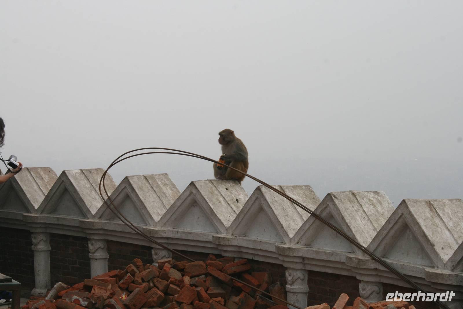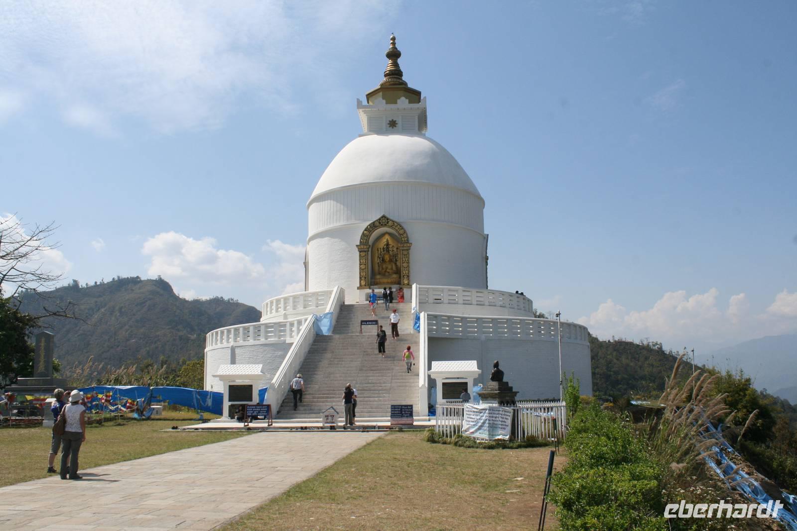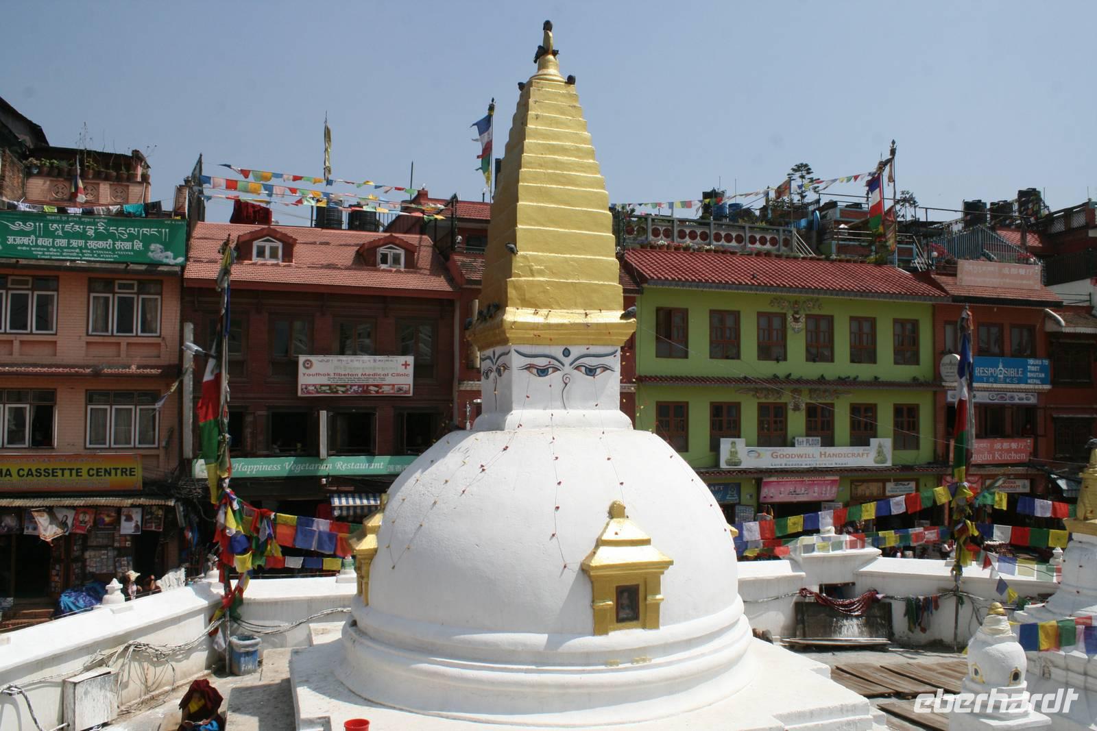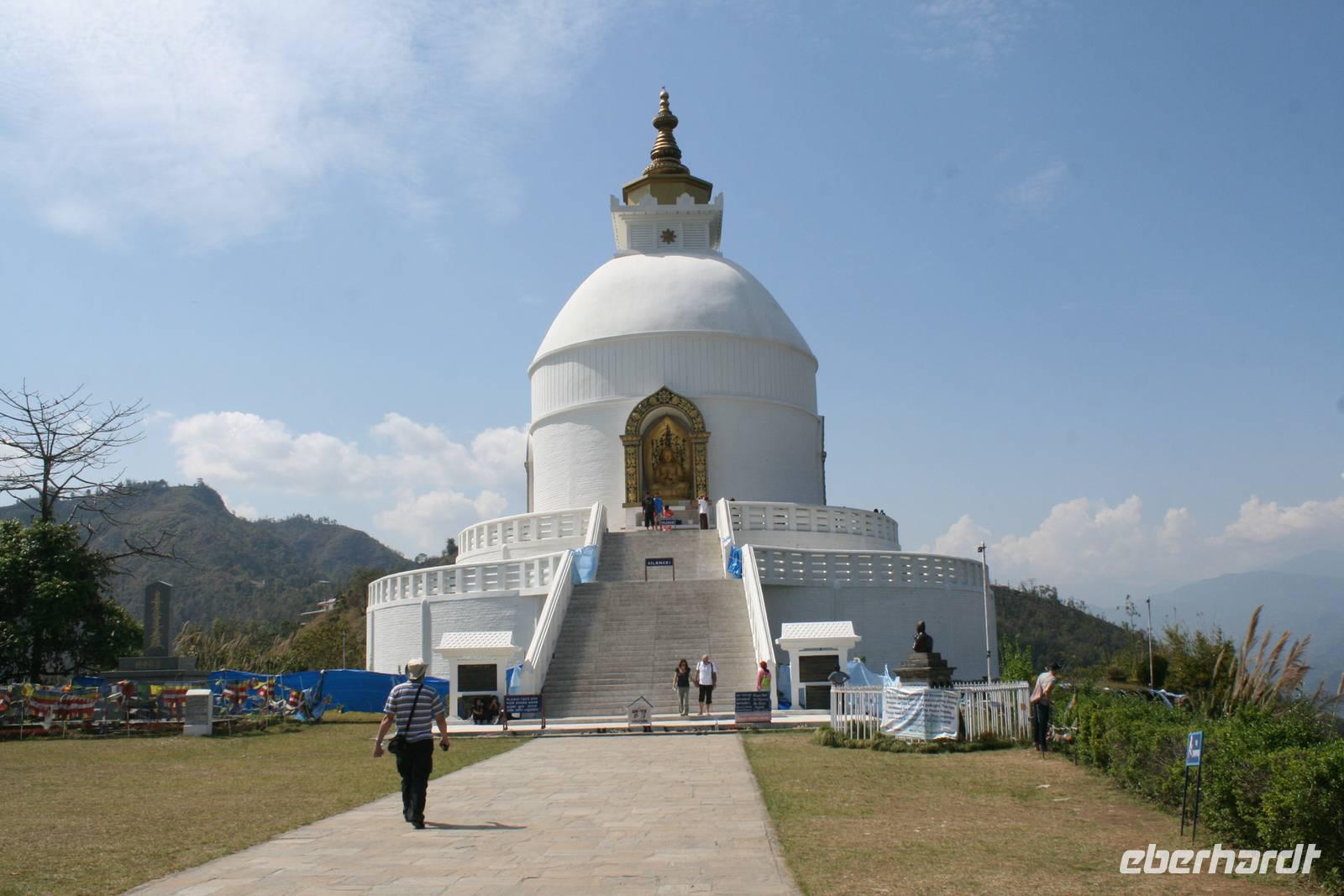 Heute müssen wir am Vormittag unser schönes 5-Sterne-Hotel in Pokhara leider schon wieder verlassen aber ein jeder genießt es auch heute etwas länger schlafen zu können. Am Vormittag packen wir wieder unsere sieben Sachen und begeben uns zum kleinen aber feinen Flughafen von Pokhara, denn heute geht es für uns zurück nach Kathmandu. Am Flughafen angekommen, erledigte Abi für uns die Formalitäten und wir ließen uns so während der Wartezeit noch einige Sonnenstrahlen auf der Terasse ins Gesicht scheinen. In Deutschland kaum denkbar, dass man aus einem Flughafengebäude auch rausgehen kann. Einige Koffer waren etwas schwerer als die erlaubten 20 Kilogramm aber dies wurde hier noch akzeptiert. Auch mit den Sicherheitskontrollen nimmt man es hier nicht so genau. So flogen wir mit einer Verpätung von etwa einer Stunde, aber für nepalesische Verhältnisse trotzdem noch pünktlich mit einer kleinen Bhudda Air Maschine nur etwa eine halbe Stunde zurück nach Kathmandu. Am späten Mittag hier angekommen, haben wir auch unsere Koffer wieder in Empfang genommen. Das Gepäckband war zwar etwas gewöhnungsbedürftig aber in Nepal geht alles. So fuhren wir zurück zu unserem schon bekannten Hotel und bezogen wieder unsere Zimmer. Später trafen wir uns wieder und spazierten gemeinsam zur Stupa von Bodnath, die wir mittlerweile schon ganz gut kennen. Abi hat hier ein tolles Restaurant mit Dachterrasse für uns ausgesucht und so genießen wir von hier auch einen tollen Blick auf das Treiben an der Stupa. Tradtionnell werden wieder viele Momos gegessen und Everest Bier getrunken. Den Nachmittag nutzt dann jeder indviduell um noch ein paar Souvenirs oder Postkarten zu erstehen. Einige nutzen aber auch die Zeit, um sich bei den Tempeln etwas näher umzuschauen und müssen feststellen, dass Sie anscheinend als Eberhardt-Gäste so arm aussehen, dass Sie nun schon zur Nepalesischen Tafel gehören und mit Nahrung versorgt werden. Was man nicht alles in Kathmandu erlebt...am Abend genießen wir ein letztes Abendessen im Hotel und natürlich einen anschließenden Drink in der bekannten Yak Bar, bevor wir am nächsten Tag weiter nach Bhutan, in das Land des Donnerdrachens fliegen.