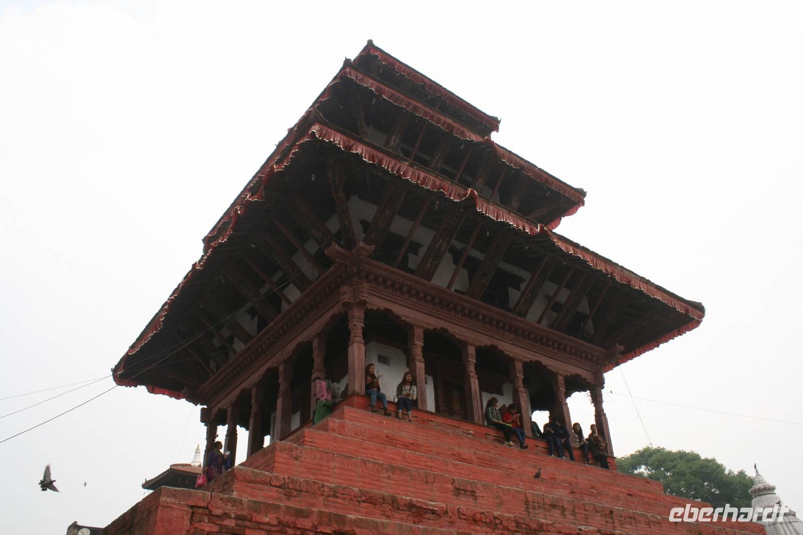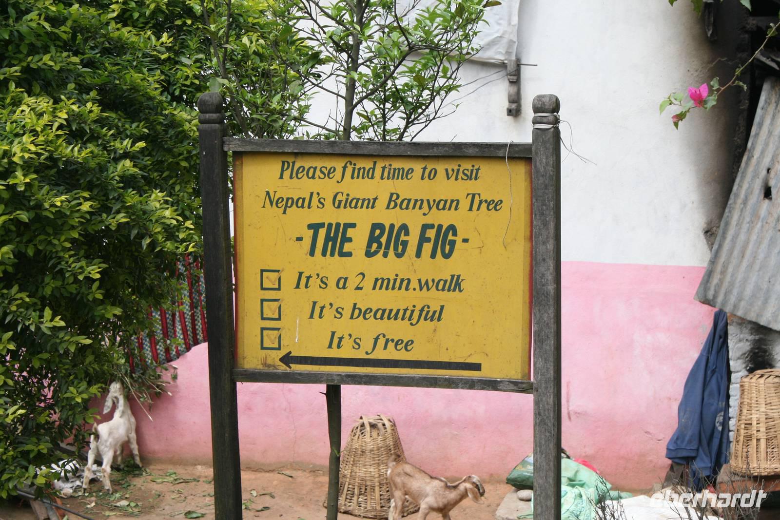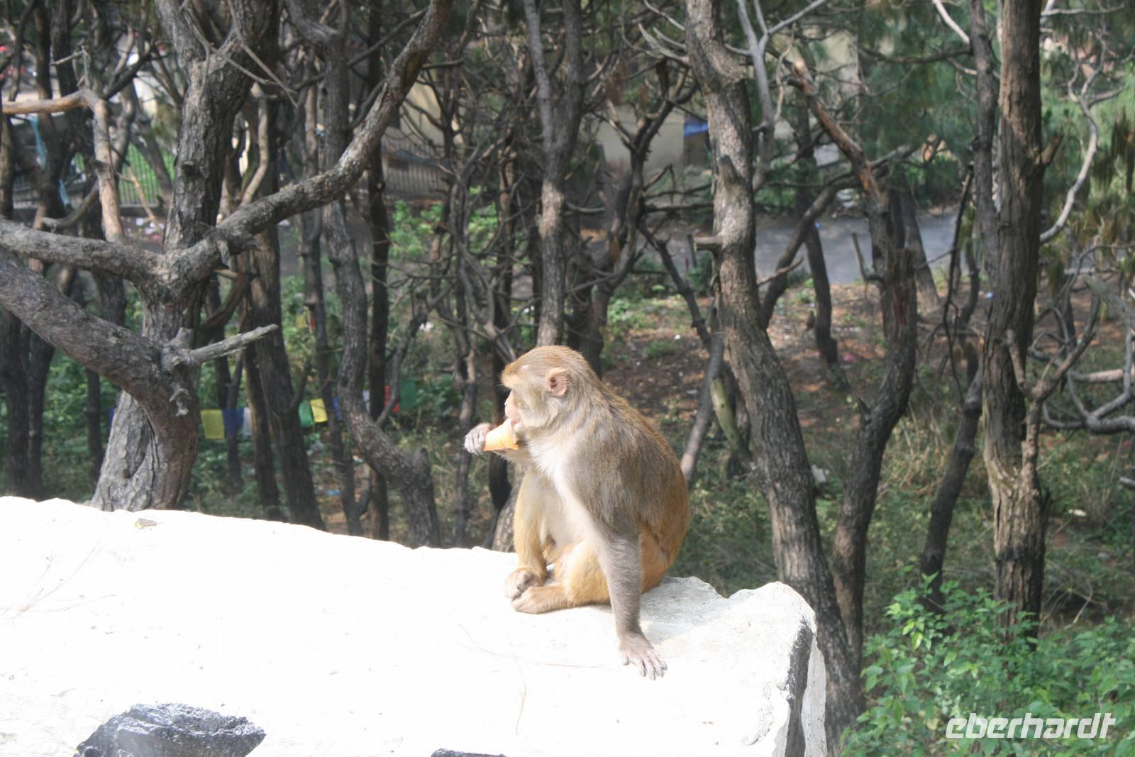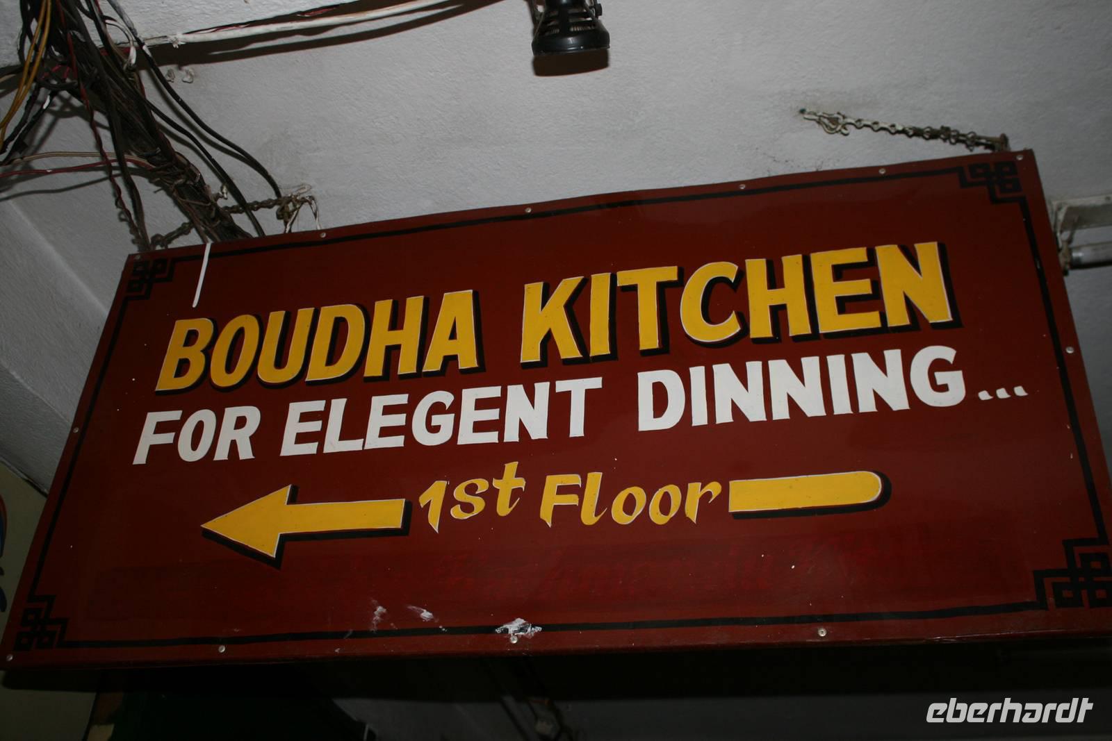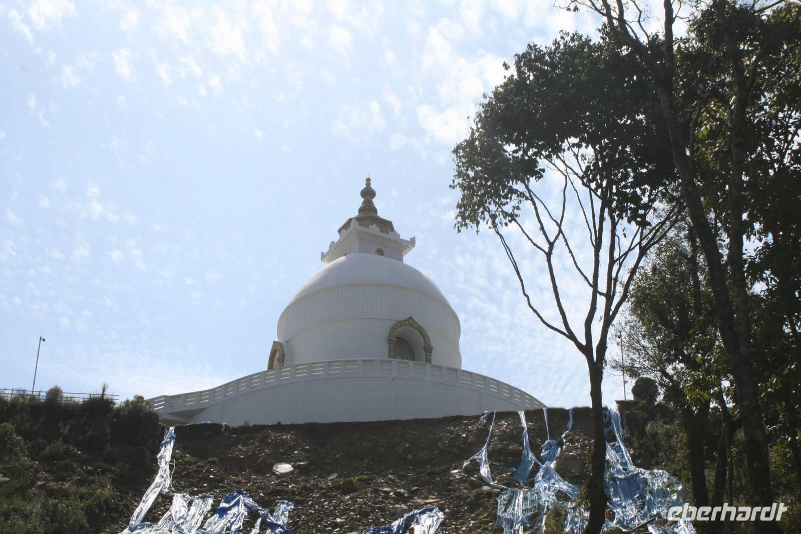 Heute müssen wir am Vormittag unser schönes 5-Sterne-Hotel in Pokhara leider schon wieder verlassen aber ein jeder genießt es auch heute etwas länger schlafen zu können. Am Vormittag packen wir wieder unsere sieben Sachen und begeben uns zum kleinen aber feinen Flughafen von Pokhara, denn heute geht es für uns zurück nach Kathmandu. Am Flughafen angekommen, erledigte Abi für uns die Formalitäten und wir ließen uns so während der Wartezeit noch einige Sonnenstrahlen auf der Terasse ins Gesicht scheinen. In Deutschland kaum denkbar, dass man aus einem Flughafengebäude auch rausgehen kann. Einige Koffer waren etwas schwerer als die erlaubten 20 Kilogramm aber dies wurde hier noch akzeptiert. Auch mit den Sicherheitskontrollen nimmt man es hier nicht so genau. So flogen wir mit einer Verpätung von etwa einer Stunde, aber für nepalesische Verhältnisse trotzdem noch pünktlich mit einer kleinen Bhudda Air Maschine nur etwa eine halbe Stunde zurück nach Kathmandu. Am späten Mittag hier angekommen, haben wir auch unsere Koffer wieder in Empfang genommen. Das Gepäckband war zwar etwas gewöhnungsbedürftig aber in Nepal geht alles. So fuhren wir zurück zu unserem schon bekannten Hotel und bezogen wieder unsere Zimmer. Später trafen wir uns wieder und spazierten gemeinsam zur Stupa von Bodnath, die wir mittlerweile schon ganz gut kennen. Abi hat hier ein tolles Restaurant mit Dachterrasse für uns ausgesucht und so genießen wir von hier auch einen tollen Blick auf das Treiben an der Stupa. Tradtionnell werden wieder viele Momos gegessen und Everest Bier getrunken. Den Nachmittag nutzt dann jeder indviduell um noch ein paar Souvenirs oder Postkarten zu erstehen. Einige nutzen aber auch die Zeit, um sich bei den Tempeln etwas näher umzuschauen und müssen feststellen, dass Sie anscheinend als Eberhardt-Gäste so arm aussehen, dass Sie nun schon zur Nepalesischen Tafel gehören und mit Nahrung versorgt werden. Was man nicht alles in Kathmandu erlebt...am Abend genießen wir ein letztes Abendessen im Hotel und natürlich einen anschließenden Drink in der bekannten Yak Bar, bevor wir am nächsten Tag weiter nach Bhutan, in das Land des Donnerdrachens fliegen.