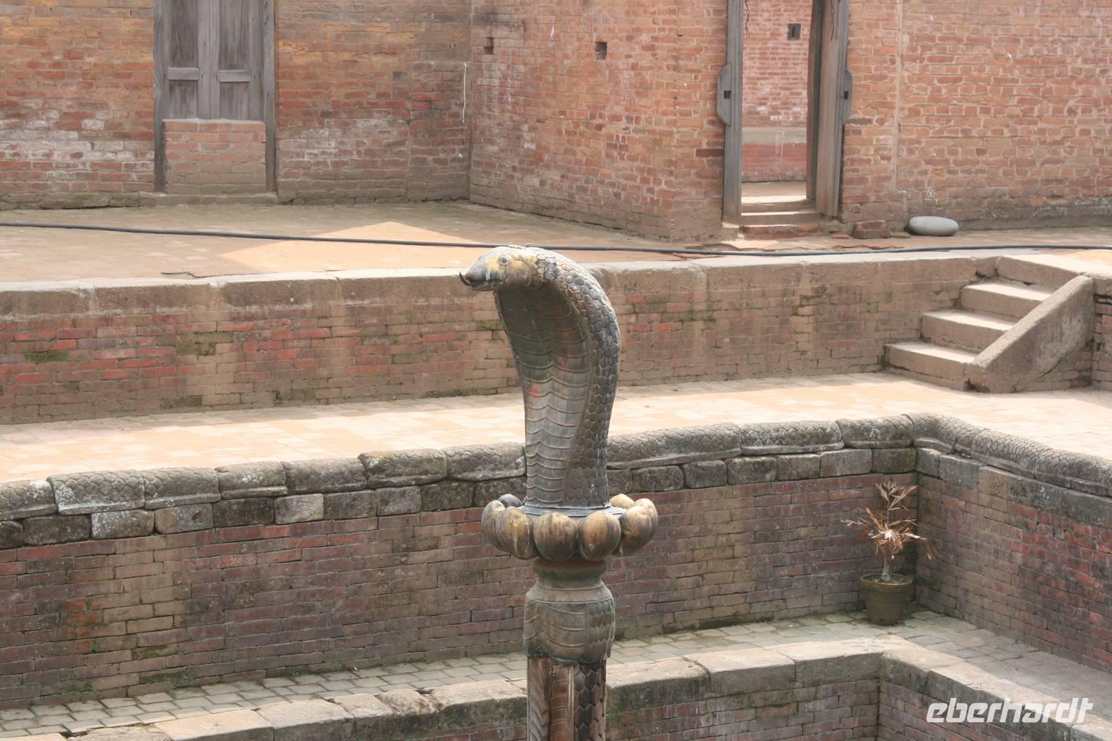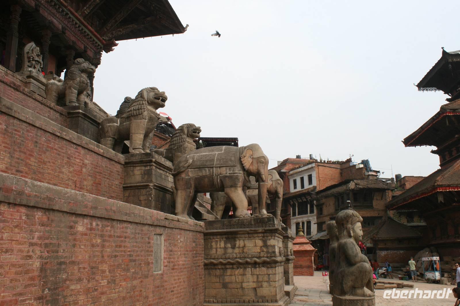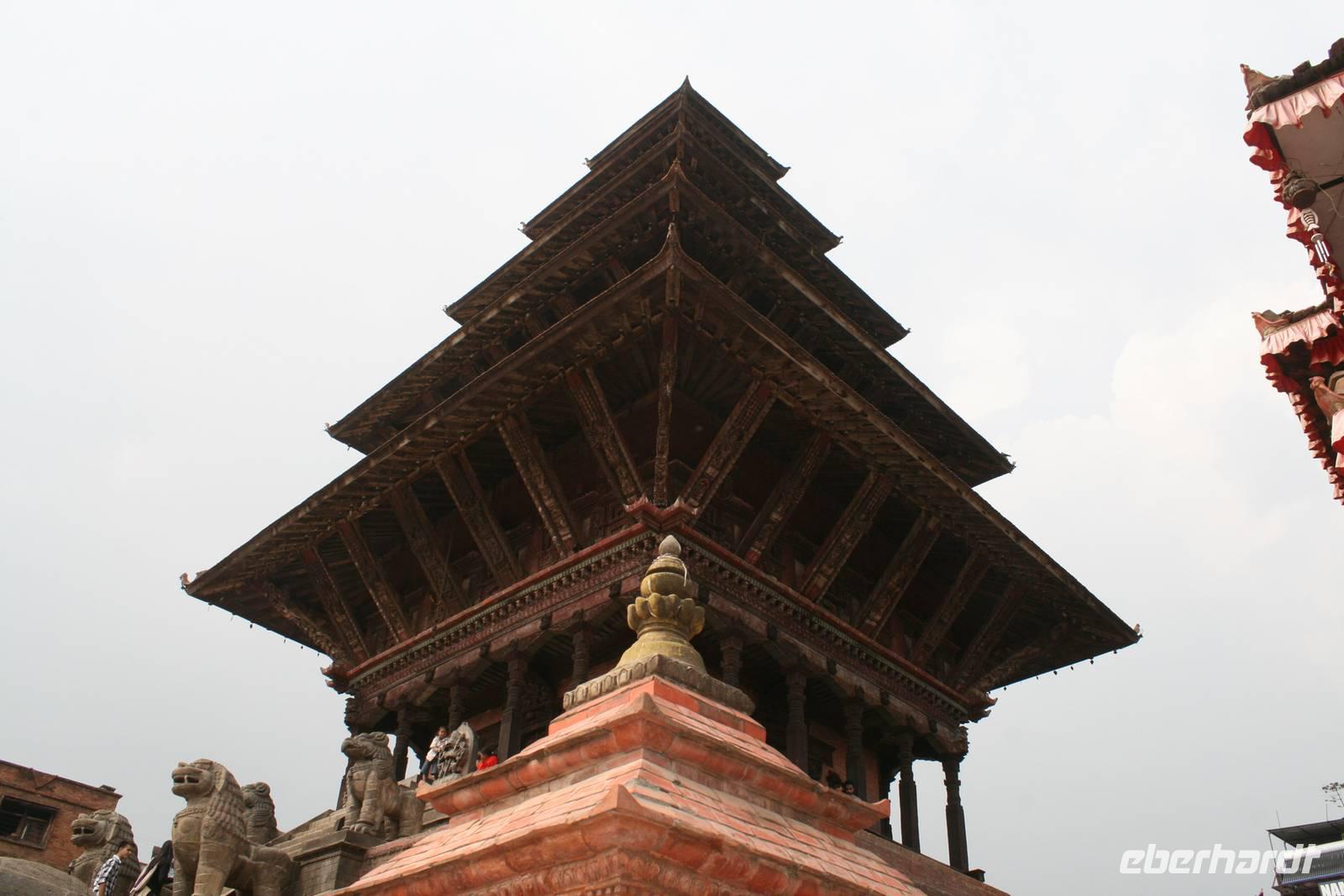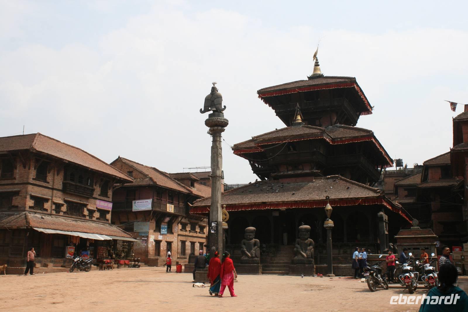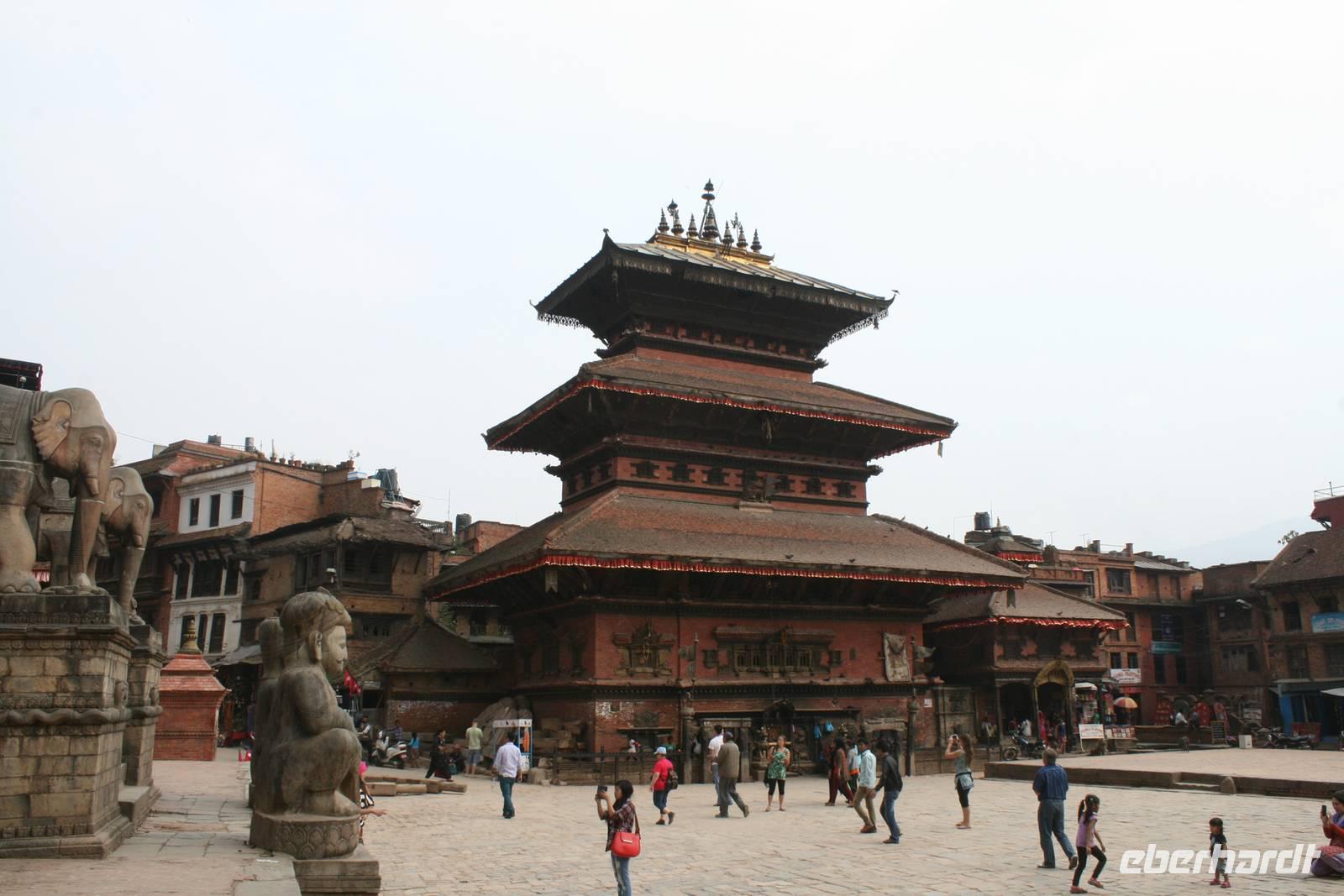 Heute heißt es schon früh aufstehen und Abschied nehmen von Bhutan. So verabschieden wir uns auch nochmals von Jimmee und unserem Busfahrer und hoffen uns vielleicht zu einem späteren Zeitpunkt noch einmal wiederzusehen. Am Flughafen angekommen sind wir dank der Vorbereitung der Agentur nun besser vorbereitet. Unsere Ausreiseformulare sind bereits ausgefüllt und so passieren wir die Passkontrolle problemlos. Mittlerweile sind wir das Fliegen auch schon gewöhnt. Am Flughafen warten wir geduldig auf unseren Flug und dürfen zunächst auch einsteigen in die Maschine der Druk Air. Aber aufgrund der Wetterbedingungen müssen wir uns noch etwas gedulden und unser Abflug verschiebt sich um eine Stunde. Aber wir wurden in dieser Zeit gut vom Servicepersonal versorgt. Während des Fluges genossen wir eine einzigartige Aussicht auf die schier unzähligen Bergketten des Himalaya und haben auch den Mount Everest gesehen. In solchen Augenblicken möchte man gern die Zeit für ein paar Minuten anhalten können. In Kathmandu zurück, werden wir wieder herzlich von Abi und den Fahrern in Empfang genommen und wie verabredet, wurden alle Postkarten verschickt und der Rum bereits besorgt. Man hört eben auf Herrn TRAVEL. In jedem Fall werden wir die Desinfektion hier auch wieder brauchen. So nimmt uns Abi mit und wir besuchen heute zunächst Bhaktapur. Die Königsstadt liegt am Fluss Hanumante und wie Kathmandu an einer alten Handelsroute nach Tibet, was für den Reichtum der Stadt verantwortlich war. Das Bild der Stadt wird bestimmt von der Landwirtschaft, der Töpferkunst und besonders von einer lebendigen traditionellen Musikerszene. Wegen seiner über 150 Musik- und 100 Kulturgruppen wird Bhaktapur als Hauptstadt der darstellenden Künste Nepals bezeichnet. Auch maßgeblich mit deutscher Unterstützung wurde dieses UNESCO-Weltkulturerbe erhalten. Alte Königspaläste, der Palastbrunnen mit der großen Bronze-Cobra, die Königsloge auf dem Durbar Square und zahlreiche Tempel und Pagoden prägen das Bild. Mit einem Bummel durch die engen Gassen gelangten wir zum Taumadhi Tole, dem bedeutenden traditionellen Platz Bhaktapurs, mit der fünfetagigen Nyatapola Mandir, einer der wenigen fünfetagigen Pagoden. In Bhaktapur essen wir heute auch zu Mittag. Nachdem Besichtigungsprogramm beziehen wir unser schon bekanntes Hotel in Kathmandu. Am Abend sehen wir uns alle wieder und genießen ein Abendessen vom Buffet.